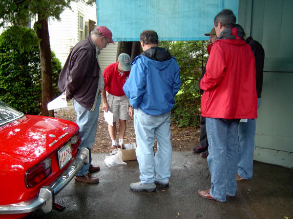A few of the attendees gaze into Frank’s box of Spica parts and tools