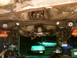 Then, in a moment of inspiration, Lon decided that maybe we could drive the bar out the back of the mount, which meant cutting the torsion bar off close to the mount's front side. After looking at the bloody stump protruding from the front of the unibody cross member, it was clear that, at this point, we were officially and irrevocably committed to removing the bar. If we did not get the stump out, we were going to look pretty funny racing a three-wheeled Milano. Even with as much motivation as we had, the human spirit can only take so much abuse and we called it a night.