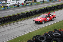 You know how they say that, when the going gets tough, the tough get going? Well, it may very well be true that necessity is the mother of invention. Earlier on, we had spoken in general terms about the fact that early GTV6s had a different mounting scheme for these bars, with a cast iron cross member that bolts up to the unibody cross member, and the bars were actually about 3" longer than the Milano bars. Brian had been in favor of trying to adapt that scheme to the Milano. I must admit that the whole idea scared me and I resisted it. Now, it looked like there was no choice. Brian scored a used GTV6 mount to screw to the back of the unibody cross member, and, with the longer bars held up to the Milano floor, it looked possible. On Wednesday night when the rest of the crew arrived, they set to. It was pretty ugly but, by gum, the idea worked. Yee-hah!!! Our car had four wheels again. Brian was sooooo pleased that his idea had worked. I was hoping the thing wouldn't fail and kill one us. Mostly, I was hoping it wouldn't be me. We set the final ride height and buttoned up the suspension. The last thing we did was to finish up the wiring for the lighting (the four $10 security spotlights that we bought at Home Depot). We all agreed that they were "awesomely" bright, and hoped we wouldn't get thrown out of the race for melting cars as we came up behind them. The car was loaded onto the trailer for a 10pm "shakedown" test drive in the Cisco parking lot and then the car was ready for its race car alignment. Last-minute check lists were made and items checked off, travel plans were made, and we were all on our way Thursday morning. Fortunately, Lon had a new travel trailer, so we would have a base of operations at the track. Greg and Brian trailered the race car. I can tell you one thing — it is a long frickin' ride to Nelson Ledges! We got in around midnight and secured a large "paddock" for the three Milanos. As we rolled in, in pitch darkness, the track side sign was lit up and displayed the following in crude lettering: "Welcome 24 Hours of LeMons Crap Cans". Aaah, we were home! Greg Sefarian rolled in around 1am. Mike Wrigley and Ian Anderson rolled in around 3am. It had been pouring all day and the paddock was muddy and soft, but we were all in, safe and sound. And cold. It was frickin' cold at night. Saturday night, during the race, it got down into the low 40s. Greg, Brian, and our race car came in about noon (they were smart and stayed at a local motel). One thing for sure — racing requires a lot of stuff. Our three-race-car compound had five trucks, five trailers, and one SUV. It continued to rain Thursday night and most of Friday. The paddock was a sea of mud — and cold. Did I mention that it was cold? Mike Besic and his team came in that morning with their GTV6 — and a whole drum of fuel. Once we saw their car go, we were pretty sure why they brought their own fuel...... It rained on and off on Friday. We worked on the cars a little. Tech inspection was scheduled for two hours starting at 5pm. Talk about dreamers — the LeMons "management" budgeted two hours to inspect 119 entries (cars) and approximately 595 sets of driver safety equipment (figuring roughly five drivers per car). Chinese fire drill is an understatement. I think it's safe to say that the inspections were, ummm, cursory. All of the Milanos passed tech without any penalty (been there, done that, knew the rules). The Besic team got whacked 50 BS factor penalty laps — the poor guys were done before they even turned a wheel. However, I don't think anyone had a better time than those guys. The 119 cars doubled the previous track record for an entry. Teams came from all over and included winners from many other LeMons races. It also became evident that the entry comprised heavily of real racers. The series' reputation for fun was drawing a higher level of competitor. The official schedule called for mandatory nighttime practice for all teams. As I mentioned, the track is very fast and not lit. I haven't even been on a track in a decade, and never in a race. Now, I'm on a track I've never seen, in the dark, and with a little rain thrown in for good measure, racing (don't kid yourself — practice was racing). Excellent! We made it through practice, car intact. All of us were extremely happy with the car. It seemed so much faster than the last time — the new final drive ratio really made a huge difference. We all agreed that there was nobody on the track we could not out-drag, or worst case run neck-and-neck with. The brakes were tremendous — really could out-brake everyone. In cornering, the car was unbelievably stable and seemed to have an unlimited amount of grip. It was balanced, smooth, completely linear and direct. The car could corner with anybody. I, for one, was really bowled over by the acceleration. I thought that the steering effort was high (with the power steering removed), especially when the front end loaded up in hard turns, but I was told to cowboy up and get on with it. We all were very excited by what we perceived to be our prospects. Conversations with the other Milano teams revealed similar expectations. We knew the drill. Preserve the car, minimize and shorten pit stops. Keep it on the black part, no red mist. Drive by the rules — don't hit anyone, don't go off, no passing under yellow — keep the car on the track, and eat up the miles and laps. This time, we felt we had the speed to do that and still keep up with the bad guys. The car had a few minor issues that we cleaned up.