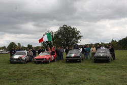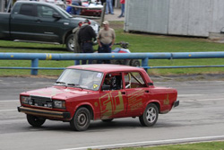 Then, just as I was really beginning to enjoy myself, disaster struck AGAIN! The engine quit in exactly the same place on the track. Another radio call, another push. More head scratching. Then Greg made the diagnosis: bad hall effect sender on the distributor. Quick distributor swap, the engine was renewed and I was back out on the track. Another twenty minutes lost. That last break seemed to be a turning point for me. I became more confident, more aggressive, faster even. I started driving into the corners harder, braking later, not moving over for anyone. On the gas earlier and harder. I started dive-bombing the other guys and, if they wanted by, they had to pass me the hard way. Not too many did. Now this was more fun! Those last twenty minutes on the track were a ball. The Besic crew set up on the footbridge over the front straight waving their giant Italian flag as the Alfas went by. I really enjoyed that. As luck would have it, when the checkered flag was waved, I happened to be behind the guys in the first two places. That was fun too! As everyone circulated the track on the cool-down lap, the corner workers and track staff lined up and waved as we drove past. Really a pretty cool thing. It was over. We had such high hopes and a really good start, but the unscheduled stops did us in and we finished 25th. Team Pro-Crass-Duh-Nation came in ninth in spite of their fuel problems. Their car was very fast and reliable. Outstanding job. Kevin Oliver's team, Scuderia Testa di Spillo, had their moments of excitement too, most of which I missed. They strove to drive a clean race, but stuff happens. Kevin got a penalty for two wheels off when he tried to avoid another car. The judges kicked him out of the car thinking he was overtired, but he was really just cranky because they didn't know what the penalty was for. He got another penalty that they had no idea about, so they sent him back out. Lots of time lost pointlessly. I guess I missed the best part whilst sleeping. During Kevin Oliver's night session, the isostatic shift linkage came apart. Stuck in one gear, he made it back to the pit. Mike Wrigley diagnosed the problem: the nut had come off the ball joint in the middle of the shift linkage. Nice. This part is completely hidden from all view, never mind access. To get at it, you have to drop the exhaust, drive shaft, the transaxle and the cross member. That method was not for Michael — hey, this is LeMons racing! While Kevin waited, strapped into his seat, Mike took the sawzall and cut down through the cross member and floor of the rear seat until he could get at the ball joint. He installed a new nut, verified actual shiftage, and sent Kevin back out. To top it all off, Kevin's teammate Chris suffered from a stomach bug during the last stint (thankfully) and his driver suit will never be the same. LeMons racing is not pretty. In spite of all that, they did really well. They were in first (momentarily, but we'll take it) after 5 hours, in the top 10 for the next 10-12 hours, dropped to 19th after the linkage repair, and then, driving hard, scraped back to finish 14th. Interestingly, the teams that gave us so much trouble at Stafford Springs (like the Kielbasa Kids Civic) were never a problem at this race. They were faster than us, but seemed to have lost their heads and spent a lot of time off the track in the penalty box. Interestingly, a club member happened to have some business dealings with one of the Kids' father. In the course of conversation, he mentioned that the Kids' business is selling Honda tuning parts — and there is nothing in their catalog that is not in that car. It is a real Frankenstein of mix-and-match parts from all the hi-po Hondas. No wonder the frickin' thing is so fast. I suspect that they are not alone in that mode of operation.