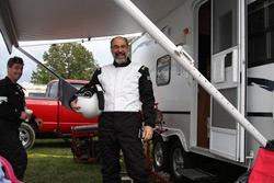 Brian went out for a double shift from midnight to 3 am. At about 1 am, he radioed in, panicking: "The hood is lifting up — missing hood pin on the driver side". Also, Brian reported that our "awesome" $10 Home Depot spotlights were absolutely F&&%*G useless. They were pointed up in the air, in the trees — in fact, everywhere but at the road. Plus, screw Einstein — the light seemed to stop about ten feet in front of the hood. The low light had really slowed Brian down. It turns out that it is difficult to drive real fast when you can't see. That took some time to fix and we sent him back out. My next stint was 3:30 to 5 am. Roused from my shivering slumber (did I mention that it was FRICKIN' COLD?), I was ready at the appointed hour. By then, I had accepted my reality of being a Ferrari club driver, got used to being dive-bombed and passed, and started to enjoy the race. I had my moments (I passed someone, I am sure of it), but mostly it was business as usual. Then disaster struck. About halfway through my stint, in the middle of the S turn leading to the back straight, the engine just quit. No cough, no stutter, just all quiet and dead. I figured it just got embarrassed and pissed off about going so slow. Radioed in, got pushed into the paddock. It was 4 am, and the sleepy crew was staring at a silent engine bay — now what? Wiggle this, wiggle that. Try it now. Pushed, poked, pulled off leads, reinserted leads. Try it now. Swap this, swap that. Try it now. Finally, miraculously, the engine started and ran strong and clean. Drop the hood and go. No one knew why it stopped and no one knew why it was working. No one expected me to make a full lap. The car ran like a train the rest of the night. I turned the car over to Kevin and it kept on running and running. Unfortunately, between the two incidents, we had probably lost close to 45 minutes. That, combined with Brian's midnight laps in darkness, pretty much meant that our race was over. I was scheduled for the last session. I actually got a little extra time because, about twenty minutes before my turn, Lon got caught up in a group spin and was black flagged. The penalty was a driver change. Fortunately, I had my suit on, but had to run back to the camper to get my helmet and gloves. That cost us more time, but we were near the end now.