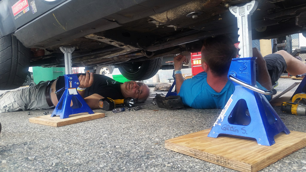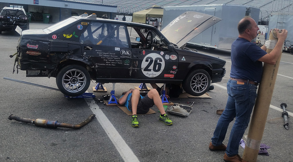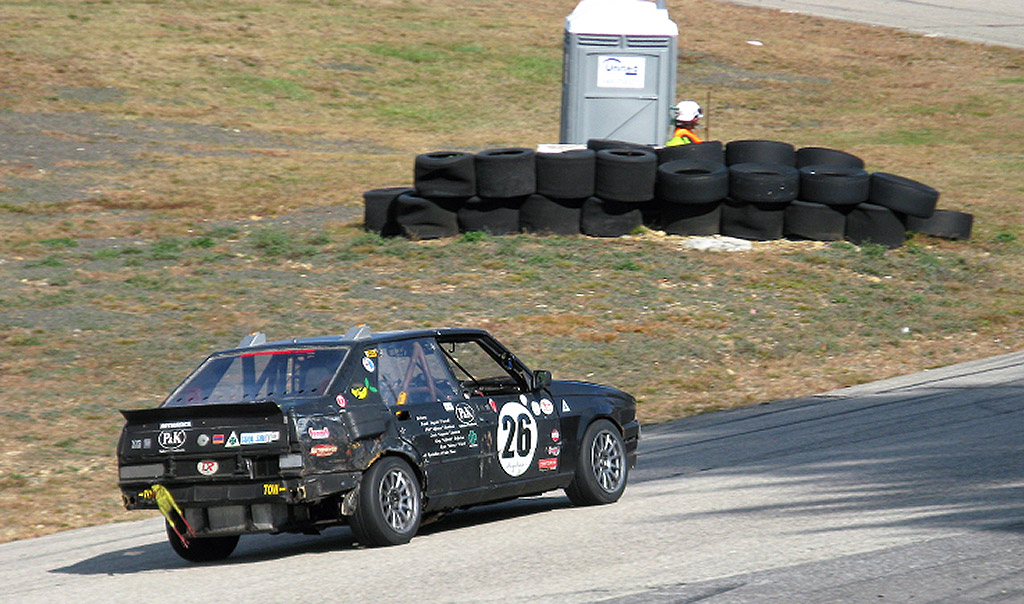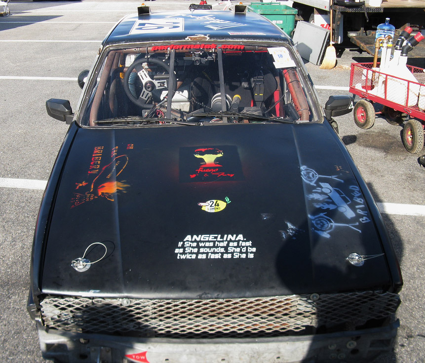 La Povera Angelina she did not have a good weekend in New Hampshire. After the horrible engine failure at Thompson, Greg had worked relentlessly to rebuild the engine in time for this race. He did not get a replacement cam shaft in time, so he plucked the cams out of his GTV6. On paper, they are a little less cam than he had originally, but still strong, and there is some data (as yet not completely analyzed) that this combo might make more power a little lower in the rev range than the old cams did; plus, it might not use as much fuel as the old setup. Nick went down on the Tuesday before and spent the whole day — until almost 9pm — helping to put the car back together. Ted and Frank helped Greg get the car ready to leave. The first disaster of the week happened before the car even got to the track. While leaving for the track in NH, Greg's tow truck developed engine problems. Back to the shop, transferred the car, tires, fuel jugs, and some basic equipment into Ryan's small trailer and pickup. Ryan and Ted were on their way to get to the track in time for tech inspection and a little shake-down practice (with the newly rebuilt engine). Hours spent trying to fix the truck yielded no results; they then gave up and rented a big box truck, which meant that EVERYTHING in the trailer had to be moved into the rental truck. It is truly hard to believe how much crap is needed to get through a race weekend. The trailer is big enough for two cars, and even with only one car it's packed so solidly that you can not walk inside it. It took hours of work to make the swap. Semi-secretly, everyone had the same thought: Maybe this got the bad luck out of the weekend ... maybe. Of course, as usual, we got a late start, but from almost the very beginning we were in first place. Ted was out first and he was hammering it. The only thing that worried me was that he was hammering it (he was not making too many friends on the track — he is pretty aggressive out there). He was in first place, but there were 4-5 other cars sticking on the same lead lap. As hard as he was driving, he was not making any distance on the field — a problem for later, maybe. Nevertheless, first place was first place. Next up would be Frank, who is quick but not in Ted's class (not many are). Then Nick was scheduled for the last part of the day, and he is in Ted's class, so we had high hopes for the day. We made a fairly slow driver change/fuel stop — not too bad though, and Frank was off. He held first place for quite a while and then I could see that he was dropping quickly down the standings. That is not good. I returned to the pit to find the car there. DAMMIT! Something in the drive line was making a horrible grinding noise. We found that one of the transmission mounts was broken, which allowed the box to move up dramatically under load and the drive shaft was grinding away on the drive shaft tunnel. We had a spare, but it took about two hours to change. There is no coming back from a two-hour stop, so from that point on, we were running for fun. Nick went out, picked up about twenty places, and had a ball. He said the car was fantastic. It was balanced, smooth, predictable, and stable. The power was great, the brakes were great. Even though the track was getting pretty slippery, you could put it anywhere on the track that you wanted and it would just grip and go. Phil went out first on Sunday and had an uneventful run. He picked up a few places, agreed that the car was fantastic. Then a leisurely driver change back at our setup and Greg was off. Since we were out of the race, he took his turn first as a test drive, but then changed to take-no-prisoners mode and started ripping through the pack. All was going well ... until the car failed to come around again. When he got back to the pit, he reported a broken drive shaft. It had been banging around quite a bit at the front, up by his feet — a little nerve-wracking. Needless to say, of all the things that could have gone wrong showing those symptoms, this was the worst one. The drive shaft had broken in two. Rent asunder, you might say. We got the bloody stumps out of the car (real easy to do when the drive shaft is broken in two, so we had that going for us) and were going to swap in a new one, but then found that all the pieces normally on the front of the drive shaft (and now missing from it) were firmly stuck in the flywheel. If we can't get that out, we can't get the new one in. FINITO. Fun over, time to start packing up for the trip home. This is a pretty rare failure (i think), and at this point it is still unclear why it occured. Angelina's engine is strong, but I doubt it is that strong! Perhaps it was due to the transmission mount failure ... perhaps not. Hopefully, we'll figure it out before the next race. (Click on the thumbnails below for a larger view, and then