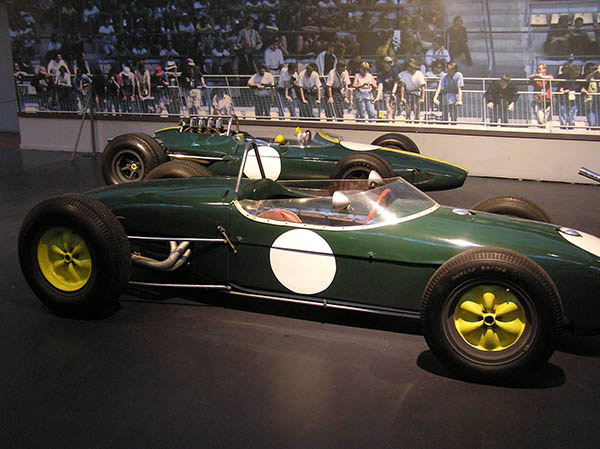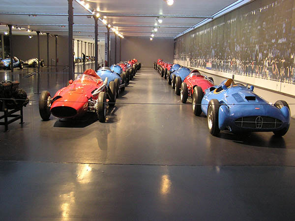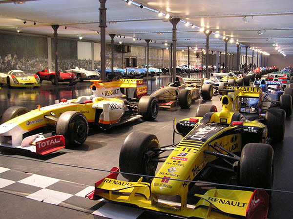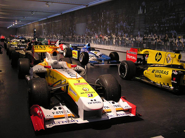 This section is further divided into open-wheel cars on one side and other race cars on the other. The open-wheeled race cars are divided into two sections aligned in two columns each as though on the starting grid of a race. At one end are the post-1960s open-wheel race cars, festooned with sponsors' markings. Behind them is the "starting grid" for the 1950s and early 1960s open-wheel racers, all painted in their national colors (French blue, Italian red, and British racing green).
