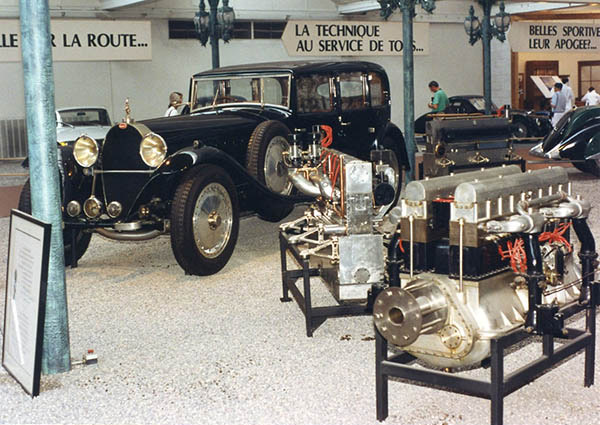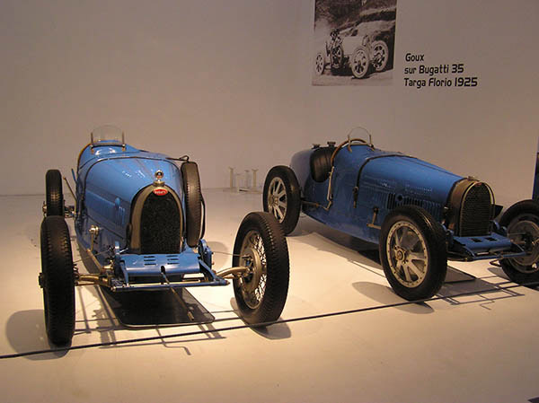 It allows for the incorporation of a restaurant (appropriately named the Atalante, after another famous Bugatti model), a cafeteria, a gift shop, and additional exhibition space. The collection itself has grown through acquisitions and gifts, and these later acquisitions include not just drool-inducing super cars but humbler but significant contributions to automobile history, like a 1971 Fiat 500 (the rear-engined 500 cc kind, not the new front-wheel drive 500 currently available at Fiat dealerships). The central display has also been re-thought. Partitions have been erected, and the original single, large exhibit hall has been divided into three parts. The middle section is devoted to the history of the automobile and includes the bulk of the collection, ranging from historic brass-era models, to that same Fiat 500, to French cars, like a Peugeot 205 built and acquired since the museum opened. The wall on one side of this central area is a mirror, which serves two purposes: as at the re-designed Alfa Romeo museum in Arese, it allows visitors to see both the front and the rear of the cars displayed, and it also makes the central display area appear as large as the single exhibition hall appeared prior to the renovation.
