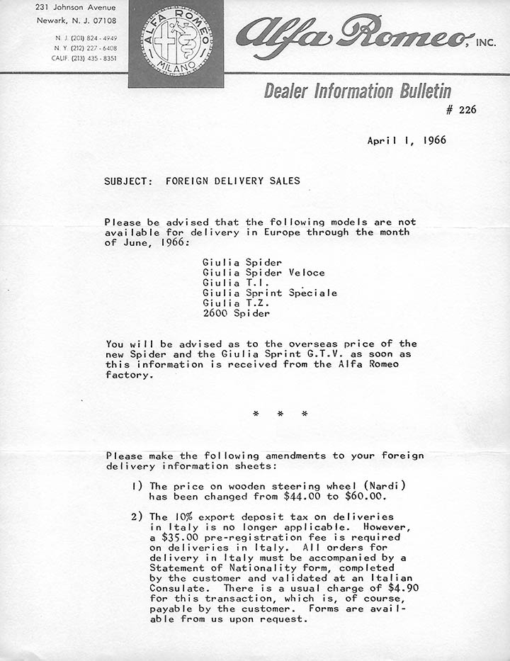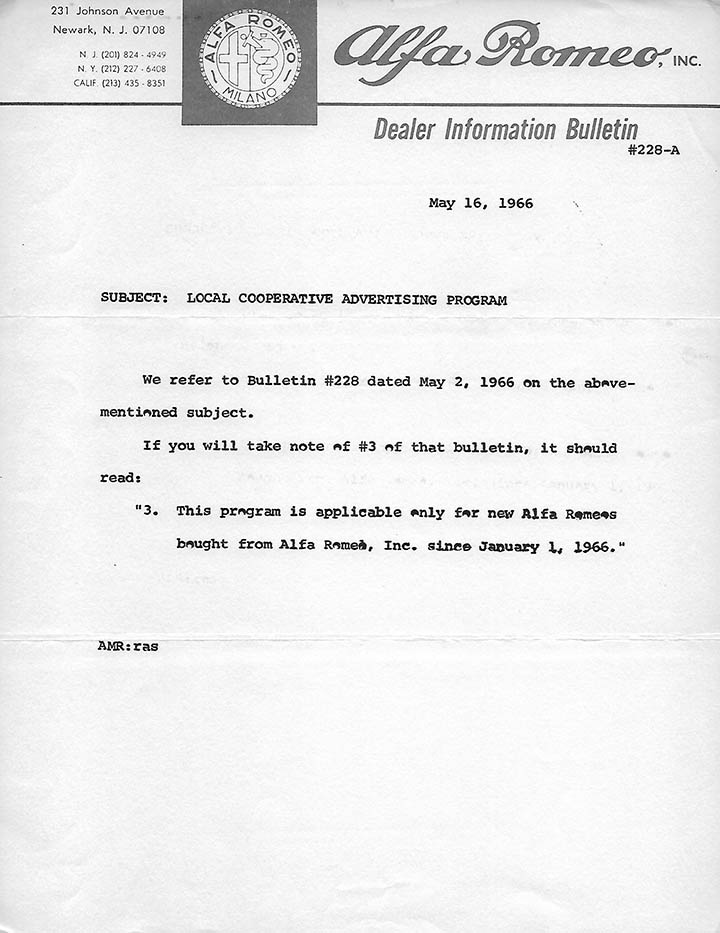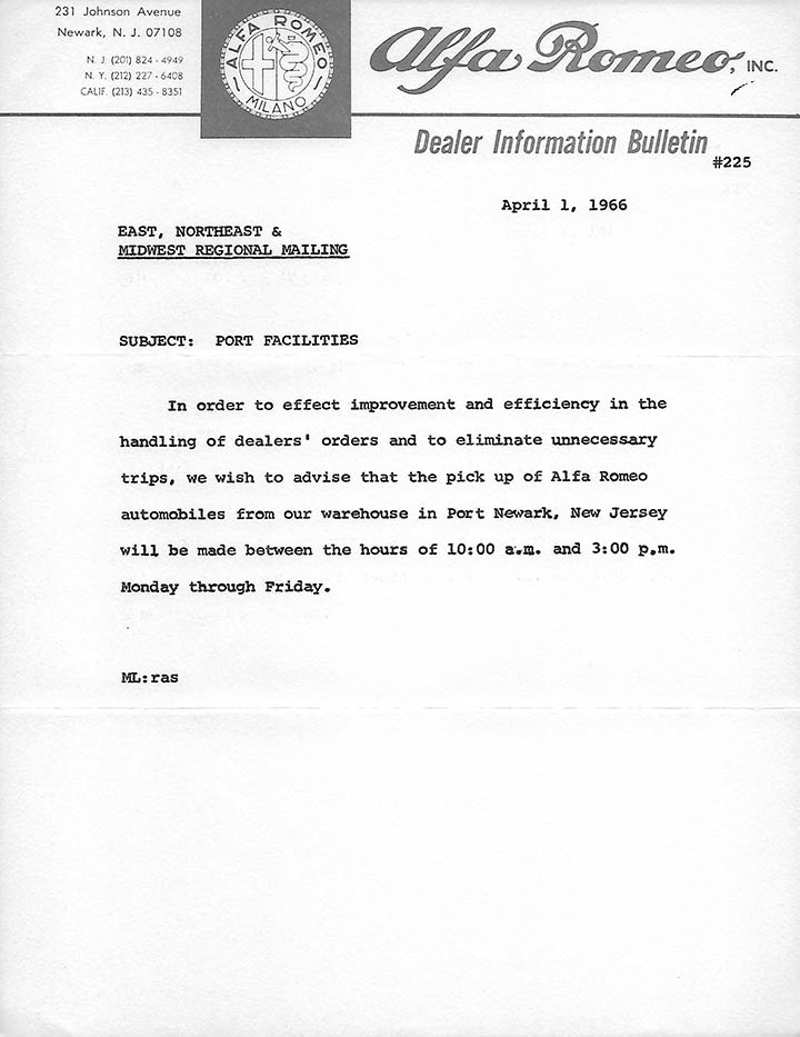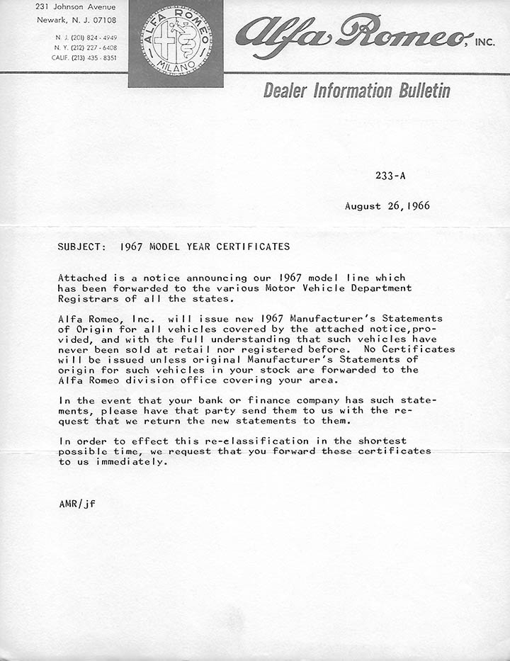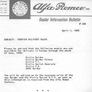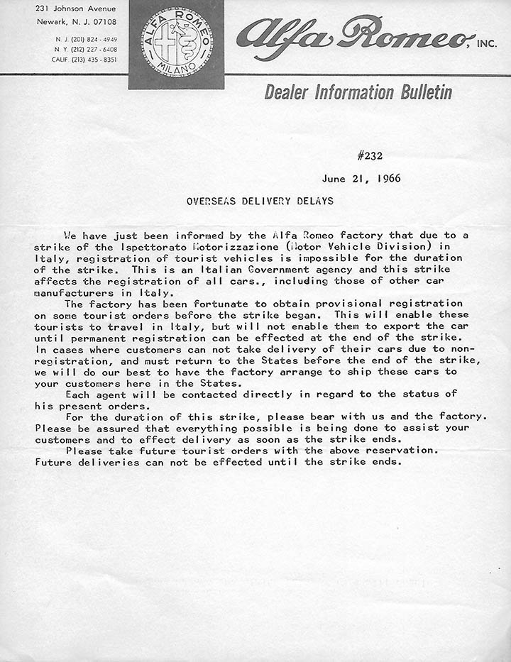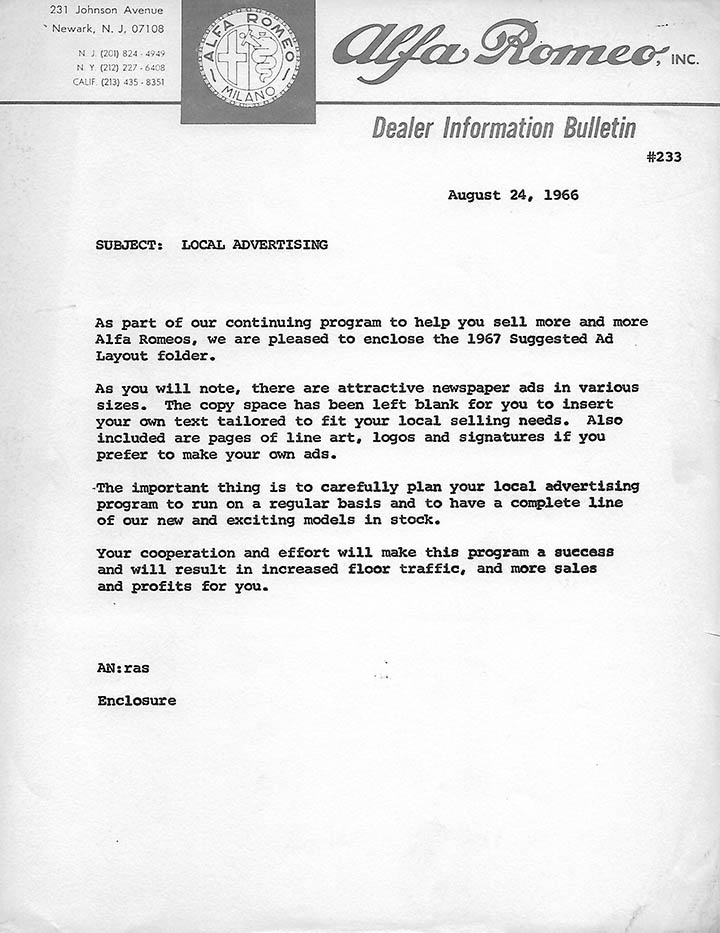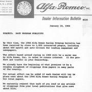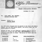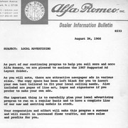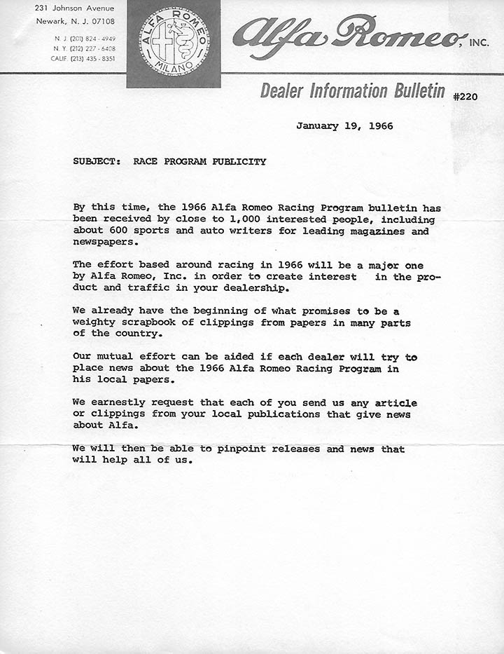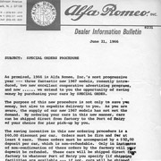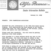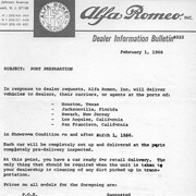 While cruising through eBay recently, I came across several listings for Alfa Romeo News and Dealer Information Bulletin sets. These listings were for 1962, 1963, 1964, 1965, and 1966. Since I own a Duetto, I purchased the 1966 set. I found them to be very interesting as they give you a sense of how Alfa was distributing and marketing their cars back in the glory days. Also, you can read about how to go racing with a little help from Alfa! These bulletins originated from the Newark, New Jersey, office and were meant for dealerships only. I hope that you enjoy reading them. This set is probably not complete.