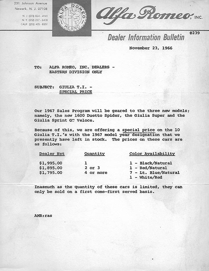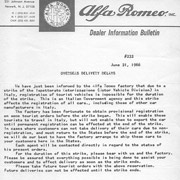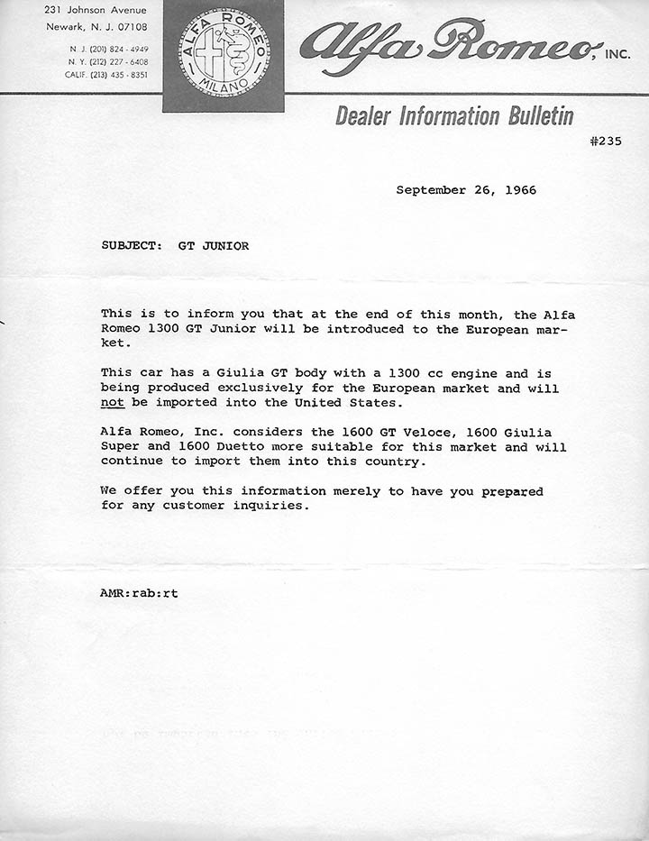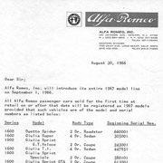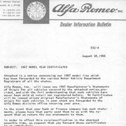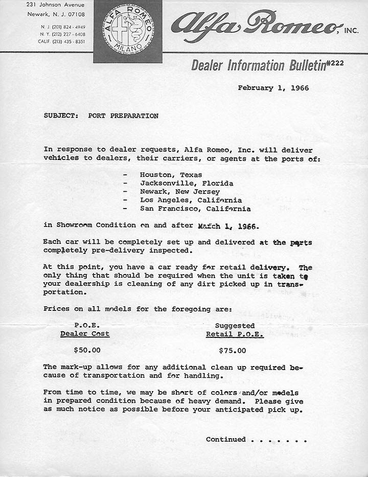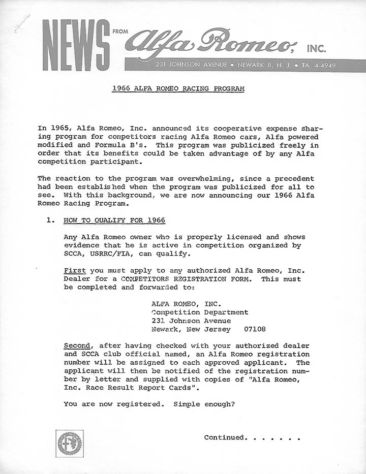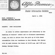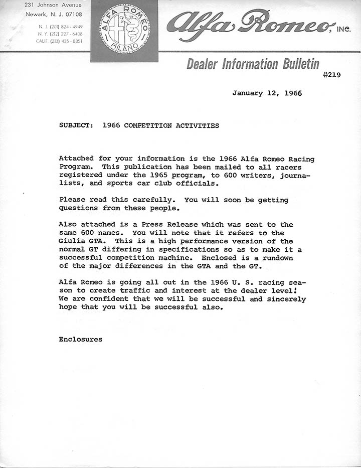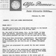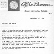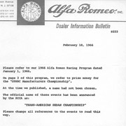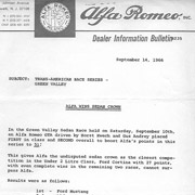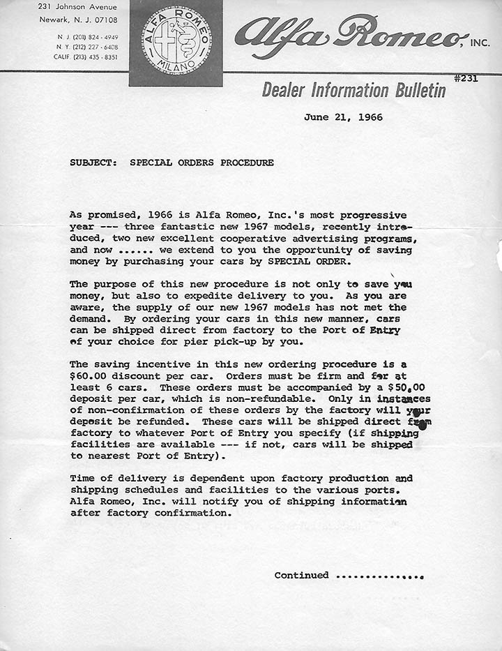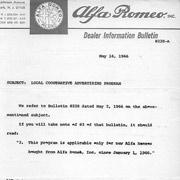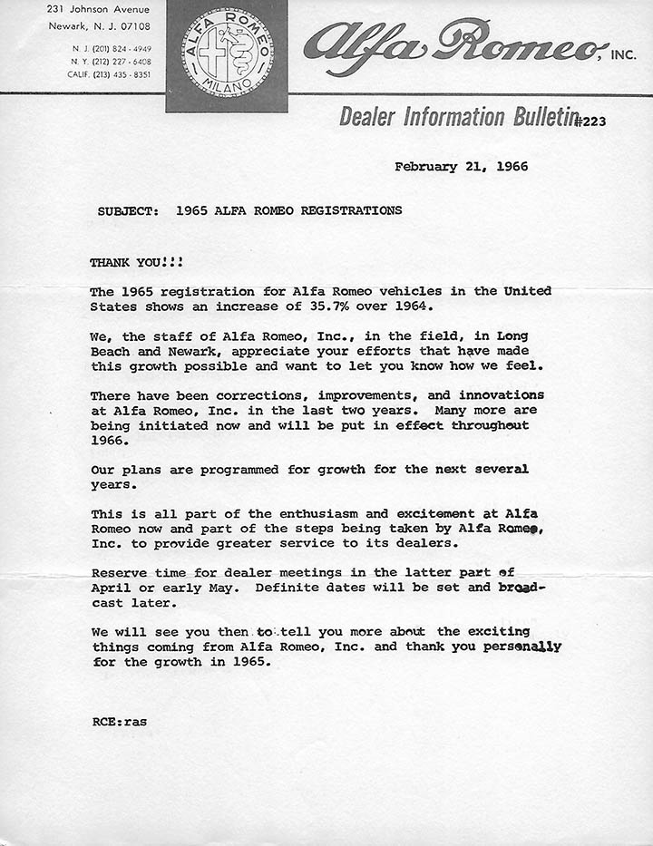 While cruising through eBay recently, I came across several listings for Alfa Romeo News and Dealer Information Bulletin sets. These listings were for 1962, 1963, 1964, 1965, and 1966. Since I own a Duetto, I purchased the 1966 set. I found them to be very interesting as they give you a sense of how Alfa was distributing and marketing their cars back in the glory days. Also, you can read about how to go racing with a little help from Alfa! These bulletins originated from the Newark, New Jersey, office and were meant for dealerships only. I hope that you enjoy reading them. This set is probably not complete.