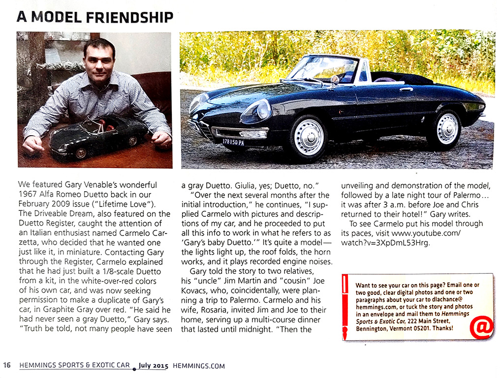 I told Joe that my wife and I would soon be heading for Florida, asking him to work on it when he could and that I'd be back at the end of May. In the interim, I contacted my pal in Sicily, Carmelo, owner of several award-winning Alfas, one being his beloved white-over-red Duetto. I was introduced to Carmelo through the Duetto Register, founded by Wille R. Carmelo had seen my car listed under "Duetto Colours". He was building a 1/8 scale model and wanted to do it in in my car's color scheme of Graphite Gray over Burgundy, which when completed was featured in "Sports and Exotics" (a now defunct Hemmings publication). Carmelo had said that he wanted his model to be different and that he had never seen a gray Duetto. He then added, "Italians hate gray cars". (Be sure to click on Carmelo's picture at the bottom of this page to get story of the Gary's baby Duetto.)