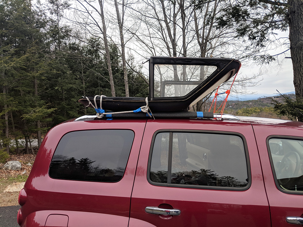 Steve and I decided on a date that I was to pick up the top; my only thought was how to get it home. I measured my cloth top knowing that the hardtop would be slightly larger and determined that it would not fit inside my 2006 Chevy HHR , but would need to be on the roof. Fortunately, the little Chevy has roof rails, so no problem.