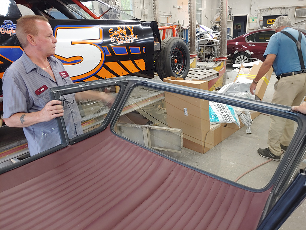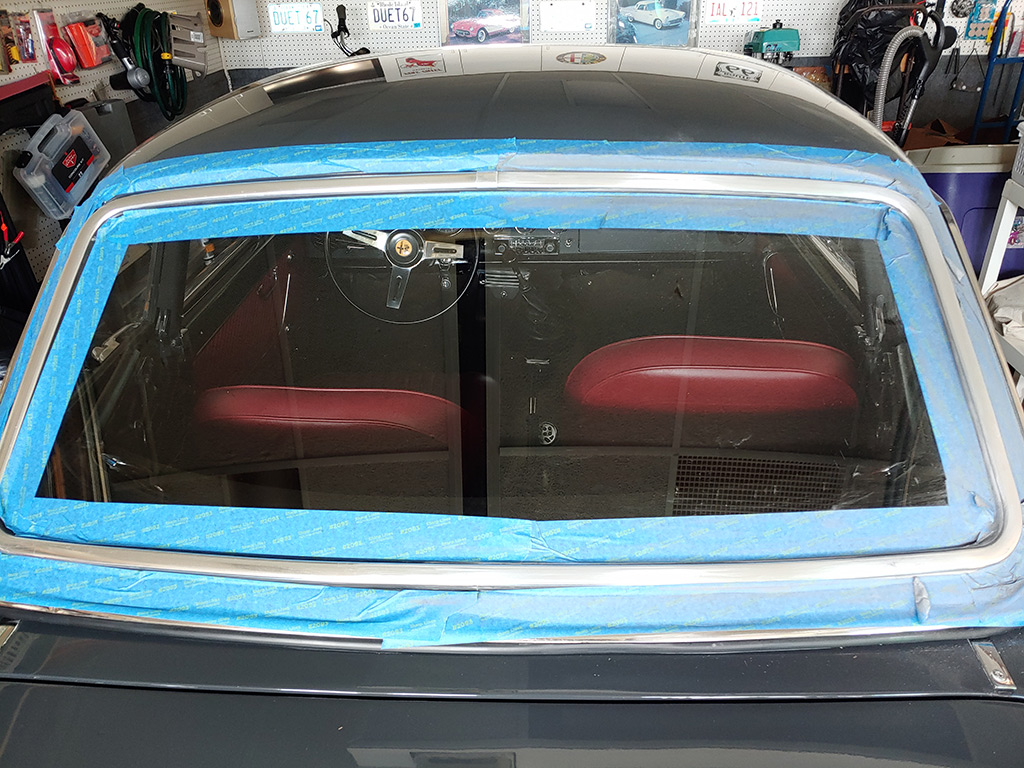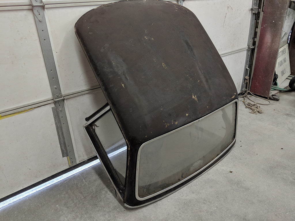 When I returned at the end of May, not a lot had taken place, which was understandable due to Covid and Joe having to work with a skeleton crew. I took the stainless trim and the plastic pieces home to refurbish them in my garage. The stainless trim pieces were scratched and several of the plastic interior pieces were broken, but all there! I cleaned up the stainless the best I could and the broken pieces of interior trim I glued together with Gorilla Glue, sanded and then painted with Krylon black plastic paint. The windows were also removed and, unlike my Parrish Plastics hardtop of years ago, the windows were safety glass, not plexiglass, adding to the heft of factory top.