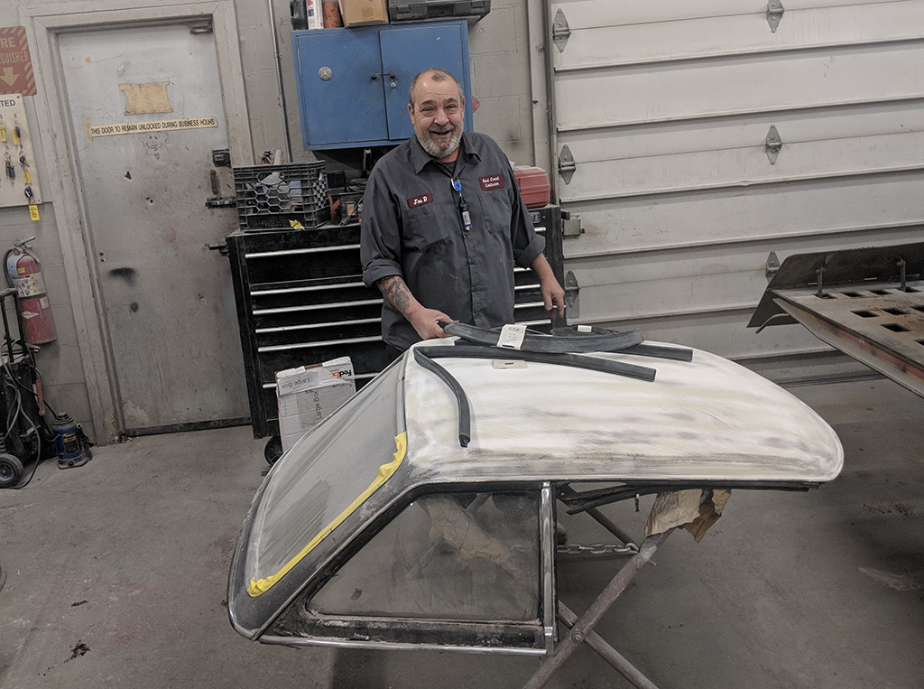 I drove off and noticed rattling on my trip home, and discovered that one of the latches had come unlatched. I felt there was something missing on the leading edge of the top ... like a gasket, maybe? I went back to the body shop and we took off the top and, sure enough, there wasn't a gasket, but none was provided by the vendor in Italy. However, I had a pretty good idea what would work and I had that in my garage. The next day, I drove back to Joe's and showed him the gasket material. He said, "Can you come back tomorrow? I have a couple of people out sick — Covid". I said, "Joe, this won't take but a few minutes — Scotty and Jimmy can help", and they did. Within 15 minutes we had top off, gasket put in place and returned to car, and off I went with no rattling and the latches stayed firm.
