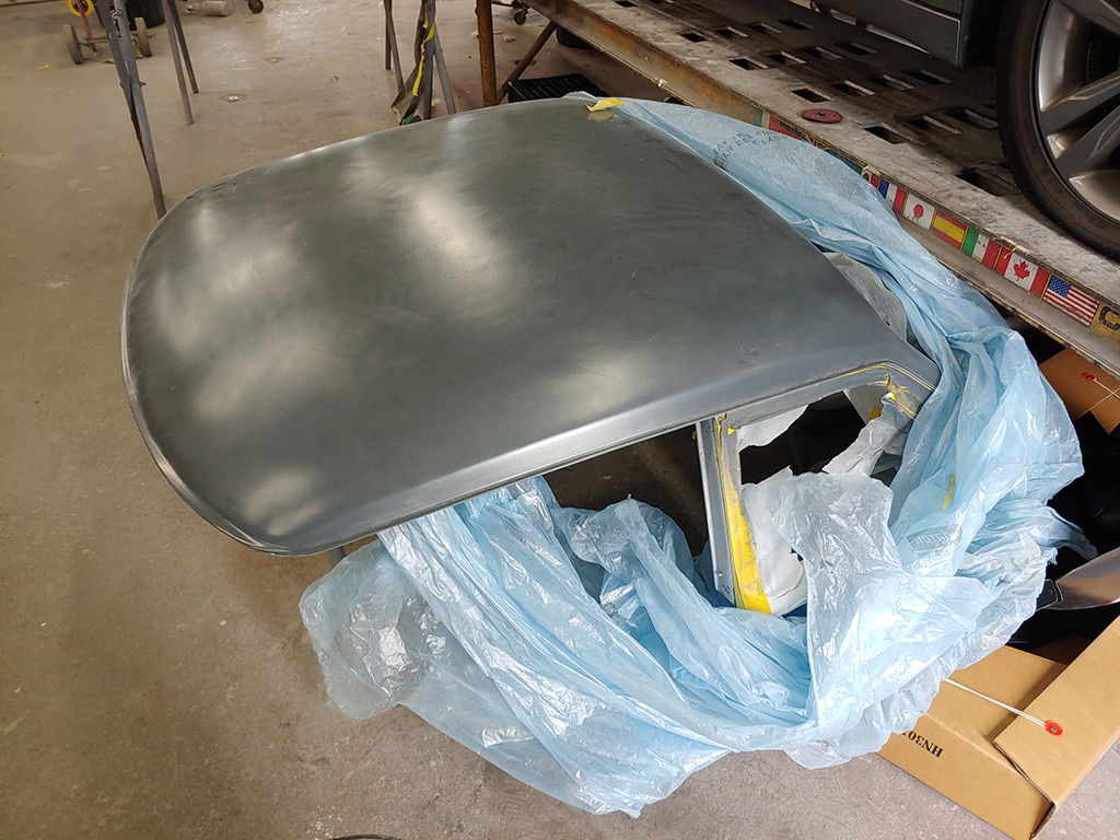 I arrived late in the day. Joe was all smiles when I showed him what I hoped would be a project he would take an interest in. He said, "I consider it an honor." I then outlined what I envisioned for the hardtop: repair and smooth the top, and painting it the same Graphite Gray as the body. Joe inquired, "What are you thinking for a headliner?" I said that I'd have that done by my upholstery man, Ray Tkacs in East Providence, RI, who has done all my work for over 40 years.