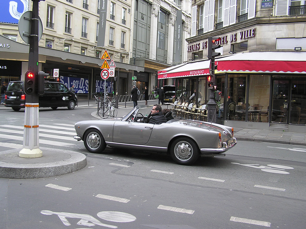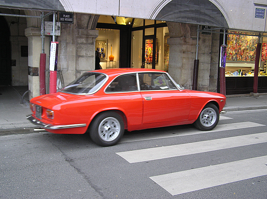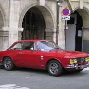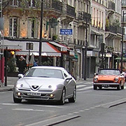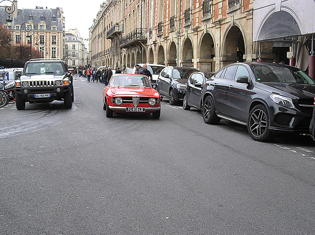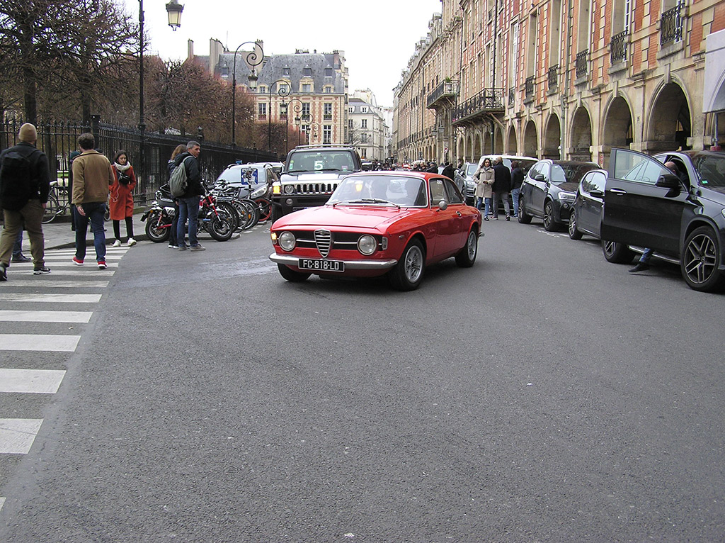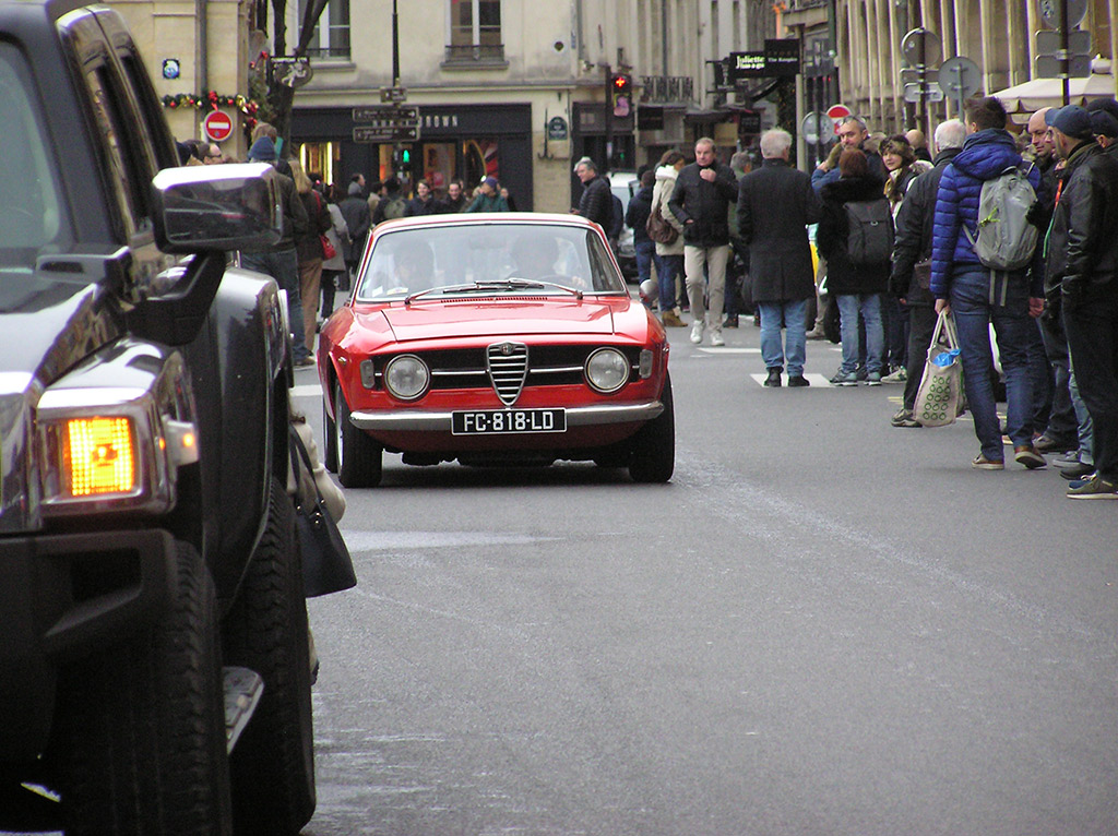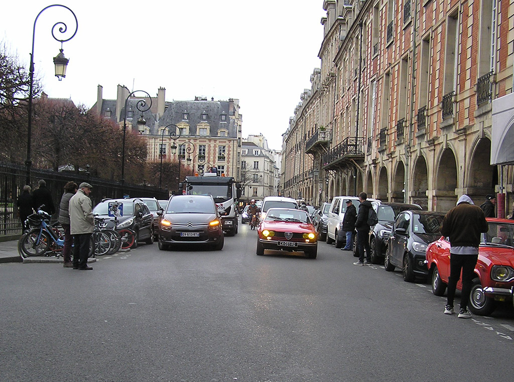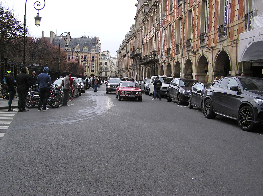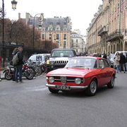 Vincennes en Anciennes is a classic car club open to all marques, and, according to its web site, it is the largest such club in France. The club is best known for its organization of the Traversée de Paris (Crossing of Paris), which occurs twice annually, on the second Sunday of January and the first Sunday of August. The Traversée unites some 700 classic cars (all at least 30 years old), and these cars spend the morning crossing through Paris, driving around or past a selection of its more famous monuments. These 700 classic cars are mostly French, German, British, or Italian, although a significant number of American muscle cars (mostly Mustangs or Corvettes) also participate. Italian cars were well represented in this January's Traversée. There were some Fiats (primarily 124 Spiders and X-1/9s), some Vespas, and an Autobianchi A112. A 1980s Ferrari Testarossa drove through one of the landmarks on the route, the charming, 17th-century Place des Vosges, past a lovely Fiat Dino coupe parked there, but it was not clear if either was actually a registered participant in the Traversée (as neither displayed a registrant's Traversée dashboard plaque). Italy, in fact, was represented most of all by Alfa Romeo, and mostly by 1960s and 1970s GTs. Three generations of spiders were represented: a lovely 101 Giulietta Spider, a 1600cc coda tronca 105 Spider, and a 916 Spider (all driven top-down on a brisk, gray, January morning). But most of the Alfas were either Alfetta GTs (all with the lovely European-style bumpers that make these cars so much finer looking than US-market Alfettas) or variants of the model first sold in the US as the Giulia Sprint GT and which the French usually call a coupé Bertone (the US "GTV" denomination reflects the fact that from 1969 to 1974 only top-of-the line 105 coupes were imported, whereas throughout their longer European run, these cars were offered with a choice among four engine sizes, ranging from 1300, to 1600, to 1750, to 2000 cc). Two of these, a 1300cc GT Junior and a 2000cc model, parked for a while in the Place des Vosges and drew many admirers among both spectators and passers-by. For both participants and spectators, the Traversée is a wonderful opportunity to see rolling automotive history. The Traversée is not a parade; classic cars negotiate the city's streets and its present-day traffic (thankfully a bit lighter than usual on a Sunday morning), much as many of these cars did three or more decades ago. The sight of, say, a classic Mini or an early 1970s Alfa GT winding its way around a timeless setting like the Place des Vosges transports one back in time to those earlier decades, to a time when most cars were mechanically simpler and did not look too much like all the other cars, when the sight of a Mini-Cooper or a coupé Bertone parked at the curb or taking off from a traffic light was not that rare but still exciting. [AONE European Correspondents Peter Walker and Meg Anderson are currently on assignment back in the Old Country for the first half of 2020 (poor souls). We hope that they'll be filing more Alfacentric reports for us during their stay! — Ed.] (Click on the thumbnails below for a larger view, and then |
