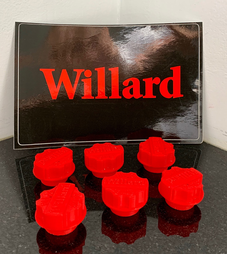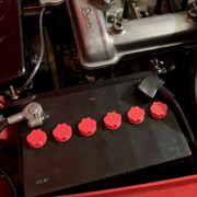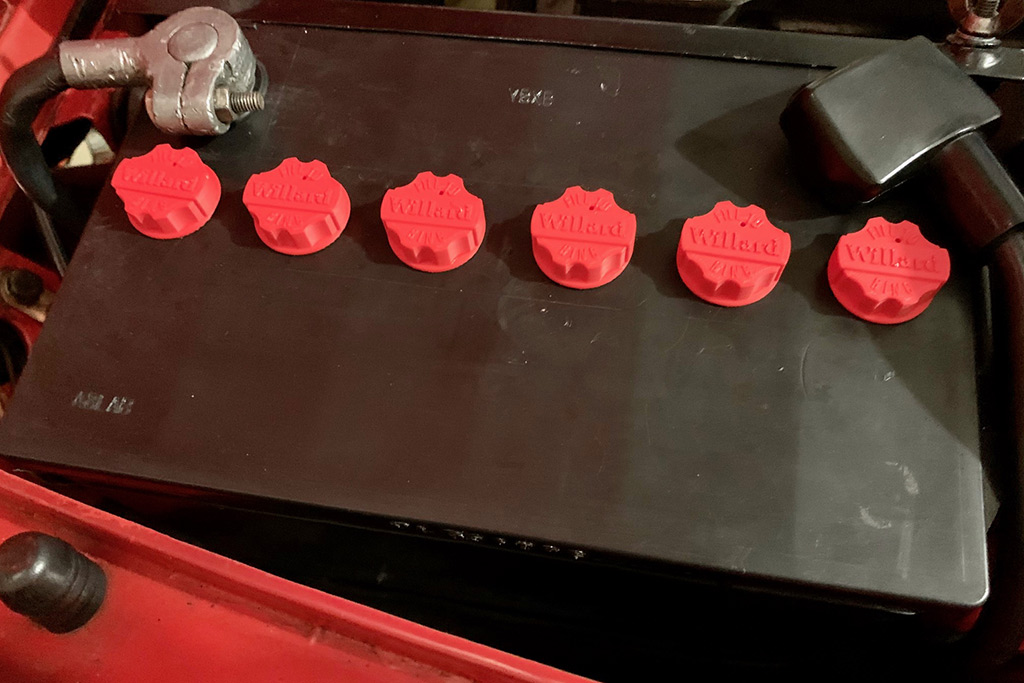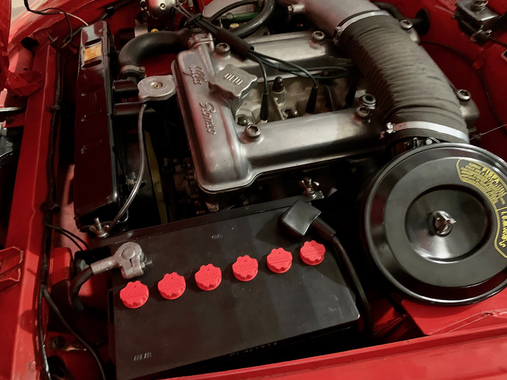 I recently came across a cool product on EBay. They're vintage-style battery caps that fit most new-style batteries. They are made in Belgium by Weskcar, and kits include 6 caps (which fit 19mm holes), a battery manufacturer logo sticker, and instructions. The covers just snap into place and are properly vented. Kits are available for Delco, Willard, Motorcraft batteries and more. No Italian makes yet! Many 1960s Alfas came with an Italian Safa battery, with probably red caps as their corporate color is red. I used the Willard style. I like the look better than the lime green Interstate or the Eveready-looking Optima. The battery (for my 1967 Duetto) that I used for the caps is a new Interstate that came with a black case and rectangular press-on caps. The price is about $26 with shipping, and they took about two weeks to arrive. (Click on the thumbnails below for a larger view, and then |