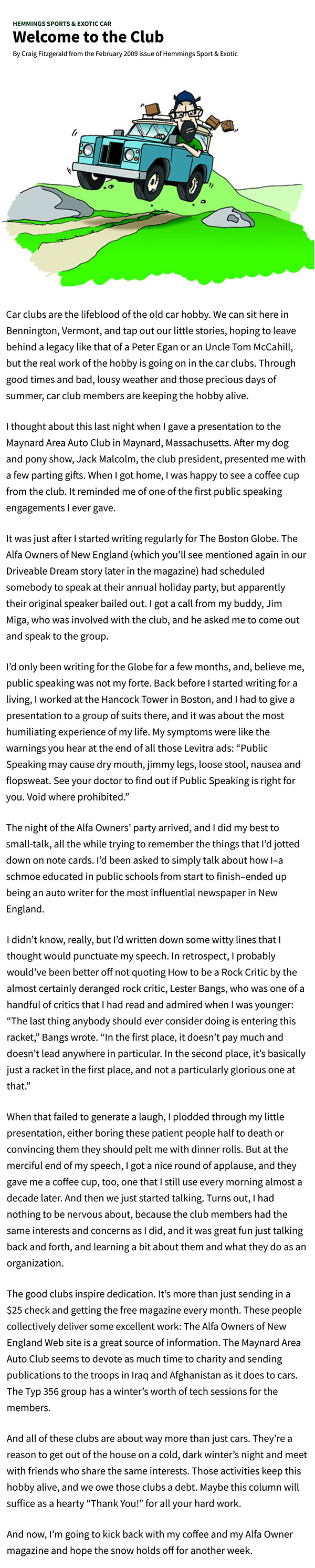 No, you didn't miss it! There was, in fact, no AONE Winter Pot Luck party this year, due to the difficulty in finding a suitable venue to replace the Tavern in Weston, and then ... well, you know. But Jim Miga happened to dig up a 2009 article in Hemmings Sports & Exotic Car magazine written by Craig Fitzgerald, a renowned automotive writer for Hemmings and the Boston Globe. Craig was the featured guest speaker for our 2002 (!) Winter Pot Luck, and his article was a reflection on the experience (and cast our club in a good light). You can read it below! You might also be interested to revisit our report from the Pot Luck Party. This was 18 years ago, folks, and you may or may not recognize the faces in the photos! It was also the evening that Brian Shorey first presented the idea of hosting the 2004 AROC National Convention to the club! How time has passed us by ................