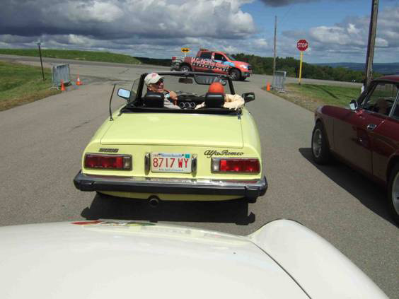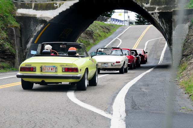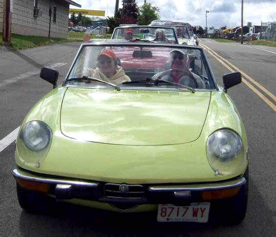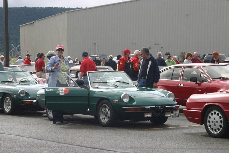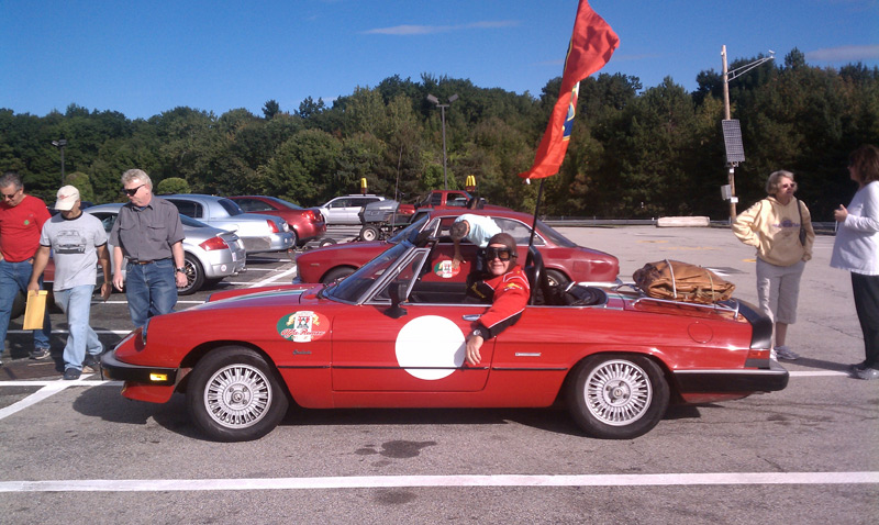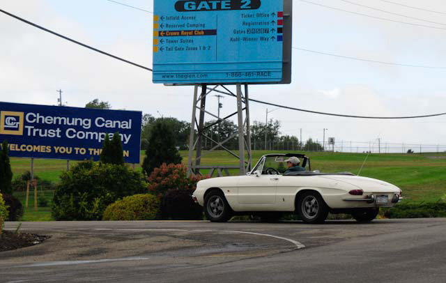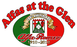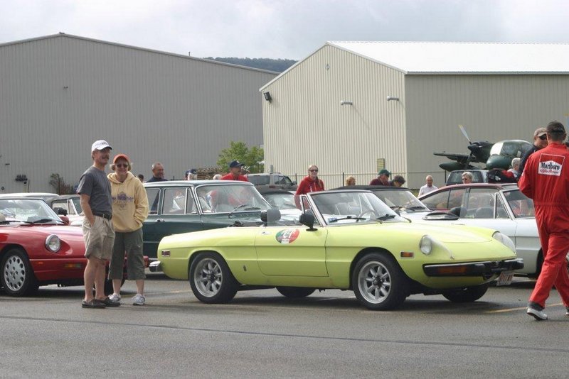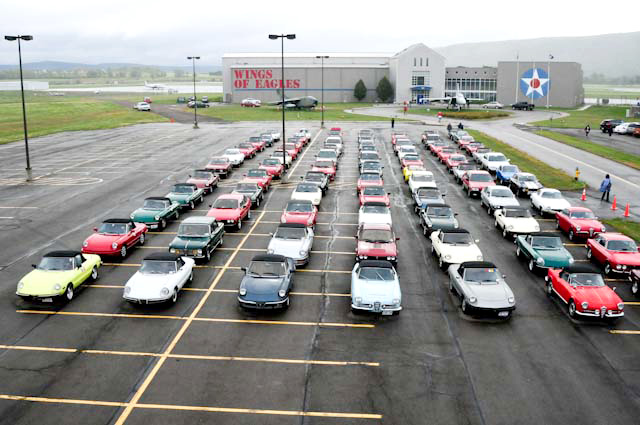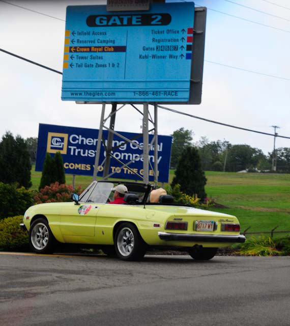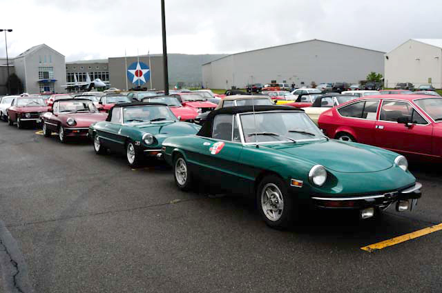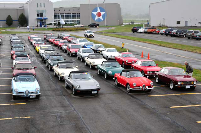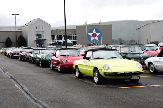 By John DeWaele The caravan took off from the Charlton rest stop Thursday morning for the Tour de Glen. Kevin Murphy, John and Ki Basil, Dan and Deb Donovan, Tom Letourneau, Gene and Judy Durso and my wife Lauren and I headed west under grey skies. Five Spiders and a GT Junior! After a couple of hours, we met up with fellow Alfista Rob Favali at the now-famous Duanesburg Diner. A quick lunch and back on Route 20 (after two hours of corn fields, I thought Kevin had taken a wrong turn and we were in Kansas) for a great touring stretch of road. Several hours later, the suitcases were tossed in the rooms and we headed to the Seneca Lodge. After checking out a parking lot spilling over with almost every kind of classic car imaginable (albeit lesser cars), we enjoyed the local flavor that only the Seneca Lodge can provide. What a great racing atmosphere! On Friday morning, 80 Alfa Romeos filled the lot at the Wings of Eagles Museum. After a brief tour and a driver’s meeting (“keep up with the car in front of you!”), we walked out to the cars. Expecting rain, we were greeted with a rainbow and a blue sky coming over the hills.