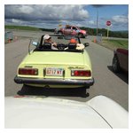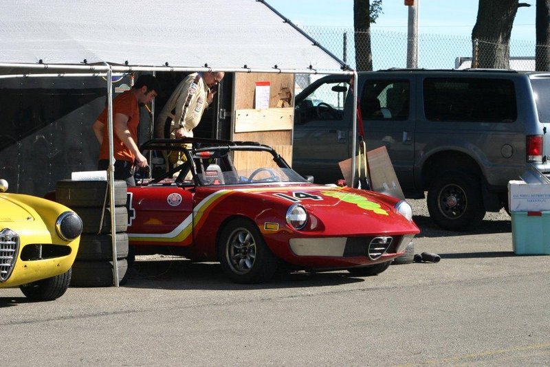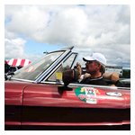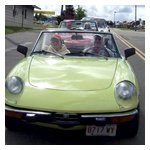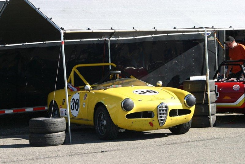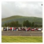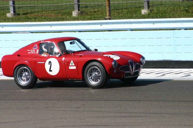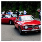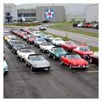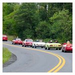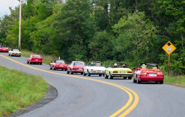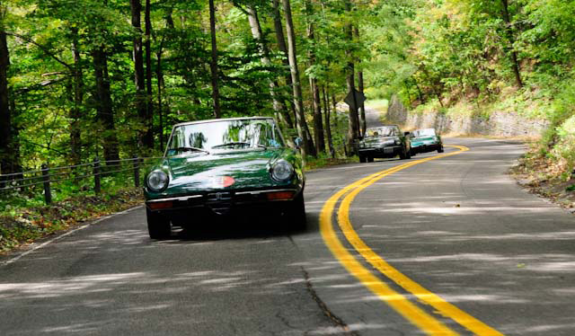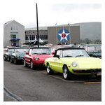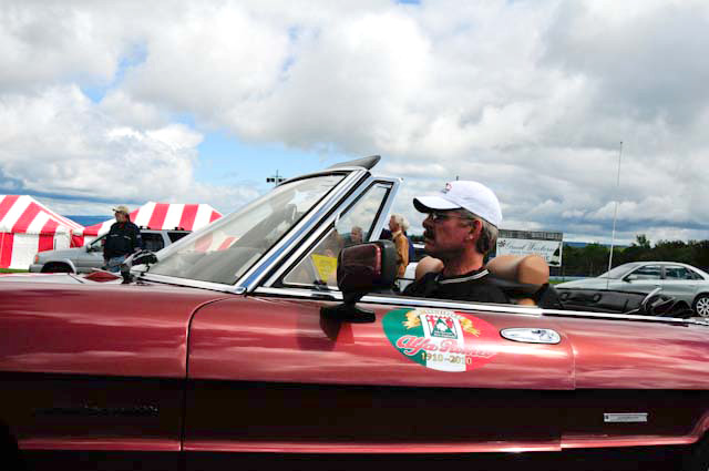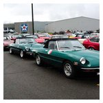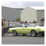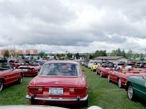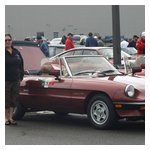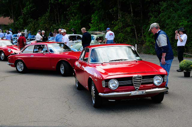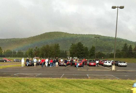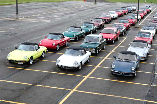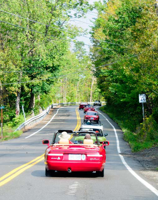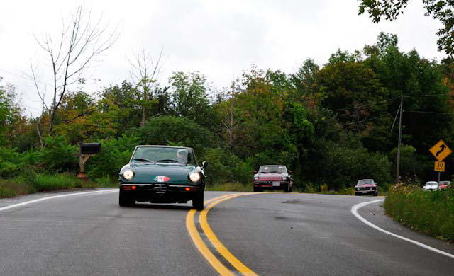 By John DeWaele The caravan took off from the Charlton rest stop Thursday morning for the Tour de Glen. Kevin Murphy, John and Ki Basil, Dan and Deb Donovan, Tom Letourneau, Gene and Judy Durso and my wife Lauren and I headed west under grey skies. Five Spiders and a GT Junior! After a couple of hours, we met up with fellow Alfista Rob Favali at the now-famous Duanesburg Diner. A quick lunch and back on Route 20 (after two hours of corn fields, I thought Kevin had taken a wrong turn and we were in Kansas) for a great touring stretch of road. Several hours later, the suitcases were tossed in the rooms and we headed to the Seneca Lodge. After checking out a parking lot spilling over with almost every kind of classic car imaginable (albeit lesser cars), we enjoyed the local flavor that only the Seneca Lodge can provide. What a great racing atmosphere! On Friday morning, 80 Alfa Romeos filled the lot at the Wings of Eagles Museum. After a brief tour and a driver’s meeting (“keep up with the car in front of you!”), we walked out to the cars. Expecting rain, we were greeted with a rainbow and a blue sky coming over the hills.