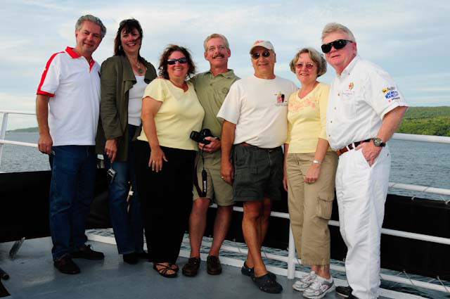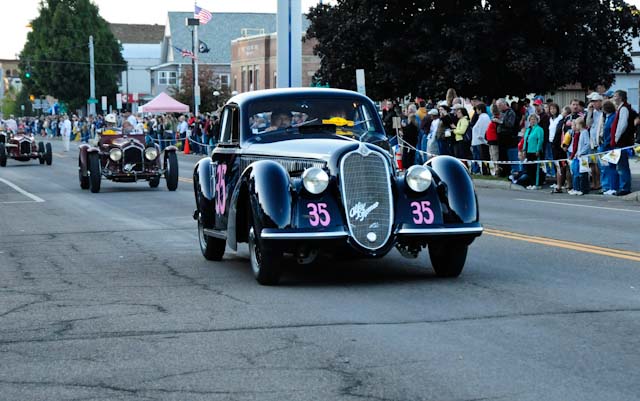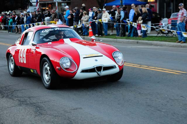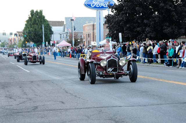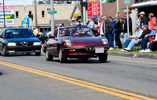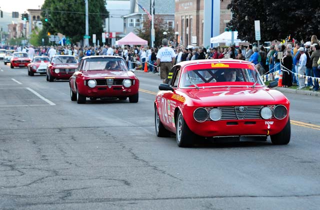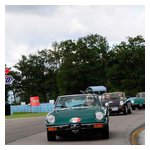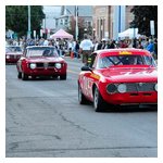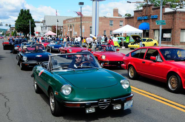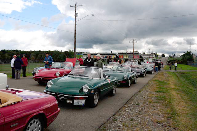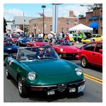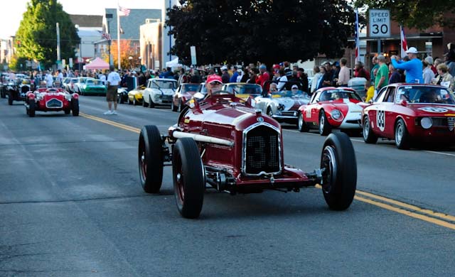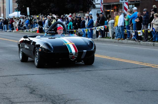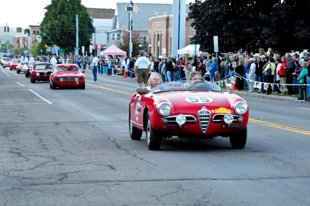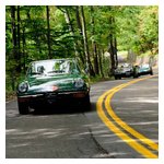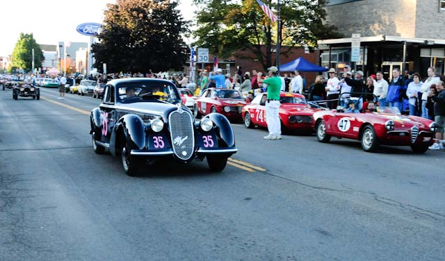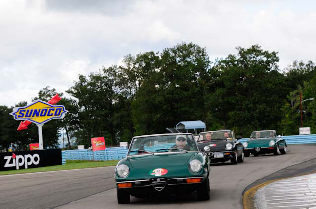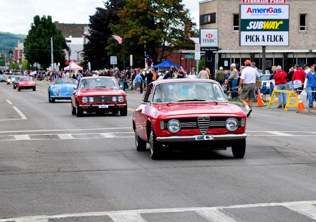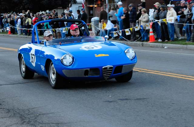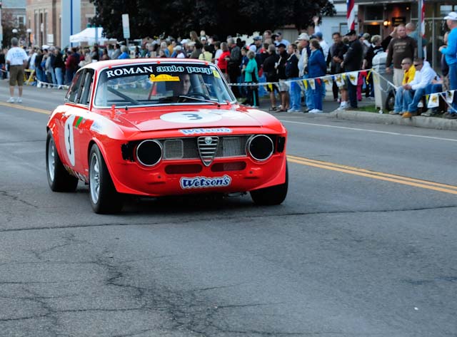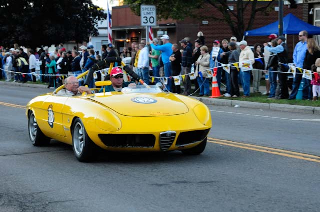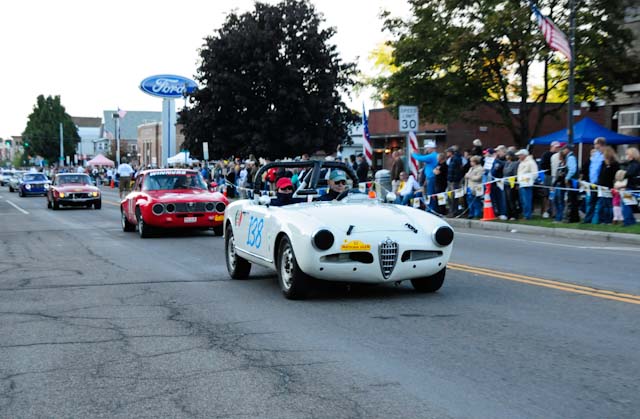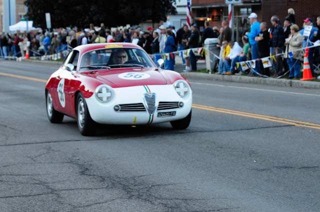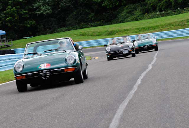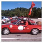 Back in the cars, we then completed three laps on the famous Grand Prix course — what a thrill! And, as always, keeping up with the car in front of us (ya had to be there). The word is that the British car drivers had to be prodded along; not so with the Italian car gang! From WGI, we then completed three laps on the original Watkins Glen road course. Quite a sight to head down Main Street — the whole town comes out to wave and cheer all the cars (are those open containers we see?) After completion of the old course, the Tour de Marque cars are put on display at Lafayette Park (that’s us!). No more driving — time to join in the festivities and cheer on all the other tours. The street is closed, the vineyards are pouring, and the grills are smoking! At 4:30, about 60 race cars were escorted from the track to Main Street for their laps of the old course. The place of honor was held by a 1938 Alfa Romeo 2900B — the winner of the first Watkins Glen Grand Prix, no less! Absolutely pristine, and what a sound! Lined up behind the 2900 were three prewar Alfas, about twenty Allards, and easily twenty more Alfa race cars. These were followed by Porsches, Corvettes, MGs, Triumphs, and the list went on and on. Saturday was track day. Each class had a qualifying race and there was also a one-hour open class race that provided a ton of excitement. The P3 driven by Nuvolari was at the track! At the end of the straight there is a chicane; side-by-side racing through there really separates the men (or gals) from the boys. A sunny Saturday afternoon was a great time to visit a few of the local vineyards and also run a self-guided rallye (didn’t the rallye master notice the bridge that had been closed for months?). A cruise on Lake Seneca with our brother Alfisti from the N.Y. Chapter, as well as a few fine Canadian Alfa owners (what hockey game?), topped off a great day! Okay, one more stop at the Seneca Lodge… With Sunday’s misty start (and work on Monday), we decided to head back east early. Jumping off the highway in Oneonta (Route 23 to 23A, back on 23) provided us with a scenic trip through the Catskills on Alfa Romeo-made roads. All in all, a fantastic weekend! Great people, fantastic cars, and a wonderful event. The people of Watkins Glen truly open their arms (and bottles) to all us motor heads.