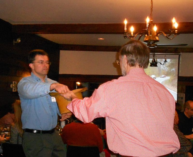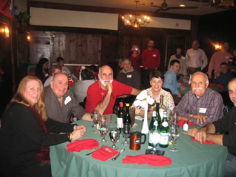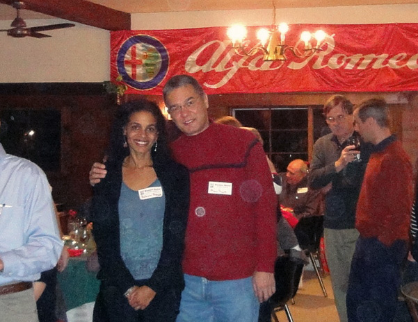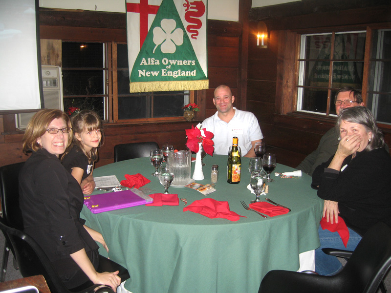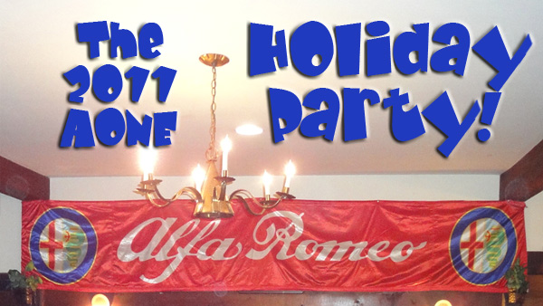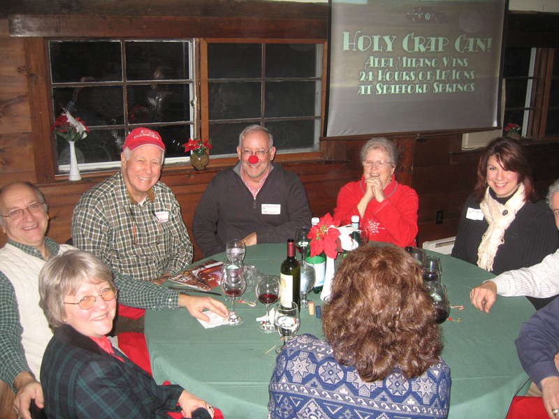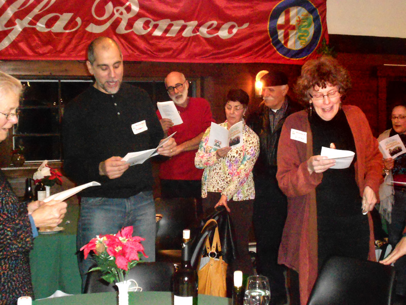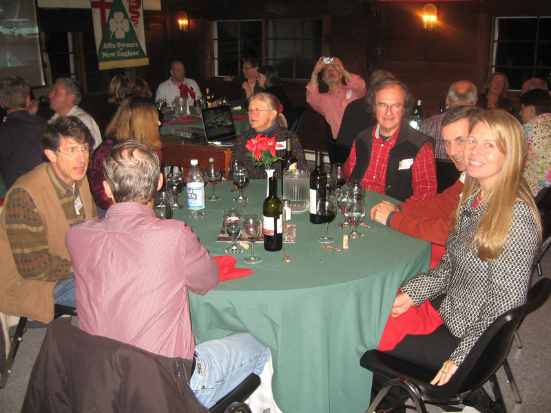 By Dave Pratt Last year we had a monsoon, and a couple of years before that over a foot of snow. But this year we were graced with perfect, crisp, late-autumn weather for our annual AONE Holiday Party. The result? Several actual Alfa Romeos in the parking lot! A crowd of Alfisti numbering in the mid-40s gathered in the late afternoon of Sunday, December 11th, at the Josiah Smith Tavern in Weston, MA. Practically all were bearing gifts for the traditional Yankee swap that would come later, and these filled a large table to overflowing. We donned name tags and were greeted by a continuous slide show of a couple hundred photos that AONE President and event organizer Tom Lesko had put together — a "Year in Review" of our 2011 club events. Tom also spared us the operatic holiday music he’d threatened and instead played some cool "Jazz Holidays" tunes in the background, which we soon drowned out with our boisterous conversation and laughter. We were happy to have some new members join us this year and discover what a jovial bunch we are. These included Steve Branson, who has just acquired his first Alfa — a very nice silver GTV that he brought to the party. They also included Dave LaChance, editor of the excellent Hemmings Sports & Exotic Car magazine, who recently acquired his first Alfa — a white ’73 Berlina. Welcome to the fray! We all soon attacked the table of delicious appetizers, and then waitresses roamed through the crowd with trays of hors d'œuvre. We tapped, uncorked, and/or unscrewed the various forms of libation we'd brought along and spent a fine time enjoying them, the appetizers, and the camaraderie. In due course, we were summoned to the buffet table for the main course, and it was another grand feast presented by the same caterer we had used the past few years (Tastings Caterers of Framingham). Tom Lesko had worked with them to give the menu a gourmet Italian flair, and the menu was terrific, garnering nothing but raves from all of our guests. After dinner, Tom Lesko kept his comments brief, and then launched into the eagerly-anticipated Yankee gift swap. As at previous holiday parties, this was again lots of fun, with a wide array of brightly-wrapped presents being opened one after the other, and then either being swapped for ones that had already been opened or hidden away in a vain attempt to prevent someone from spotting them and stealing them away. As always, there were a few particularly hot items that got swapped around several times. These included an Alfa Romeo fender cover, some limoncello (a perennial favorite), a diecast model of an 8C 2300, and a set of Italian bowls with ingredients to fill them. After the last gift was opened and swapped, the moment finally arrived for our annual holiday sing-along. Some people understandably bolted for the doors, while others gathered around to belt out some rousing a cappella renditions of several tunes normally associated with Xmas, but with lyrics transformed to address our Alfa Romeo mindset. This year’s offerings included a tribute to the Scuderia Limoni win at the 24 Hours of Lemons in a Milano, and a tale of Dave LaChance’s tribulations with his Berlina’s brakes, a retelling in song of a column that he wrote in the latest issue of his magazine. As you can see in the photos below, everyone