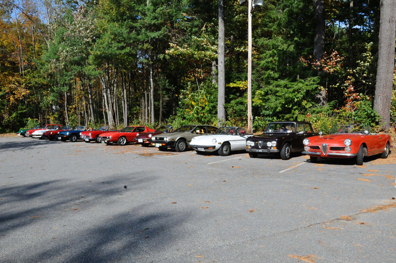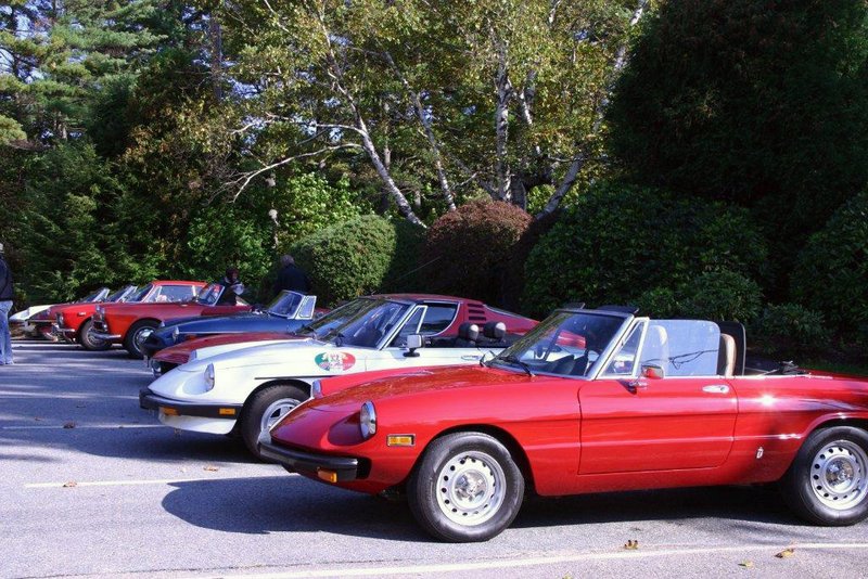 a dozen Alfa Romeo automobiles gathered at the Old Mill Restaurant