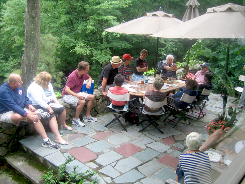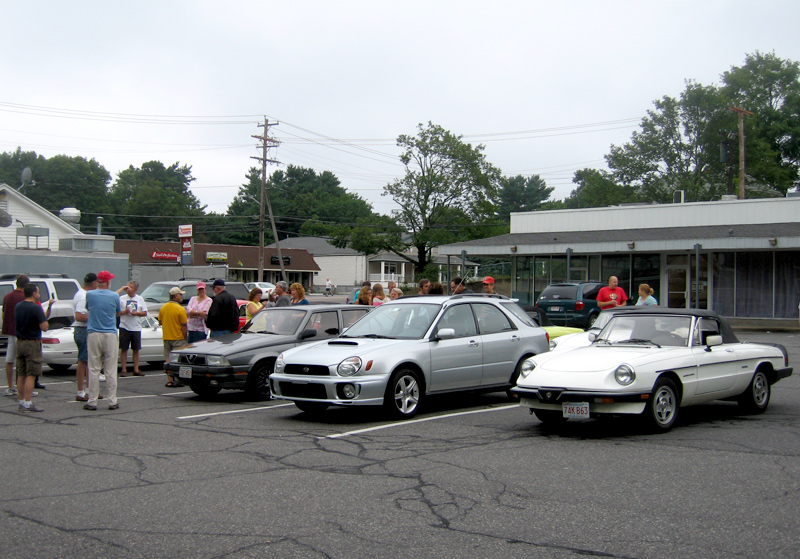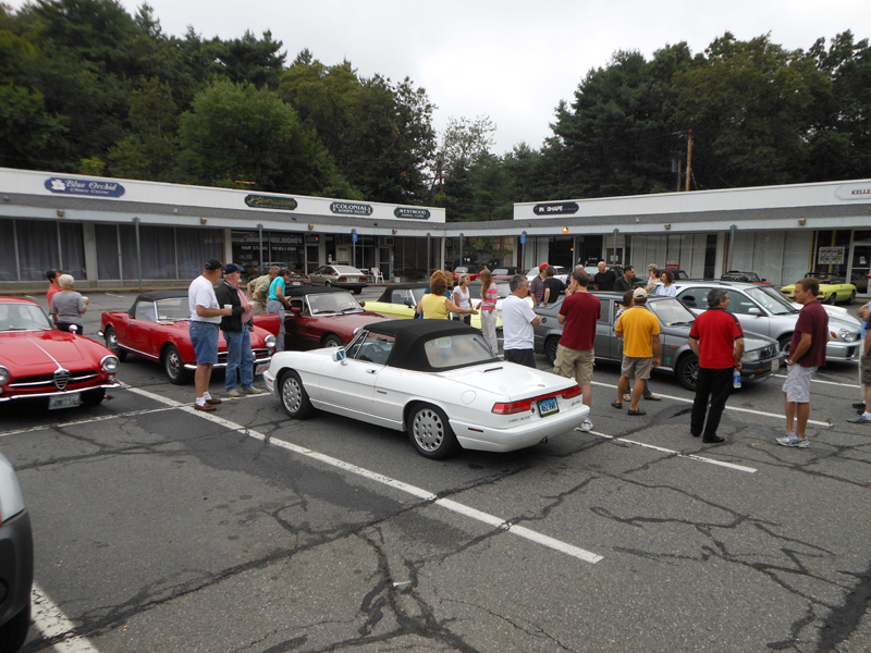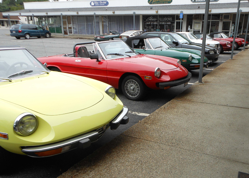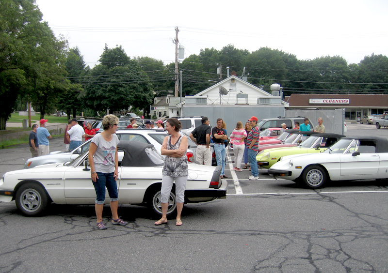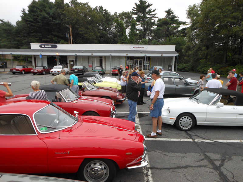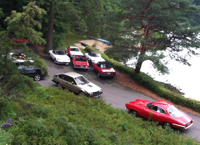 By Dave Pratt Well, that was a close call! The forecast for the Il Giro del Dedham rally on Sunday, July 29th, had been looking really good … right up until Saturday, at which point they were predicting overcast skies with a 50% chance of showers and thunderstorms. Porca madonna! Sure enough, Sunday arrived drizzling in some places and outright raining in others. A couple of people called to ask if the rally was still on. It was! Nearly everybody who had signed up for the event arrived in Westwood on Sunday morning, the only two exceptions being one gent with an overriding familial obligation and another with a non-starting Alfa — no cancellations due to the weather! It was an excellent turnout of 18 cars and 32 people running the rally, plus rallymaster & rallymistress and a couple of Tom L’s who showed up later (Lesko making a Presidential appearance and Letourneau of the non-starting Alfa). After the usual tire-kicking session and fluids exchange visits to the Dunkin Donuts behind which we were assembled, we huddled for a driver’s meeting. Here, the rallyists were given the route sheets — six pages of turn-by-turn driving instructions, interspersed with questions to be answered about the roadside features they’d be passing. Some were straightforward observation, some involved a little whimsical deceit, and a couple were even better answered with the use of a smartphone. (So much for old-fashioned road rallies!) In addition, there were a few cumulative questions, such as how many times the route crossed the Charles River. We also handed out “emergency kits”, which were large, detailed maps of the entire route and an emergency phone number, with a seal that would cost a 10-point penalty if it were broken. A little after 10am, the first car was sent off, followed at roughly two-minute intervals by the others, until they were all on the road to start their adventures. Of course, it didn’t really matter what the intervals were, since the Alfas were soon passing, re-passing, and crisscrossing each other throughout the journey. At about 1/3 of the way along the route, the rallyists got to stretch their legs at Jane & Paul’s Farm, where they were asked to buy a little something for the communal salad for lunch later or something for the communal bouquet, depending on whether or not their Alfas were red. Turns out that the farm didn’t really sell cut flowers (mea culpa), so we ended up with tons of vegetables plus various fruits, pies, and desserts. (As for the bouquet, see the photo at the bottom). The rallyists got another chance to stretch at around the 2/3 mark, where they were asked to find a bit of information from a tomb in a centuries-old cemetery. A little after noon, our intrepid but thirsty and hungry tourers began rolling into the final destination (i.e., our house in Dedham) in nothing that resembled the order in which they were sent out a couple of hours earlier. I was relieved to see that 1) they arrived at all, and 2) they all appeared to be smiling. I have a feeling that nobody had believed my claim that they’d be driving over 50 miles inside I-495 without seeing a single stop light, so it must have tickled them when that turned out to be the case. They loaded me down with their completed rally answer sheets, as well as lots and lots of tomatoes, peppers, berries, and pies. (And a jar of beet balls.) Six volunteers helped with the scoring (thank you so much!), each responsible for one sheet of the six, and this made the task go very quickly. Everybody else found their way to the beer taps and munchies, and hung out comparing stories from the rally (and from other important highlights of their lives). When we were certain that all of the rallyists had pulled in, lunch came out — a huge tray of sausages, peppers, and onions from Mercato di Dovera (all right, the Dover Market); pasta, cannellini, and coleslaw salads that Vi had made (what a woman!); breads; and of course our communal garden and fruit salads, which people helped prepare after they arrived. Once everyone appeared sufficiently sated and the line for seconds slowed, we gathered outside to announce the rally winners. I was astounded by the diligence, effort, and thought that everybody put in to answer the questions! I never expected that people would get so many of them right! And not a single “emergency kit” seal had been broken! Well done! The top spots were very closely contested, but in the end Peter Walker & Meg Anderson took First Place with a score of 63 (out of a possible 73). Tied for Second Place just one point behind were the teams of John & Lauren DeWaele and Dan & Deb Donovan. We also presented a Broken Giubo Award (the Brits can keep their Broken Spoke) to the team, uhhhhhh, showing the most room for improvement, and this went to Steven & Jane Silberberg. This was their first AONE event of any type, as was also the case with a few of the other rallyists. Hope you had fun and our antics didn’t scare you away from future events! Then the desserts came out — cheesecake with fresh peaches & blueberries, various confections, and the assorted pies etc. that the rallyists scored at the farm. Quite a feast! Gradually, the party broke up, the Alfas untangled themselves from where they were parked in the driveway making their heart-warming Alfa sounds, and people headed for home.