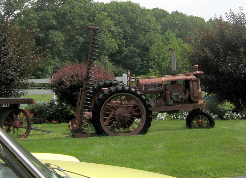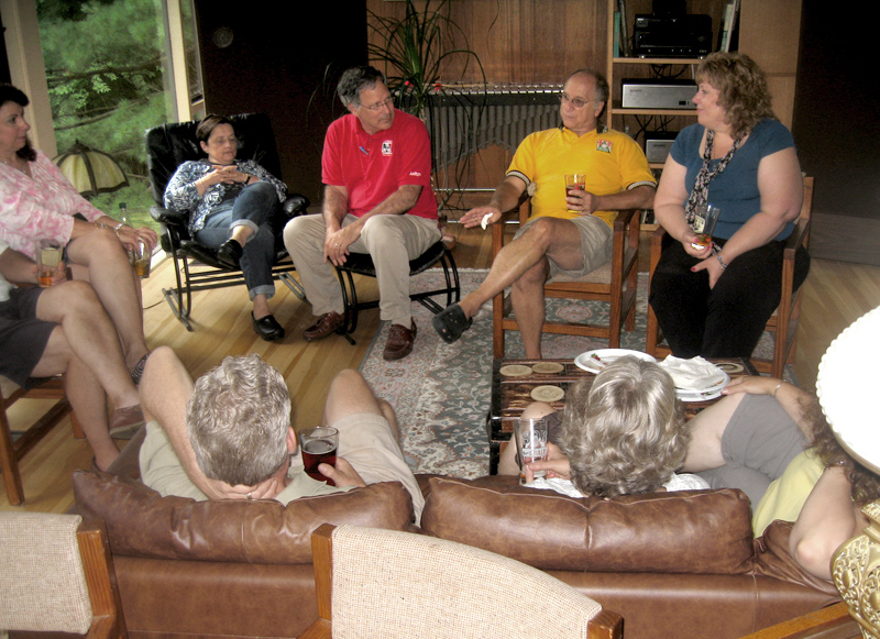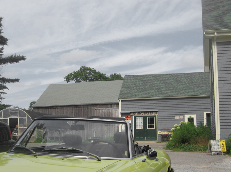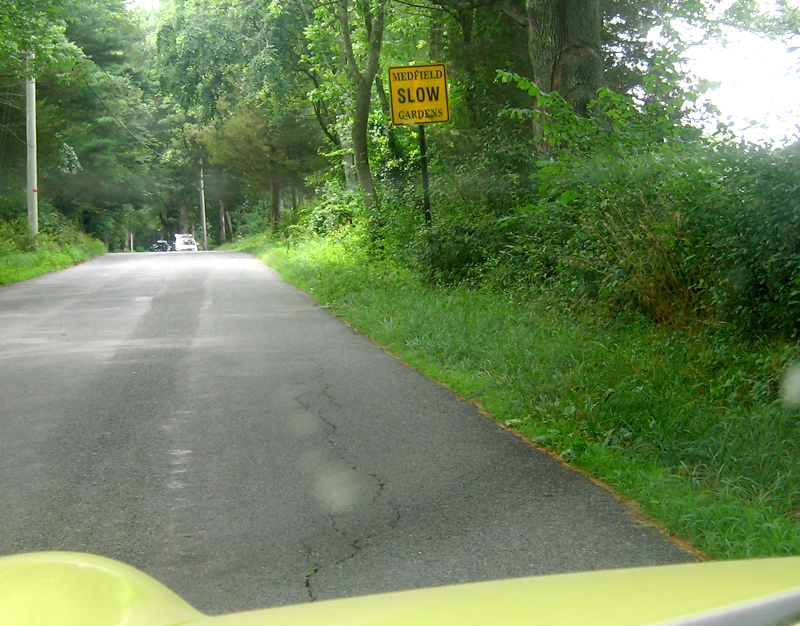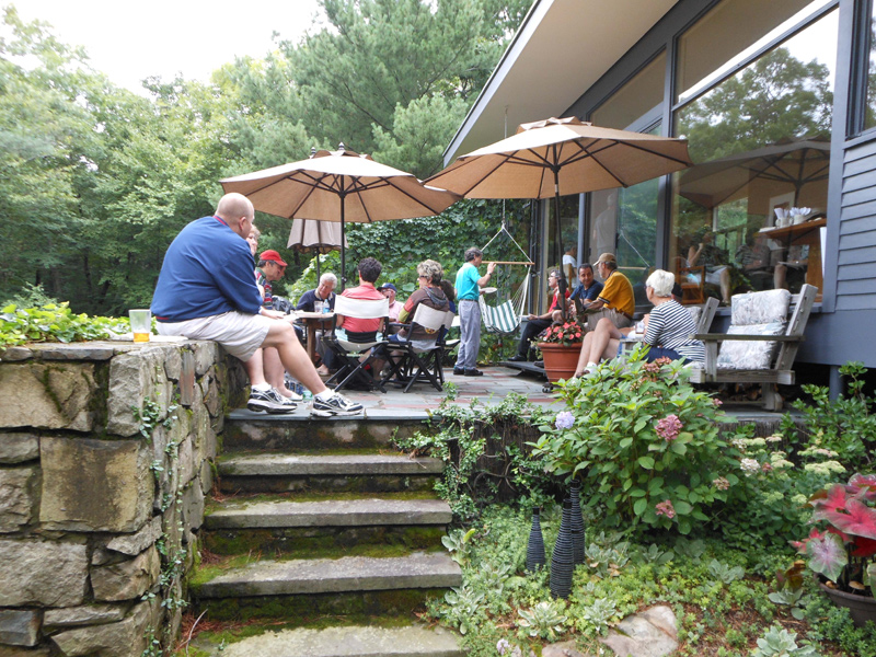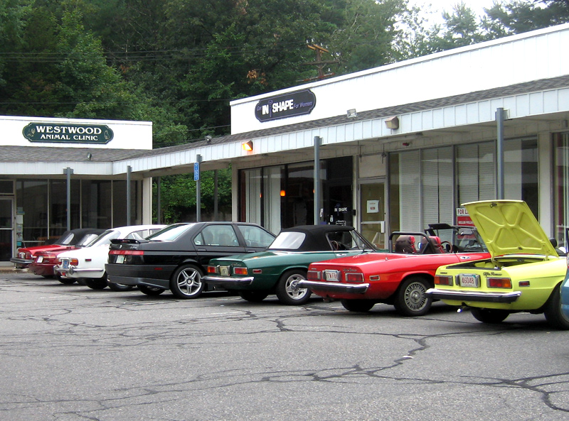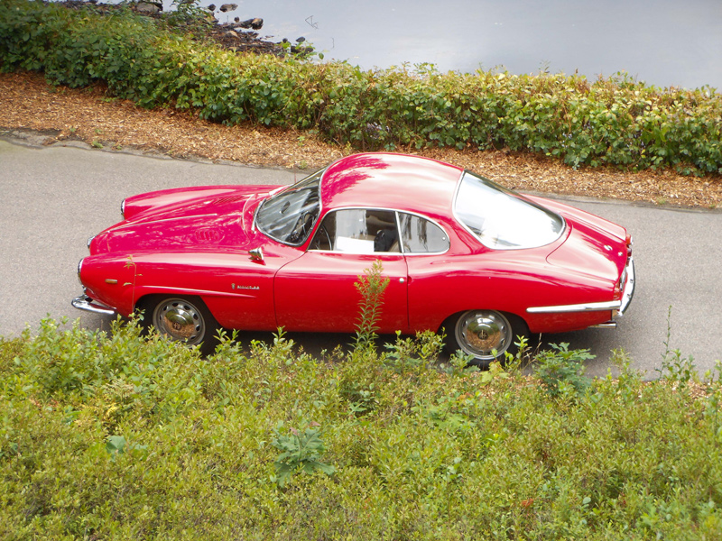 By Dave Pratt Well, that was a close call! The forecast for the Il Giro del Dedham rally on Sunday, July 29th, had been looking really good … right up until Saturday, at which point they were predicting overcast skies with a 50% chance of showers and thunderstorms. Porca madonna! Sure enough, Sunday arrived drizzling in some places and outright raining in others. A couple of people called to ask if the rally was still on. It was! Nearly everybody who had signed up for the event arrived in Westwood on Sunday morning, the only two exceptions being one gent with an overriding familial obligation and another with a non-starting Alfa — no cancellations due to the weather! It was an excellent turnout of 18 cars and 32 people running the rally, plus rallymaster & rallymistress and a couple of Tom L’s who showed up later (Lesko making a Presidential appearance and Letourneau of the non-starting Alfa). After the usual tire-kicking session and fluids exchange visits to the Dunkin Donuts behind which we were assembled, we huddled for a driver’s meeting. Here, the rallyists were given the route sheets — six pages of turn-by-turn driving instructions, interspersed with questions to be answered about the roadside features they’d be passing. Some were straightforward observation, some involved a little whimsical deceit, and a couple were even better answered with the use of a smartphone. (So much for old-fashioned road rallies!) In addition, there were a few cumulative questions, such as how many times the route crossed the Charles River. We also handed out “emergency kits”, which were large, detailed maps of the entire route and an emergency phone number, with a seal that would cost a 10-point penalty if it were broken. A little after 10am, the first car was sent off, followed at roughly two-minute intervals by the others, until they were all on the road to start their adventures. Of course, it didn’t really matter what the intervals were, since the Alfas were soon passing, re-passing, and crisscrossing each other throughout the journey. At about 1/3 of the way along the route, the rallyists got to stretch their legs at Jane & Paul’s Farm, where they were asked to buy a little something for the communal salad for lunch later or something for the communal bouquet, depending on whether or not their Alfas were red. Turns out that the farm didn’t really sell cut flowers (mea culpa), so we ended up with tons of vegetables plus various fruits, pies, and desserts. (As for the bouquet, see the photo at the bottom). The rallyists got another chance to stretch at around the 2/3 mark, where they were asked to find a bit of information from a tomb in a centuries-old cemetery. A little after noon, our intrepid but thirsty and hungry tourers began rolling into the final destination (i.e., our house in Dedham) in nothing that resembled the order in which they were sent out a couple of hours earlier. I was relieved to see that 1) they arrived at all, and 2) they all appeared to be smiling. I have a feeling that nobody had believed my claim that they’d be driving over 50 miles inside I-495 without seeing a single stop light, so it must have tickled them when that turned out to be the case. They loaded me down with their completed rally answer sheets, as well as lots and lots of tomatoes, peppers, berries, and pies. (And a jar of beet balls.) Six volunteers helped with the scoring (thank you so much!), each responsible for one sheet of the six, and this made the task go very quickly. Everybody else found their way to the beer taps and munchies, and hung out comparing stories from the rally (and from other important highlights of their lives). When we were certain that all of the rallyists had pulled in, lunch came out — a huge tray of sausages, peppers, and onions from Mercato di Dovera (all right, the Dover Market); pasta, cannellini, and coleslaw salads that Vi had made (what a woman!); breads; and of course our communal garden and fruit salads, which people helped prepare after they arrived. Once everyone appeared sufficiently sated and the line for seconds slowed, we gathered outside to announce the rally winners. I was astounded by the diligence, effort, and thought that everybody put in to answer the questions! I never expected that people would get so many of them right! And not a single “emergency kit” seal had been broken! Well done! The top spots were very closely contested, but in the end Peter Walker & Meg Anderson took First Place with a score of 63 (out of a possible 73). Tied for Second Place just one point behind were the teams of John & Lauren DeWaele and Dan & Deb Donovan. We also presented a Broken Giubo Award (the Brits can keep their Broken Spoke) to the team, uhhhhhh, showing the most room for improvement, and this went to Steven & Jane Silberberg. This was their first AONE event of any type, as was also the case with a few of the other rallyists. Hope you had fun and our antics didn’t scare you away from future events! Then the desserts came out — cheesecake with fresh peaches & blueberries, various confections, and the assorted pies etc. that the rallyists scored at the farm. Quite a feast! Gradually, the party broke up, the Alfas untangled themselves from where they were parked in the driveway making their heart-warming Alfa sounds, and people headed for home.