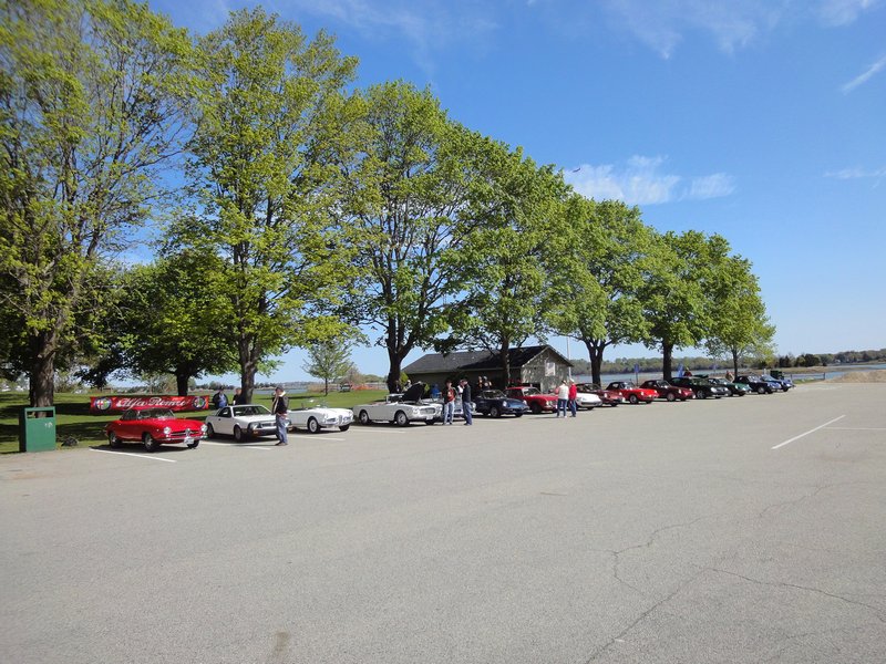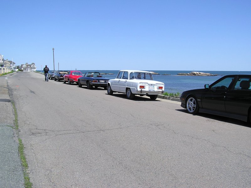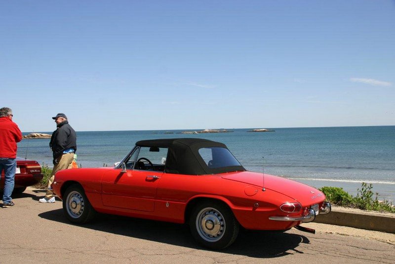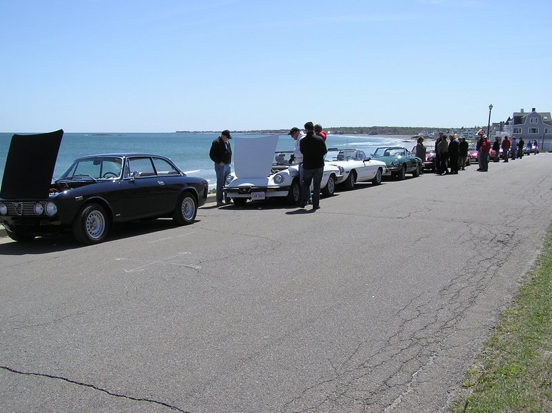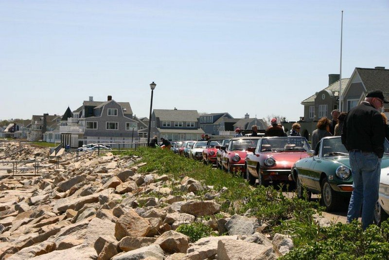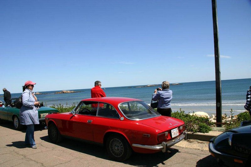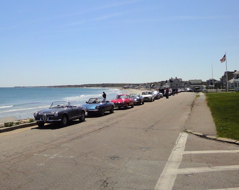 By Tom Lesko So I guess this makes it 6 for 6 in terms of the weather ... ah, but who's counting, and we certainly don't want to jinx next year’s event! At around 9:00 the morning of Saturday, April 28th, Joe La Rocca (a colleague who teaches architectural history) and I picked up some muffins, munchkins, and coffee, and were at the Hingham beach readying ourselves for the day. The sun was shining, albeit a bit cool, and the birds were chirping and doing what birds often do (but hopefully not on any of our beloved Alfas!). I'd invited Joe and a friend, Nancy Tucker, to join us on our 6th annual South Shore Beach & Waterfront Tour … and what a tour it was! Normally, we get around 12 - 14 Alfas for this event, so I was planning accordingly. We had plenty of coffee, muffins, and munchkins to help us with the preliminary socializing while we awaited the anticipated dozen or so cars to arrive. Well, arrive they did! At first there were a few, then a few more, and more and more, until at last count we had 22 cars! Mostly Alfas, with two "Italian cousin" Lancias — see the list of cars and participants below. WOW! So, on the suggestion of Rick Lesniewicz and others, I split up the very large crowd of 37 people into three groups, each led by an AONE member who knew the roads we were taking. This proved to be a very good idea! Garry and Tereza Prime led one group with their '69 Lancia Flaminia Spider, another group was led by Ken and Barbara Buntrock in their '69 Alfa Spider, and the third was led my myself, with copilot Joe La Rocca, in Grumpy, my '65 Giulia Spider Veloce. At the very first stop, Garry Prime realized that his Lancia was trying to mark its territory with an oil leak, but alas it wasn’t going to happen in AONE land! Garry had to sideline the Lancia, so Ben and Kristen Prime took over the lead in father Garry's '57 Giulietta Spider. Garry and Tereza later joined us for lunch. Due to the large number of cars, I abbreviated parts of the tour to maintain the group, and we proceeded to see the most wonderful and scenic parts of the South Shore. Our stops included Nantasket Beach, a brief stop at the tip of Hull (the "Hull Gut", as mariners would know it). Then on to Cohasset's "gold coast", as I refer to it, with a longer photo-op stop at Minot Beach overlooking the ocean and Minot lighthouse. This stop always seems to draw a crowd of onlookers, including several children who were taking pictures of the "wonderful cars", as they said. Leaving Minot beach, we proceeded through Cohasset to Scituate, with a cruise past the Scituate lighthouse, Scituate Harbor, and on to the Mill Wharf Restaurant off the main drag of Front Street. The staff had set up two long tables in a semi-private area overlooking the harbor where we enjoyed the very good food and drink. A good time was had by all! Special congratulations go out to Tom Letourneau who, for the first time, made the entire tour without incident! (Someone said that John and Lauren DeWaele must have towed him so he wouldn't get lost, but that cannot be verified. ;)