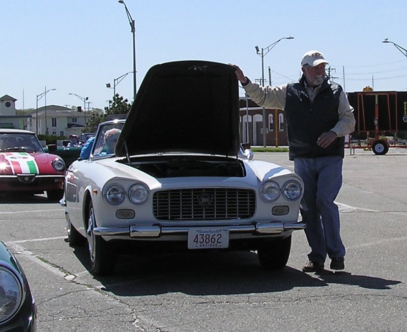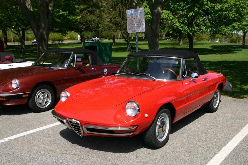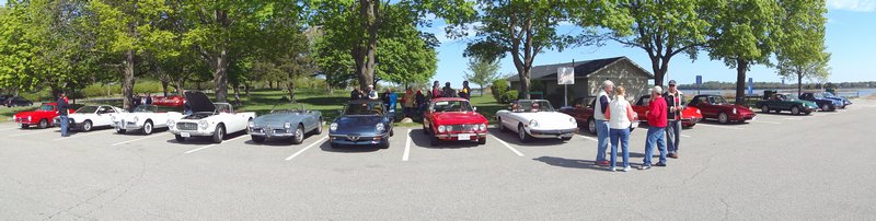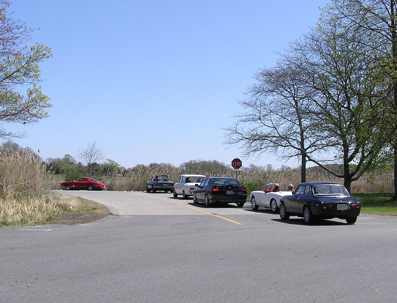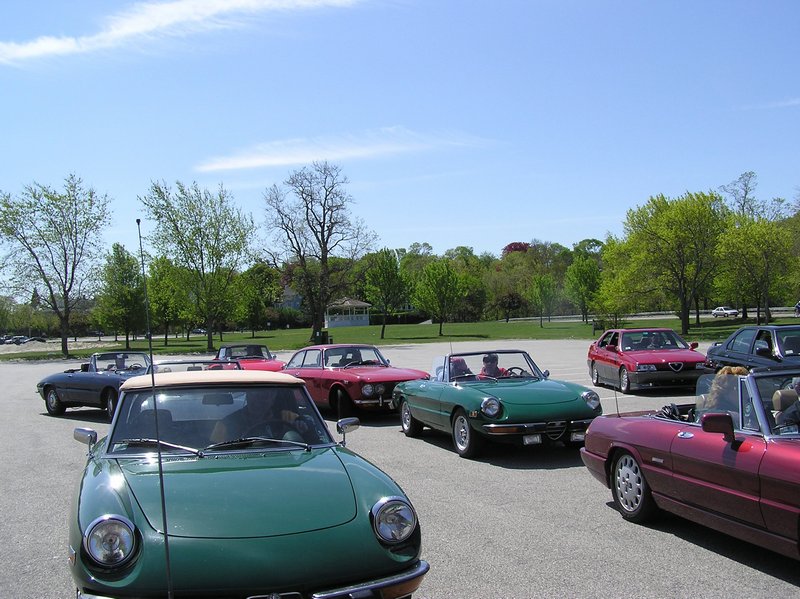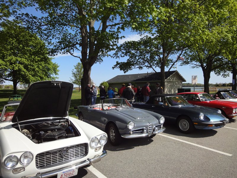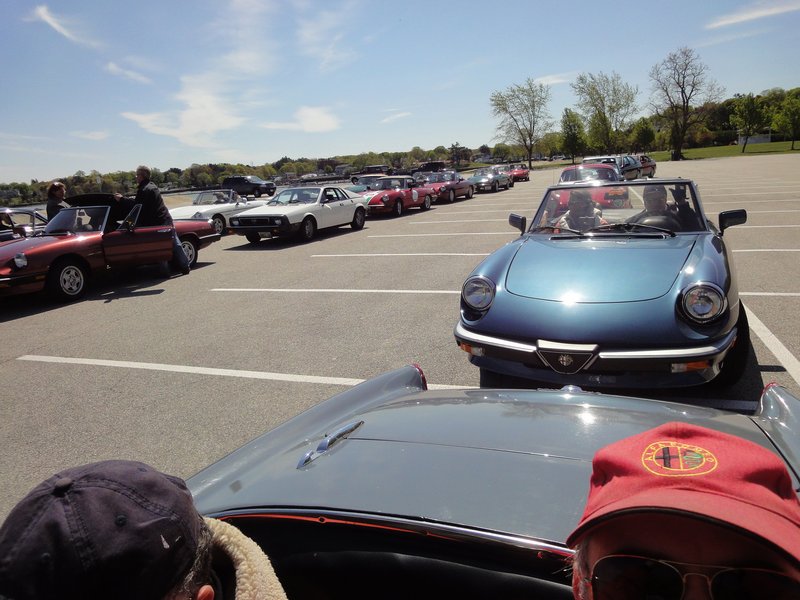 By Tom Lesko So I guess this makes it 6 for 6 in terms of the weather ... ah, but who's counting, and we certainly don't want to jinx next year’s event! At around 9:00 the morning of Saturday, April 28th, Joe La Rocca (a colleague who teaches architectural history) and I picked up some muffins, munchkins, and coffee, and were at the Hingham beach readying ourselves for the day. The sun was shining, albeit a bit cool, and the birds were chirping and doing what birds often do (but hopefully not on any of our beloved Alfas!). I'd invited Joe and a friend, Nancy Tucker, to join us on our 6th annual South Shore Beach & Waterfront Tour … and what a tour it was! Normally, we get around 12 - 14 Alfas for this event, so I was planning accordingly. We had plenty of coffee, muffins, and munchkins to help us with the preliminary socializing while we awaited the anticipated dozen or so cars to arrive. Well, arrive they did! At first there were a few, then a few more, and more and more, until at last count we had 22 cars! Mostly Alfas, with two "Italian cousin" Lancias — see the list of cars and participants below. WOW! So, on the suggestion of Rick Lesniewicz and others, I split up the very large crowd of 37 people into three groups, each led by an AONE member who knew the roads we were taking. This proved to be a very good idea! Garry and Tereza Prime led one group with their '69 Lancia Flaminia Spider, another group was led by Ken and Barbara Buntrock in their '69 Alfa Spider, and the third was led my myself, with copilot Joe La Rocca, in Grumpy, my '65 Giulia Spider Veloce. At the very first stop, Garry Prime realized that his Lancia was trying to mark its territory with an oil leak, but alas it wasn’t going to happen in AONE land! Garry had to sideline the Lancia, so Ben and Kristen Prime took over the lead in father Garry's '57 Giulietta Spider. Garry and Tereza later joined us for lunch. Due to the large number of cars, I abbreviated parts of the tour to maintain the group, and we proceeded to see the most wonderful and scenic parts of the South Shore. Our stops included Nantasket Beach, a brief stop at the tip of Hull (the "Hull Gut", as mariners would know it). Then on to Cohasset's "gold coast", as I refer to it, with a longer photo-op stop at Minot Beach overlooking the ocean and Minot lighthouse. This stop always seems to draw a crowd of onlookers, including several children who were taking pictures of the "wonderful cars", as they said. Leaving Minot beach, we proceeded through Cohasset to Scituate, with a cruise past the Scituate lighthouse, Scituate Harbor, and on to the Mill Wharf Restaurant off the main drag of Front Street. The staff had set up two long tables in a semi-private area overlooking the harbor where we enjoyed the very good food and drink. A good time was had by all! Special congratulations go out to Tom Letourneau who, for the first time, made the entire tour without incident! (Someone said that John and Lauren DeWaele must have towed him so he wouldn't get lost, but that cannot be verified. ;)
