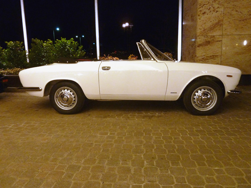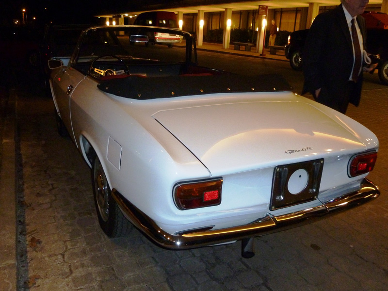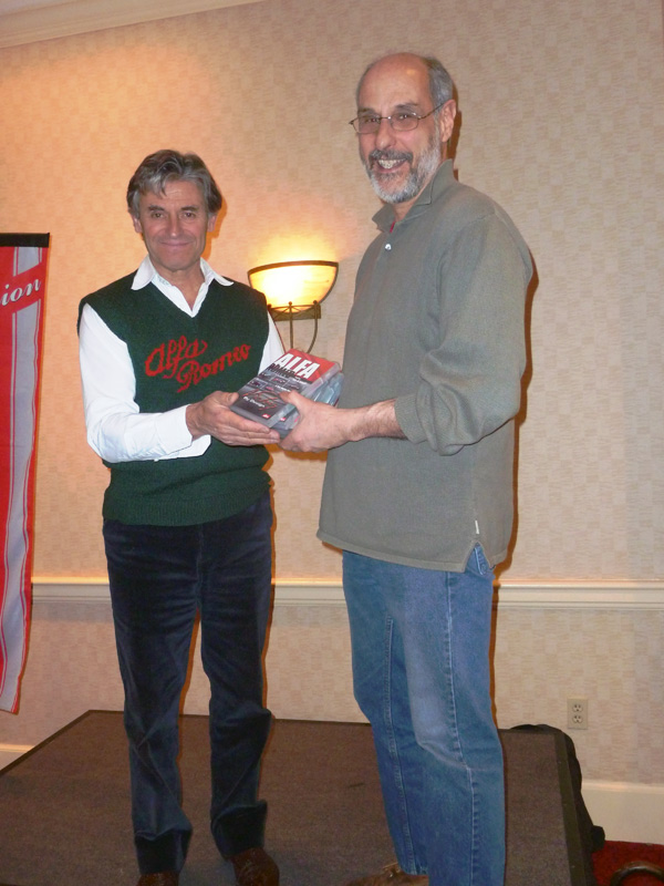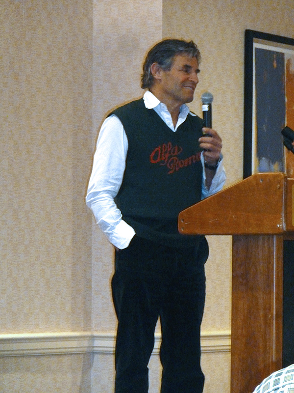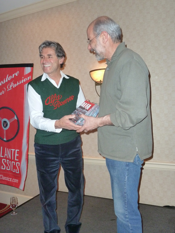 Greeting us when we arrived at the Marriott was a gorgeous white GTC parked out front. This should get us in the spirit for awakening our own sleeping beauties (well, maybe not 100-point beauties, but cuties, anyway) in the coming days! (The GTC is for sale — click here to take a look.) In addition to hearing a very entertaining and interesting talk by de Cadenet, Andy won the big raffle — an autographed set of all six of de Cadenet's Victory by Design DVDs! Andy had all but tossed his raffle tickets at me just before they called his winning number. In his inimitable, humble style, he didn't even want to go up to accept the prize! Alain de Cadenet is a trip! He recounted story after colorful story of the interesting stuff that made him the celebrity that he is. Like helping, in a most personal way, a head-to-toe bandaged Brian Redman relieve himself into a wash basin in a hospital room as he himself was recovering from a terrible crash. Or that Steve McQueen story. Or how he got thrown out of and banned from ever competing in the Mille Miglia because he passed the Polizia while driving an Alfa Stradale during the race. When chased by the Polizia, he proceeded to put his foot in it and elude his pursuer all the way to Rome, where finally the chief of police issued his reprimand. When asked what his favorite car of all time is, he did not hesitate and named a car that he owns — a 1931 8C 2300 Mille Miglia!