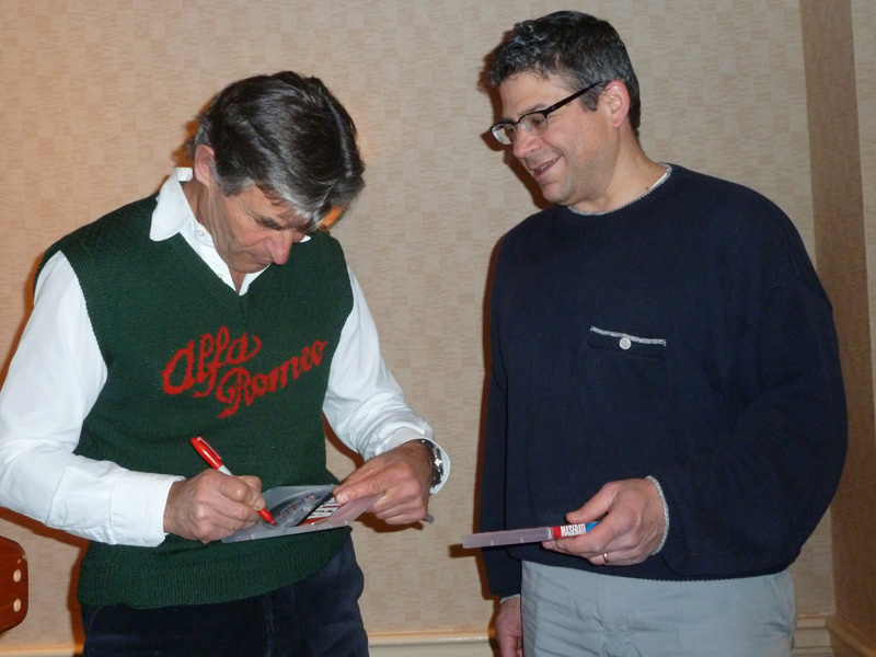 Quite a few Alfa folks were on hand at the Newton Marriott on March 26th for an evening of stories and camaraderie with Le Mans and vintage racer, TV personality, and host of the terrific Victory by Design series, Alain de Cadenet. The Alfisti included Andy Kress, Jim Scutti, Jonathan Kirshtein, Kevin Redden, John DeWaele, Tom Letourneau, Michael & Debra Leccese, and Richard Askin. (Sorry if you were there and we missed you!) The event was presented by our friends at Motorsports Marketing Resources. We have two reports for you, the first written by Andy and the second by Jim: Alain started out talking about the Victory by Design series. It was interesting to hear how they put that whole thing together — it sort of came about by accident. Alain didn’t have any speaking or film experience, but producer Tony Maylam was impressed by Alain's spontaneous and knowledgeable discourse over various cars (plus his really good connections). They thought they could make it happen and pushed Alain to do it in a nothing-ventured, nothing-gained sort of way. The thing was funded on a shoestring — in fact, they ran out of money on the Ferrari video, and there was a five-year hiatus between start and finish. In spite of all that, they developed a formula and some technique that stood them in good stead, and did successfully finish the series. He talked a little about "cars I have owned (and wish I had them to sell now)" — deals good and deals gone bad. For me, the most moving sections were when he talked about the racing in the good old days. Plenty of throwaway vignettes, insights, and stories about really iconic figures in motorsport from those days — Ickx, Redmond, Ecclestone, Brabham, Murray, Elford … and some Steve McQueen stories , such as this one: Alain had a Porsche 908 he was trying to sell. He got a call out of the blue from Steve McQueen asking about the 908. At first, he thought it was some friends winding him up. Once he was convinced it was indeed McQueen, he got all excited and invited him to his shop to look at the car. It turned out that McQueen was starting up his LeMans movie and wanted to see if he could adapt the 908 to be a camera car. No sale! Then McQueen saw some vintage motorcycles that were for sale as well and asked if he could take the Triumph Bonneville out for a ride. "Oh, sure," said Alain, hoping for a sale. McQueen disappeared for the day. Not a word. Finally, figuring the bike was gone for good, Alain went home. The next morning, he found the bike leaning up against the shop — with no gas in it. Then Alain talked about racing in the olden days. At his first race, he just showed up — a total newbie with his car, his paper mâché helmet, and string backed gloves. He was surprised when they asked him for his license! A little hemming and hawing, and he was waved in. He learned how to drive on the fly — watching the real racers and doing his best to imitate them. Over the summer, he got to be pretty good. In those days, with a little luck, once you got in, you could make the thing self-funding (which is not to say, comfortable). Teams were given appearance money by the promoters, and with any sort of placement there’d be cash payouts and rewards from the various motorsport players (tire, brake, fuel, oil makers). It is so different from here — racing was/is such a big thing. These guys were household names. Successful as he was, he talked with some awe about the other racers he competed against. For instance, someone asked him what it was like the first time he raced in the rain at LeMans. As he thought about it, he almost blanched on the stage, it was such a terrifying experience. We have to remember that, in those days, guys were already going over 200 on the Mulsanne Straight. His answer is that you see others dealing with it and you just make the leap of faith that you can too; get used to it, and you move on to the business at hand. In the same context, he described (with considerable awe in his voice) the time he was racing and it was pouring buckets. He was on rain tires and doing about 180, holding on for dear life, when he was passed by Jacky Ickx in a factory Porsche 930 (a 600hp turbo car) — on slicks. Alain said, “To this day, I do not know how that is possible. But Jacky is one of those special people with the magic touch. They can successfully do things that normal people cannot imagine doing at all.” He talked about the camaraderie and the terrible loss when friends died. He talked some about the moment when you realize it’s time to get out (both his moment and other racers’) before something really bad happens. He was very frank and open. Basically, he built a career in motorsports out of pure drive and chutzpah — just because he wanted it so badly. All in all, he came across as a really good guy, someone you'd love to have a beer with … and he would be happy to have one with you. Very charming.
