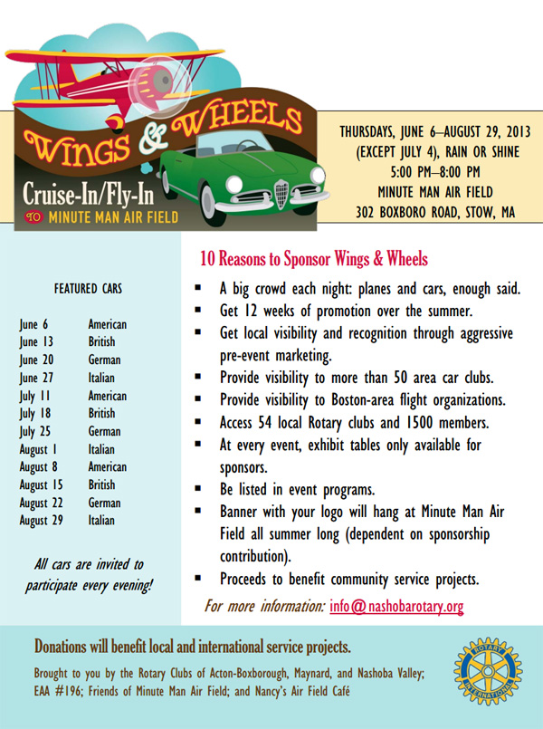 Three times a year, the Wings & Wheels Cruise-In/Fly-In at the Minute Man Air Field in Stow, MA, holds an Italian night. The final one for 2013 is coming up this Thursday, August 29th. Let's make it an Alfa gathering and show up in force! Check the flyer below or click here for times, directions, and contact info. Whaddaya say?