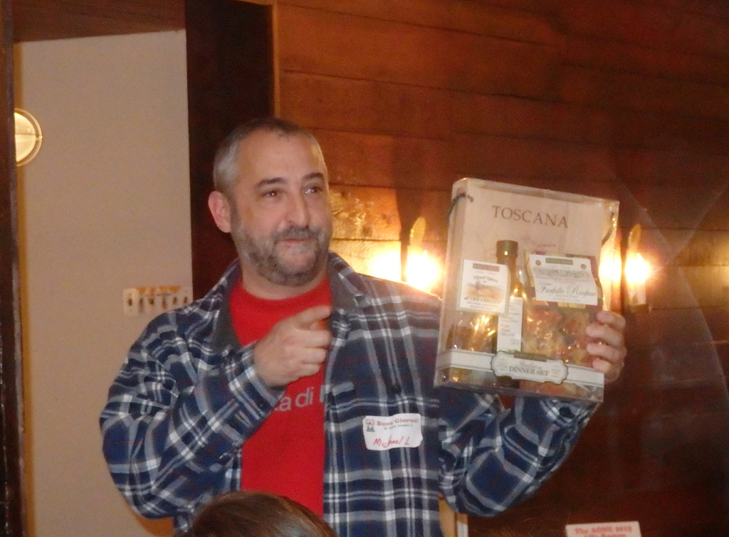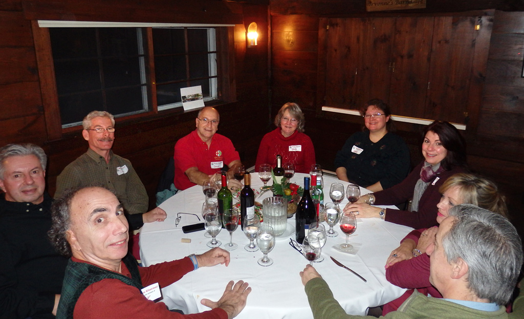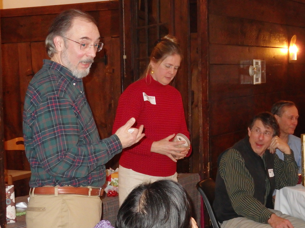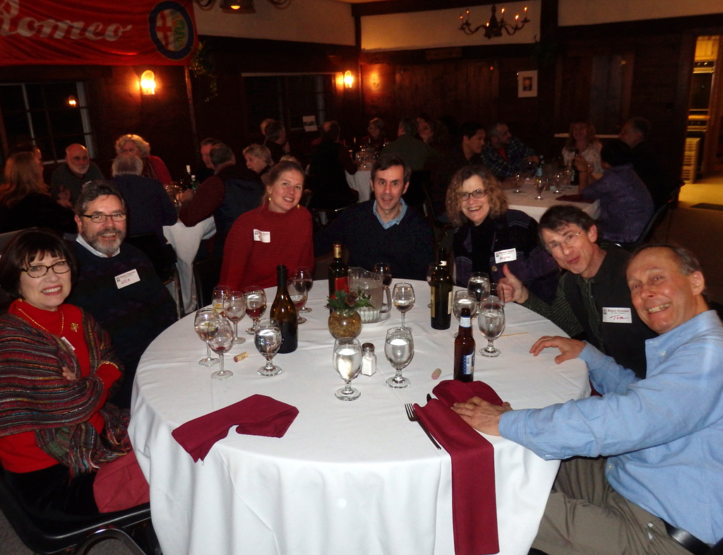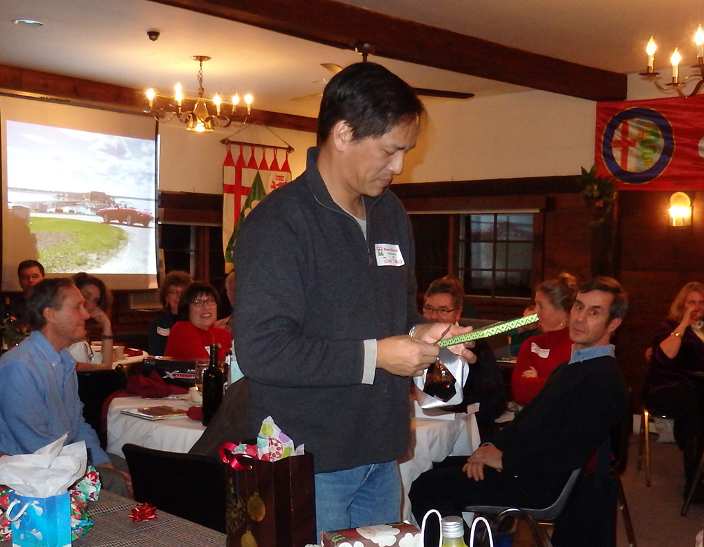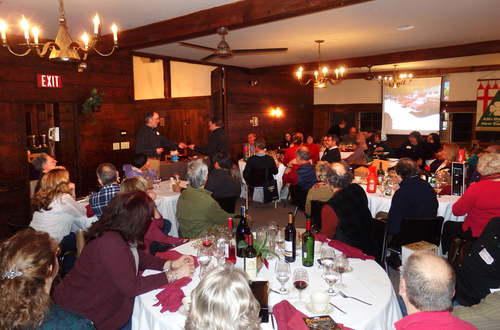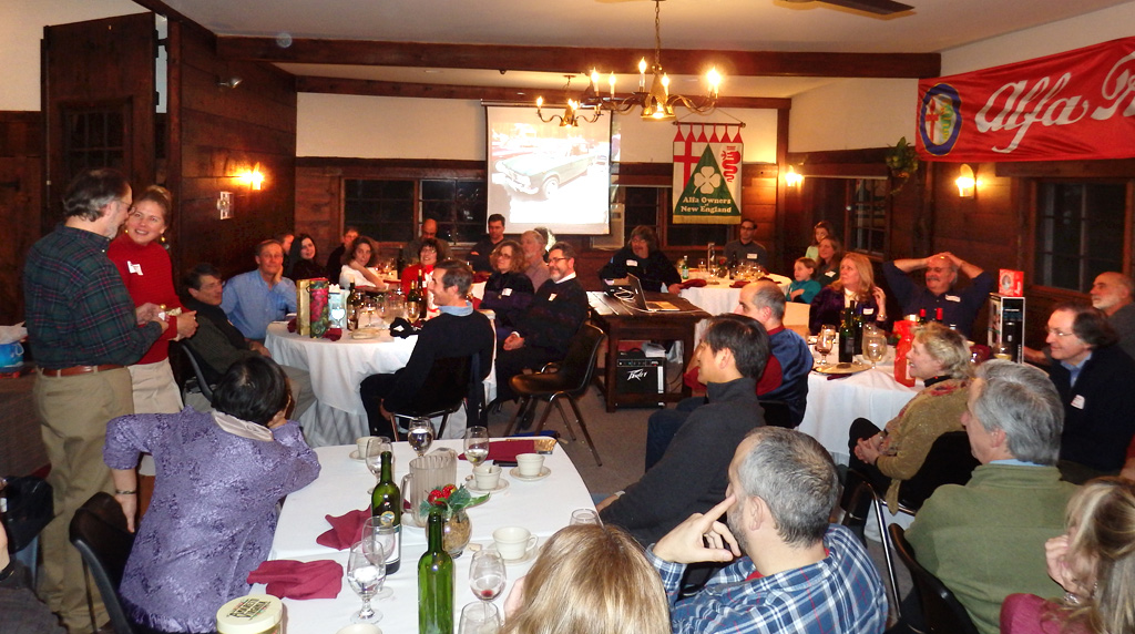 Text and photos by Dave Pratt Another boffo time was had by all at this year's AONE Holiday Party, held on December 20th at the Josiah Smith Tavern in Weston, MA. There'd been a little concern that, being so close to Christmas, the turnout might suffer due to other holiday commitments, but such was not the case. Well over forty people were on hand to enjoy the festivities! The revelers started rolling in around 4 PM and the party was soon in full swig, errrr, full swing. We uncorked our holiday beverages and gathered in impromptu groups to regale each other with Alfa and non-Alfa chatter. Our most excellent caterer of these past several years (Tastings Caterers of Framingham) came around to us with various appetizers as well as providing a separate table with more pre-dinner goodies. It was hard to show restraint, knowing that dinner was still ahead. To provide a backdrop to the frivolity, we had a slide show running with over 250 photos taken at AONE events throughout the year that's nearly behind us. This was accompanied by a swingin' set of holiday tunes playing softly in the background. Then the main course was brought out — courses, to be more accurate. There were many various dishes to choose from, highlighted by their signature lobster ravioli and a meatloaf that far surpassed its pedestrian name, but all of the entrees were delicious. So we loaded our plates, took them back to our tables, and proceeded to dine with gusto. Before too long, the chafing dishes were replaced with several trays of Tastings' memorable assorted desserts, and coffee and tea cups were filled. All of this was accompanied by much boisterous holiday cheer. Afterward came the eagerly anticipated Yankee gift swap. There were many wonderful (and otherwise desirable) presents that got unwrapped — sports car books, car care tools and supplies, blankets, scarfs, wine, Alfa models, and of course a few bottles of limoncello, just to name a few. A lot of the gifts were so good that people elected to keep them rather than swap, but a number did change hands, and we noticed that a fair amount of bartering also took place after it was all over. Much fun! When the AONE Holiday Songbook was passed around, a lot of our attendees headed for the exits (with good cause), but several stalwarts helped to butcher the Alfa-centric holiday tunes, which this year used the arrival of the Alfa Romeo 4C as a theme. Gradually, the party broke up and everyone headed homeward, full of great food, bearing their swapped gifts, and bursting with holiday cheer. Our thanks go to President Tom Lesko for making all of the arrangements for this, our final 2014 event, and for not playing his holiday opera music.