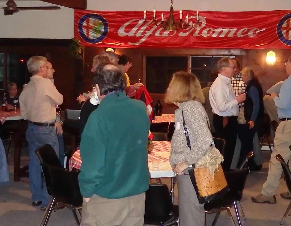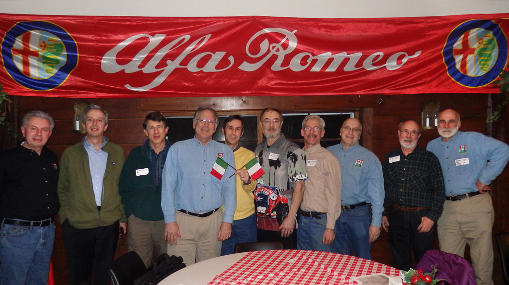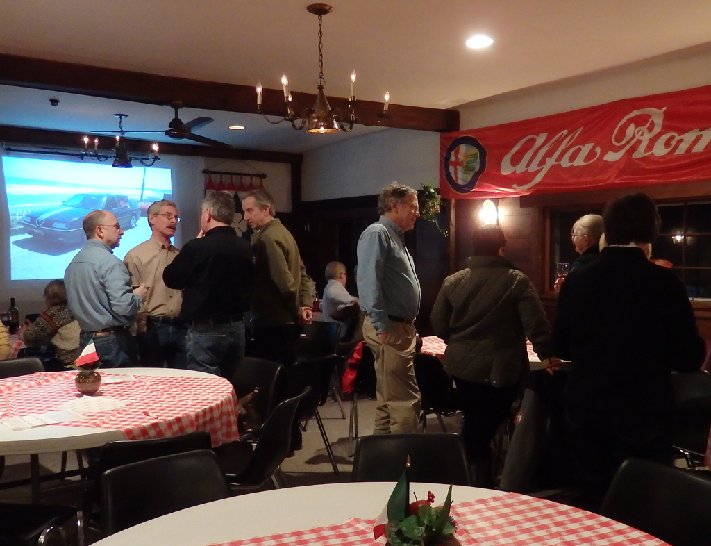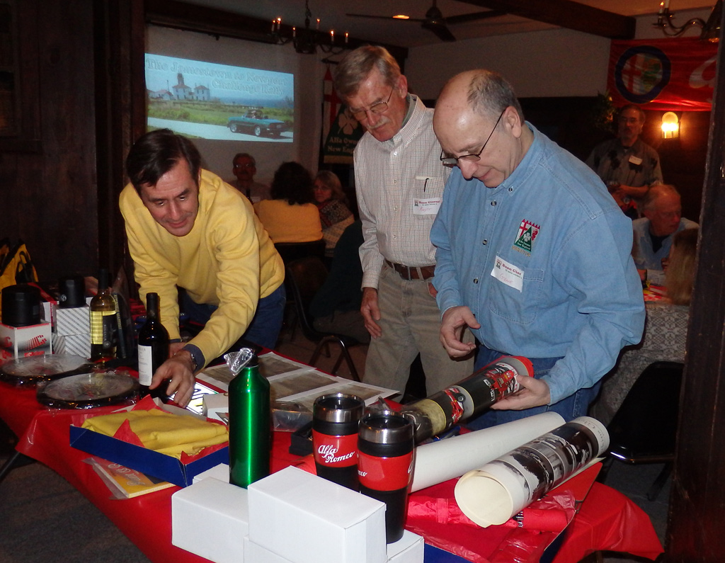 Text & photos by Dave Pratt Another Party has come and gone! This time it was our annual AONE Winter Potluck Dinner Party that took place on February 8th. Unlike last year, which required a couple of foul-weather postponements, we snuck this one in right on schedule, between this winter's manifold snowstorms. Well over 40 of the Club Faithful gathered once again at the Josiah Smith Tavern in Weston, MA, for an evening of fun, food, and frivolity. And it seemed like we were a more boisterous bunch than usual! We often get several members who travel respectable distances to attend our functions, coming up from Connecticut and Rhode Island and down from Vermont and New Hampshire. But this year's Farthest-Traveled Award (if we gave one) would go to Dan & Susan Nicholes, who make their home in Fredericton, New Brunswick. Great to see you again! As people arrived, we all hung around for a while, chewed the fat, and sipped on the various libations we'd brought. Providing background was a free-running slide show of photos from last year’s AONE events, compiled by President Tom Lesko. Eventually, someone suggested that we should eat, so all the food came out. As usual, it was quite a fabulous feast! Several various types of pasta, salads, breads, calzones, and soups — a wonderful assortment. An equally diverse array of fine desserts followed afterward. During the evening, Peter Bourassa of Motorsports Marketing Resources (MMR) passed around a "galley proof" copy of a forthcoming book on Alfa Romeo entitled View from the Mouth of the Dragon by S. Scott Callan of Velocity Group. After dinner, Peter gave us a quick briefing on how the book came about. Everyone who saw the proof agreed that it's going to be a stunning addition to any Alfista's library — click here to visit a web page that gives an excellent idea of its quality. Peter also contributed some MMR wine to the door prize table. Then came the main event: AONE Director George Dolak graced us with a presentation showing pictures of and talking about his recent trip to South Africa where he and others did a "Mille Miglia" (thousand mile) tour ... in Alfa Giuliettas! The photos and videos of the cars, the roads, and the scenery were extraordinary, and everyone came away quite envious of George's experience. In case you missed it, you can click here to see the online version of Mille del Capo! Finally came the door prizes. There were lots of goodies for everybody, some more Alfa-related than others. There were everything from Alfa Romeo clocks to tools to travel mugs to shift knobs to patches/pens/key fobs to oil filters. Special thanks go out to the following Alfa parts suppliers for their kind donations: International Auto Parts in VA, Jon Norman's Alfa Parts in CA, DiFatta Brothers in MD, and Trail Auto Alfa in MI. Other door prizes were either donated by club members or purchased by the club.