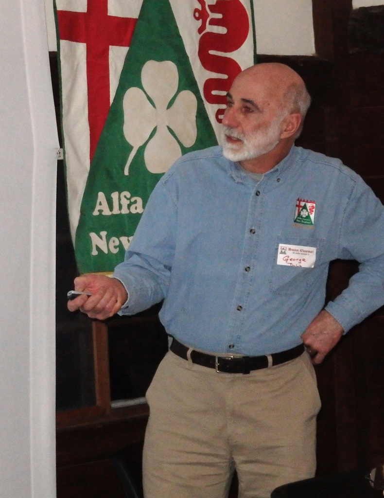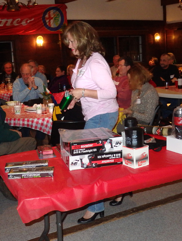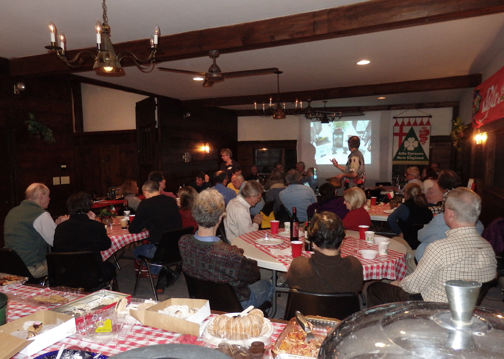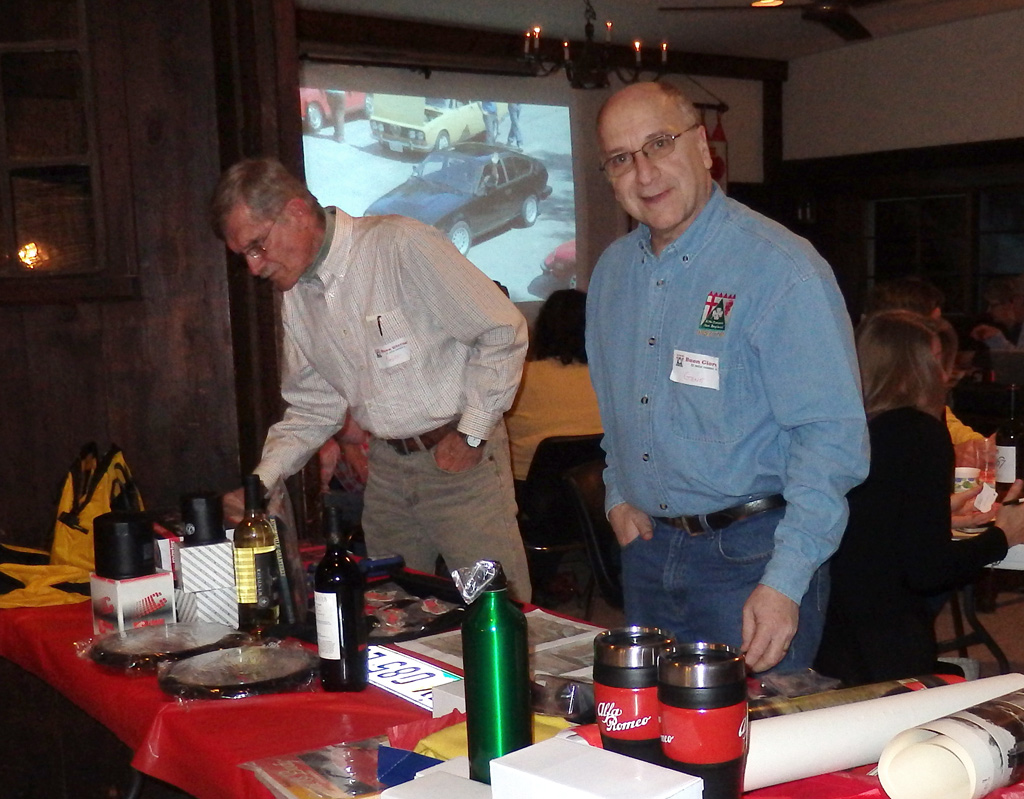 Text & photos by Dave Pratt Another Party has come and gone! This time it was our annual AONE Winter Potluck Dinner Party that took place on February 8th. Unlike last year, which required a couple of foul-weather postponements, we snuck this one in right on schedule, between this winter's manifold snowstorms. Well over 40 of the Club Faithful gathered once again at the Josiah Smith Tavern in Weston, MA, for an evening of fun, food, and frivolity. And it seemed like we were a more boisterous bunch than usual! We often get several members who travel respectable distances to attend our functions, coming up from Connecticut and Rhode Island and down from Vermont and New Hampshire. But this year's Farthest-Traveled Award (if we gave one) would go to Dan & Susan Nicholes, who make their home in Fredericton, New Brunswick. Great to see you again! As people arrived, we all hung around for a while, chewed the fat, and sipped on the various libations we'd brought. Providing background was a free-running slide show of photos from last year’s AONE events, compiled by President Tom Lesko. Eventually, someone suggested that we should eat, so all the food came out. As usual, it was quite a fabulous feast! Several various types of pasta, salads, breads, calzones, and soups — a wonderful assortment. An equally diverse array of fine desserts followed afterward. During the evening, Peter Bourassa of Motorsports Marketing Resources (MMR) passed around a "galley proof" copy of a forthcoming book on Alfa Romeo entitled View from the Mouth of the Dragon by S. Scott Callan of Velocity Group. After dinner, Peter gave us a quick briefing on how the book came about. Everyone who saw the proof agreed that it's going to be a stunning addition to any Alfista's library — click here to visit a web page that gives an excellent idea of its quality. Peter also contributed some MMR wine to the door prize table. Then came the main event: AONE Director George Dolak graced us with a presentation showing pictures of and talking about his recent trip to South Africa where he and others did a "Mille Miglia" (thousand mile) tour ... in Alfa Giuliettas! The photos and videos of the cars, the roads, and the scenery were extraordinary, and everyone came away quite envious of George's experience. In case you missed it, you can click here to see the online version of Mille del Capo! Finally came the door prizes. There were lots of goodies for everybody, some more Alfa-related than others. There were everything from Alfa Romeo clocks to tools to travel mugs to shift knobs to patches/pens/key fobs to oil filters. Special thanks go out to the following Alfa parts suppliers for their kind donations: International Auto Parts in VA, Jon Norman's Alfa Parts in CA, DiFatta Brothers in MD, and Trail Auto Alfa in MI. Other door prizes were either donated by club members or purchased by the club.