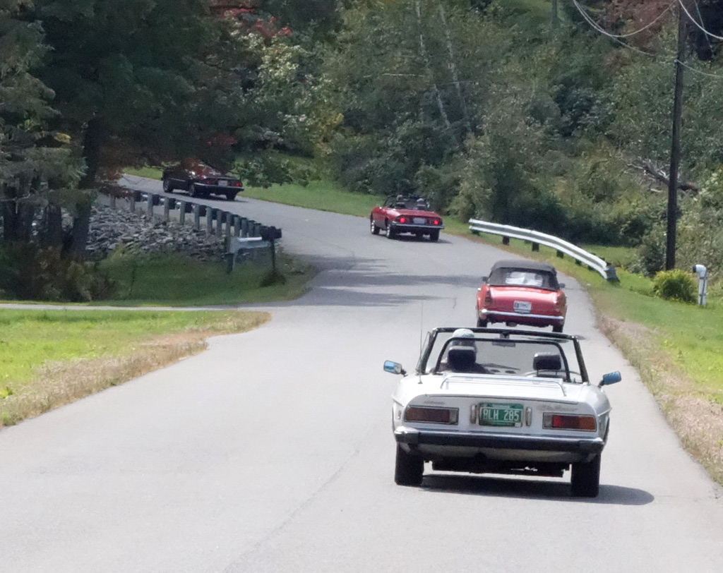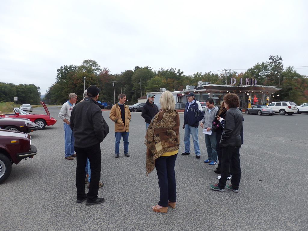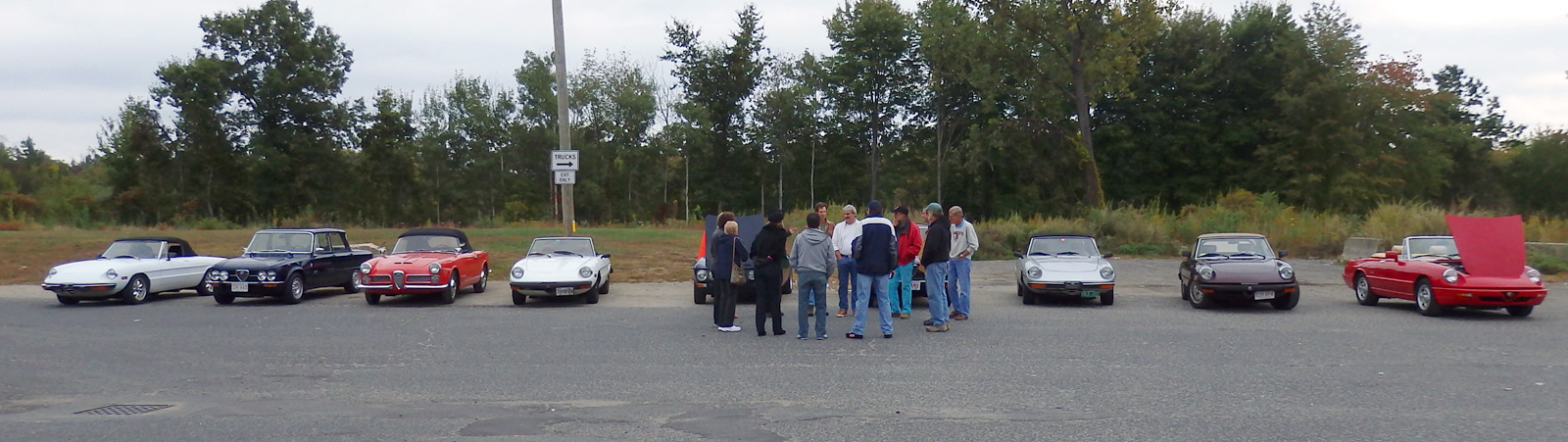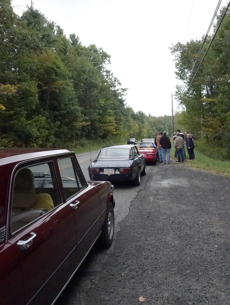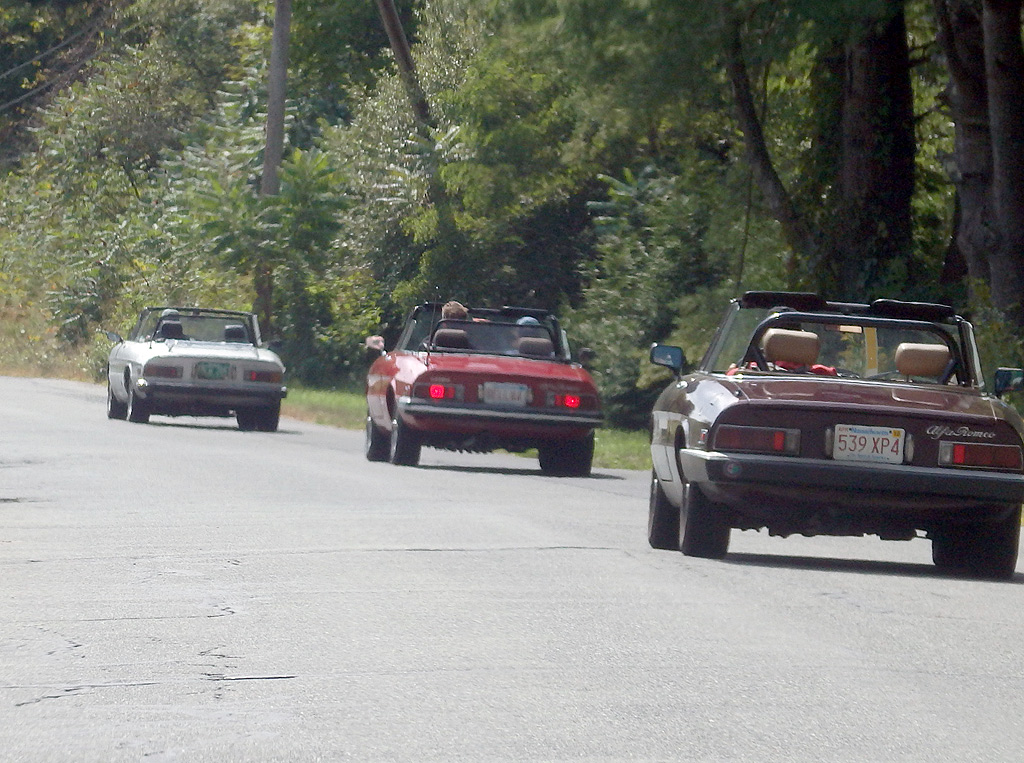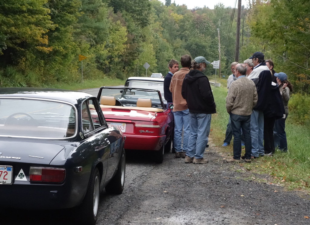 There was not much sun shining down on the parking lot at the Fillin' Station, but as more Alfas rolled, rumbled, and purred into the parking lot the smiles on everybody's faces at seeing old friends and beautiful cars provided a glow to the morning. Jeff Greenfield, last year's birthday boy and luncheon host, and his elegant wife Valerie came in their 1974 Berlina, complete with specialized license plate that appropriately reads ALFAMD. They brought along another very western Massachusetts resident and enthusiast of Alfa Romeos, and Pharoh Dogs, John Woodruff in the youngest and one of the sprightliest Alfas, a 1991 Spider. Filling out the lineup were Tom Freiberger, who got the morning off and showed up from Vermont in his computer-assisted silver 1974 Spider. Yes, he still has his Montreal (and his Giulia GT and his Lotus), but chose the Spider for this outing. Ready to give his recent engine rebuild a true test of high RPMs, opposing turns, and unexpected quick braking was Rich Rumelt, from Greenfield, Mass., in his 1979 burgundy Spider Veloce. (Phil does not recommend the Super 8 motel in Greenfield; maybe Rich has a better suggestion.) Rounding out the roster were ever club faithfuls Dave and Vivian Pratt in their (ahem!) "lesser" car. What? Yes, Dave and Vi have passed on to their nephew, along with a year's membership to AONE, their lemon giallo 1974 Spider. They can't give up the company of great Alfisti friends, though. (That includes you, reader.) Just in time for the drivers' meeting, thanks to Nancy's 8:30 am nudging Steve to wake up, were Steve and Nancy Perry in their 1978 Spider. Last-minute scratch entry Dan and Deb Donovan dropped out the night before due to an uncooperative 1988 Spider. They were sorely missed. Hope you can get the car in order for the Wachusett run. A quick briefing by Walker and distribution of route copies, complete with turn-by-turn directions and mileage and interval notes, saw everybody ready to get behind the wheel or in the navigator's seat. Cloudy skies meant that some tops stayed down, some stayed up, some debated the theory of occupants' age and outdoor temperature before determining if their top would be up or down. The hard tops remained in place and the cars negotiated into formation after engines snapped, jumped, clattered, or sputtered to a start, a true Italian sports car symphony. Giorgio did not get the pole position behind Walker in the pace car. That went to race-experienced Phil with Giorgio behind him. Next were the ever-great teammates Karen and Roger (FYI: they compete in Ballroom dancing, canoe and kayak competitions.) With anticipation of a lively drive, Rich and first-time tour attendee John closed in behind the Carlsons. Tom Freiberger, Steve and Nancy, Jeff and Valerie fell in ahead of sweepers Dave and Vivian. There would be shifting of position both during the drive and after the break. Unable to join the ride, Ken gave us a hearty wave as we made our first move onto Massachusetts routes 5 and 10, our entry to the hills and turns of Western Massachusetts. Our drive started out with a warm-up of a few turns, a pass through some remaining post-Sandy road construction, and a slow-down behind a FEDEX truck. As navigator, I intended to read Jane Eyre, but it quickly became clear to me that I would need one hand to hold my hat on my head and one hand for the "Oh, ***t" bar. With the only traffic lights of the route negotiated and all cars perfectly aligned behind him, as soon as the FEDEX truck pulled over Peter gave the pedal greater acceleration. All others followed suit and Jane Eyre and Rochester tumbled to the footwell. Thornfield may have had a mad woman in the attic; we had a few mad men in the cockpits. The drivers were all focused on the road and the car in front of them; navigators saw the landscape pass in a blur. Each yellow "curve-in-road" sign meant another acceleration. There were many such signs: to the right, to the left, squiggles, 90 degrees to the right at 15 mph, 90 degrees to the left at 15 mph, squiggle to the right, squiggle to the left, and dangerous curve. On a rare straight away, noted as 2 miles long, Giorgio made his move and gained the position behind the pace car. There may have been one or more over-takings. I don't recall; I was busy holding on and rescuing Rochester and Jane Eyre from the footwell. There were also yellow diamond signs warning of slow children, cows, horses, new oil and loose stone. Children don't play outdoors any longer; we could smell the cows, never saw any horses, and the oil was at least a week old, but we did slow down for the loose stone. We didn't want to mar the old or new paint jobs on our fine Italian ponies (and one German pony). After a breezy five-mile run down a 5-star road, we pulled into our pit stop, Berkshire East Ski resort. We took the opportunity to inspect and test the newly expanded facilities, get reacquainted, or settle some nerves. I shared my observation that each time Peter accelerated the clouds receded and the sun came out. Apparently desiring more sun Rich replied, "Well, then. Let's accelerate some more." Ready for more and looking forward to lunch, drivers and navigators remounted their steeds Mesrours and buckled in. Our Pilot carried on at a vigorous pace, circling back in the direction of South Deerfield, but somehow with minimal backtracking and not losing sight of our lunch date in the other direction. The sun came out as we accelerated through more turns followed by a six-mile straightaway. But then there was a cloud that no Italian pony screams could obliterate. Rich's steed seized up. Witnesses tell of hearing a terrible noise. Two tire streaks on the pavement showed exactly where his car's engine seized. Rich tells of knowing just what to do: throwing in the clutch, going into neutral and rolling to a stop. Fortunately, there was cell service (never dependable in the area) and those near Rich were able to contact Peter in the front. A