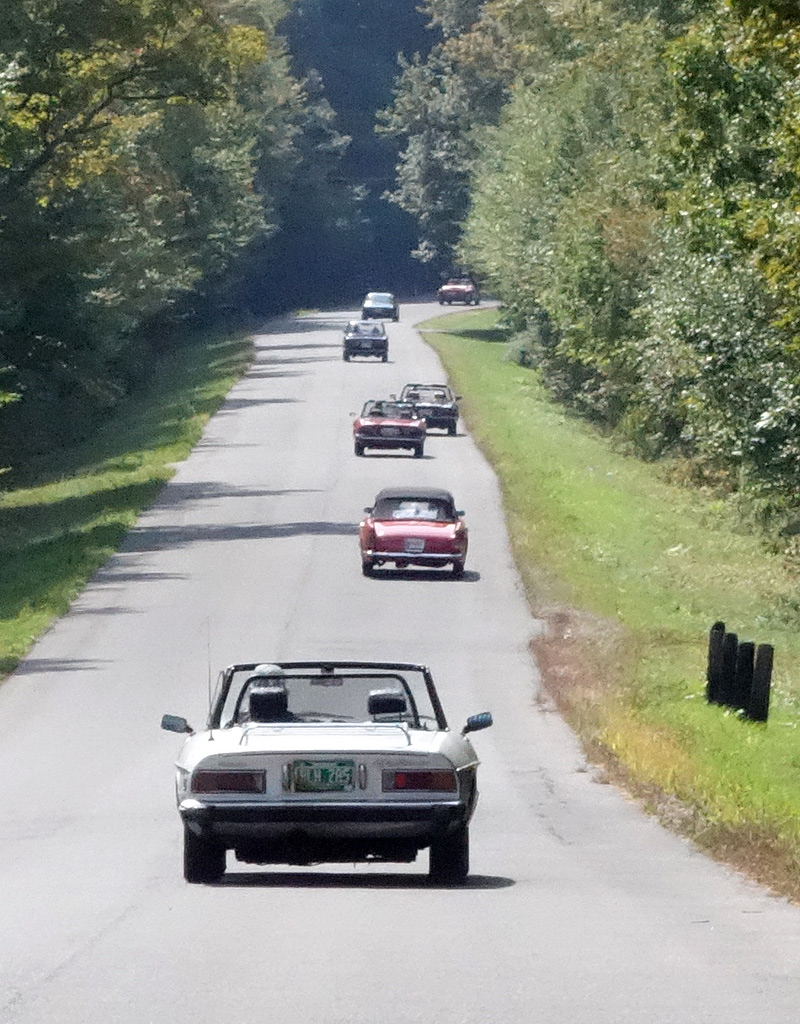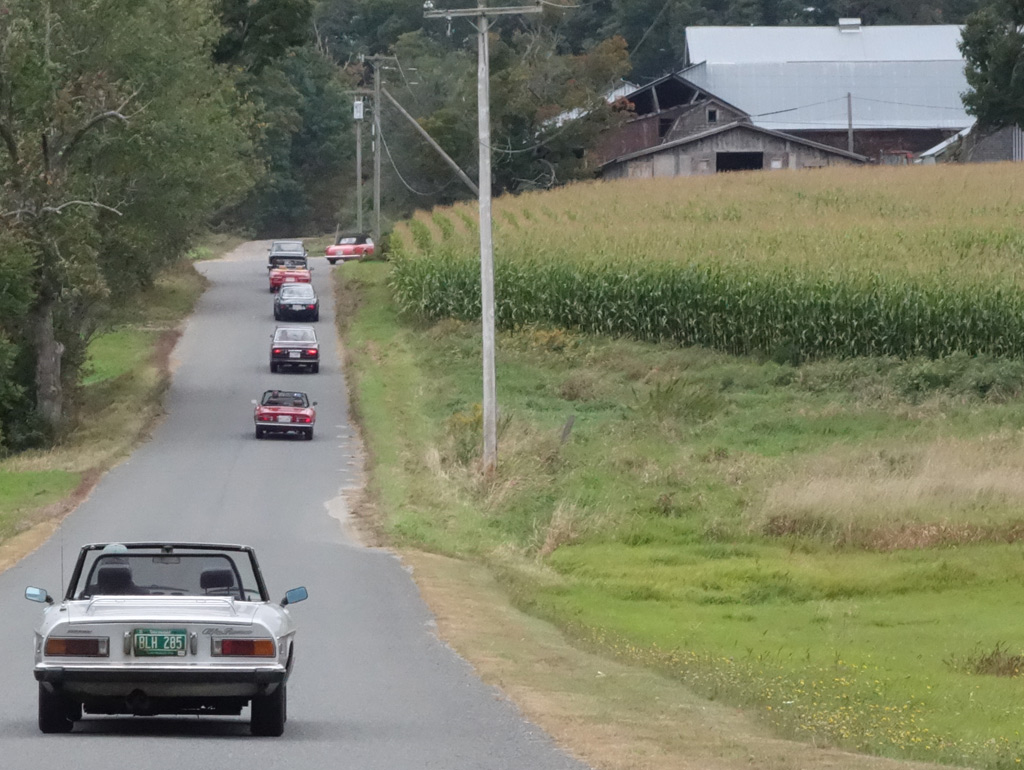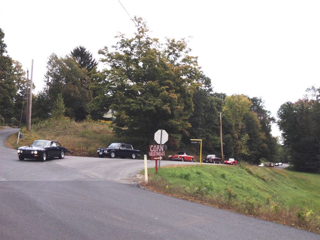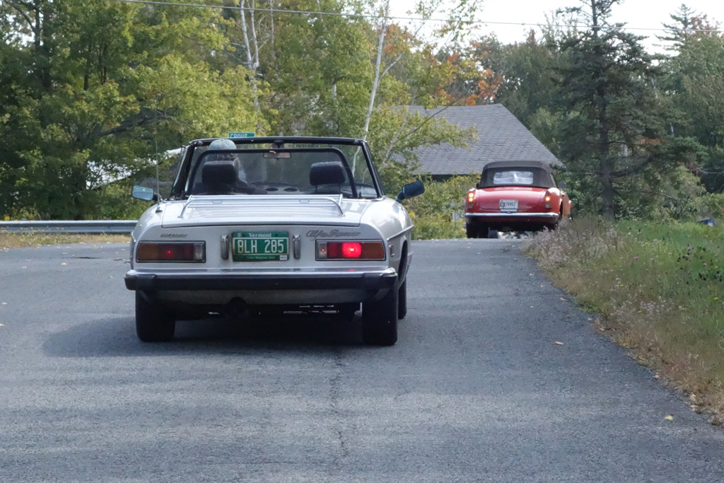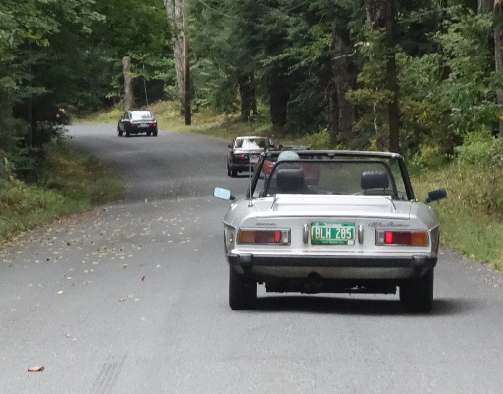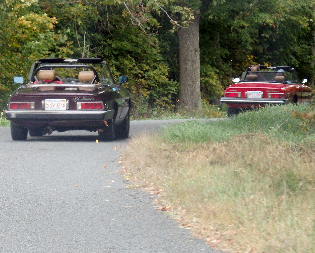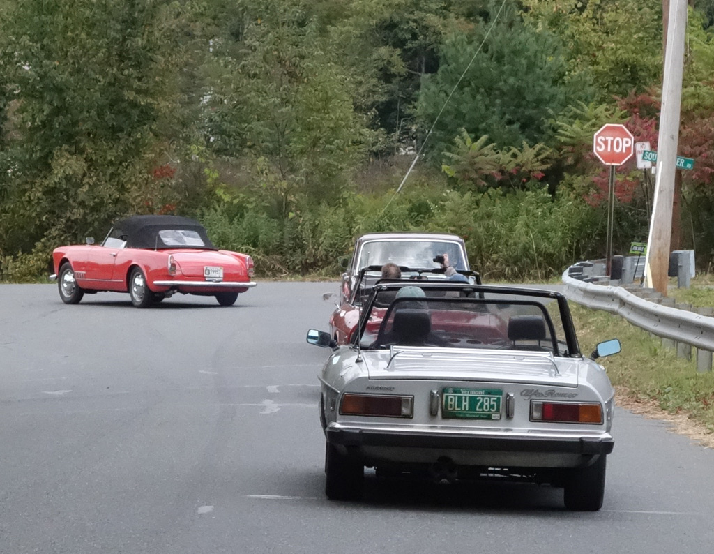 Peter Walker and Meg Anderson, hosts of the 12th Annual Indian Summer Sortie, arrived at the Whately Diner, known to AONE Alfisti as the Fillin' Station, to find theirs was not the first Alfa Romeo on the scene. Giorgio Kradjian from Billerica, Massachusetts, arrived early and first with the hope of gaining a good pole position. Roger and Karen Carlson, dedicated kayakers and Alfisti, arrived from Connecticut soon after Giorgio, their 1959 2000 Spider providing company to Giorgio's 1975 Giulia Nuova Super 1300 (well, it said "1300" on the back!). Here's a view of the prelude to the tour (that's Ken and Phil ahead of Peter and Meg):