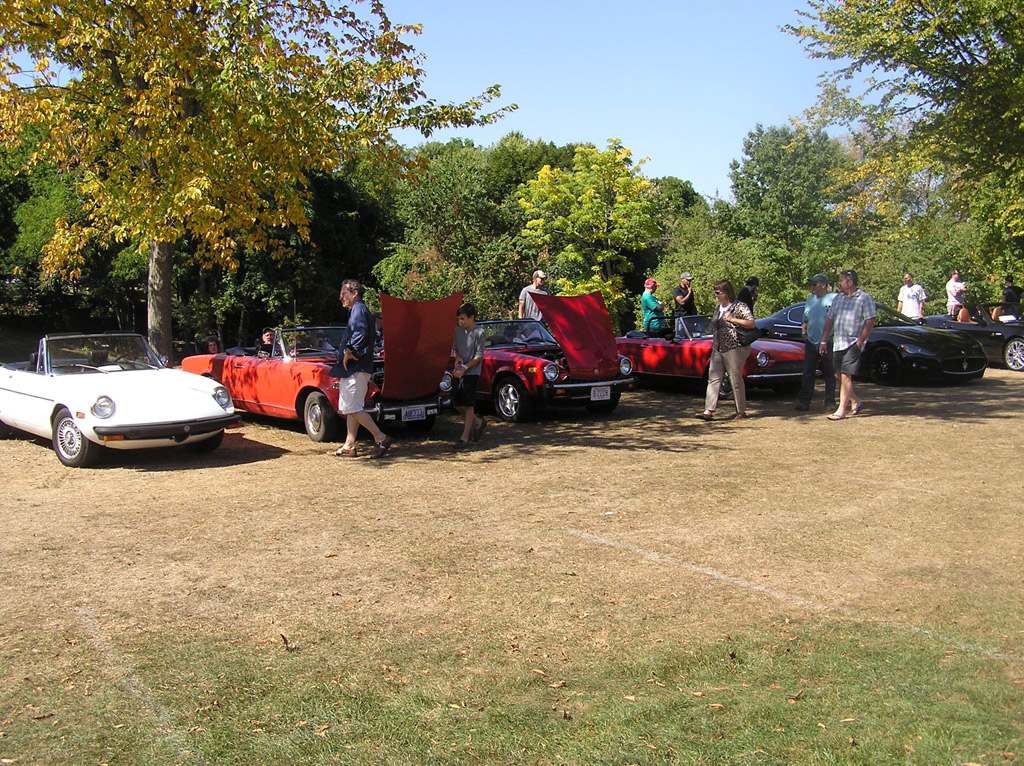 Long-time attendees of Tutto Italiano at the Larz Anderson Museum of Transportation will recall that the Museum used to schedule the event in May. But that is always a tricky time to schedule an out-of-doors event in New England. After a three-day nor'easter in May of 2005, the Museum began to schedule Tutto Italiano in early August, a time when the weather gods are more likely to smile on a car show. However, as this is New England, nothing, weather-wise, is ever certain. The few AONE faithful who attended the 2011 Tutto Italiano will remember the small turnout of cars, the plastic sheets over the convertibles (even though tops were up), and huddling under the AONE canopy, not just to stay out of the pouring rain but to generate body warmth!