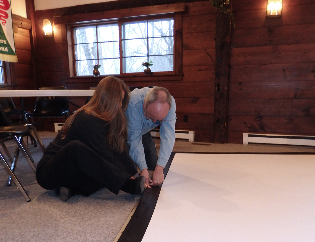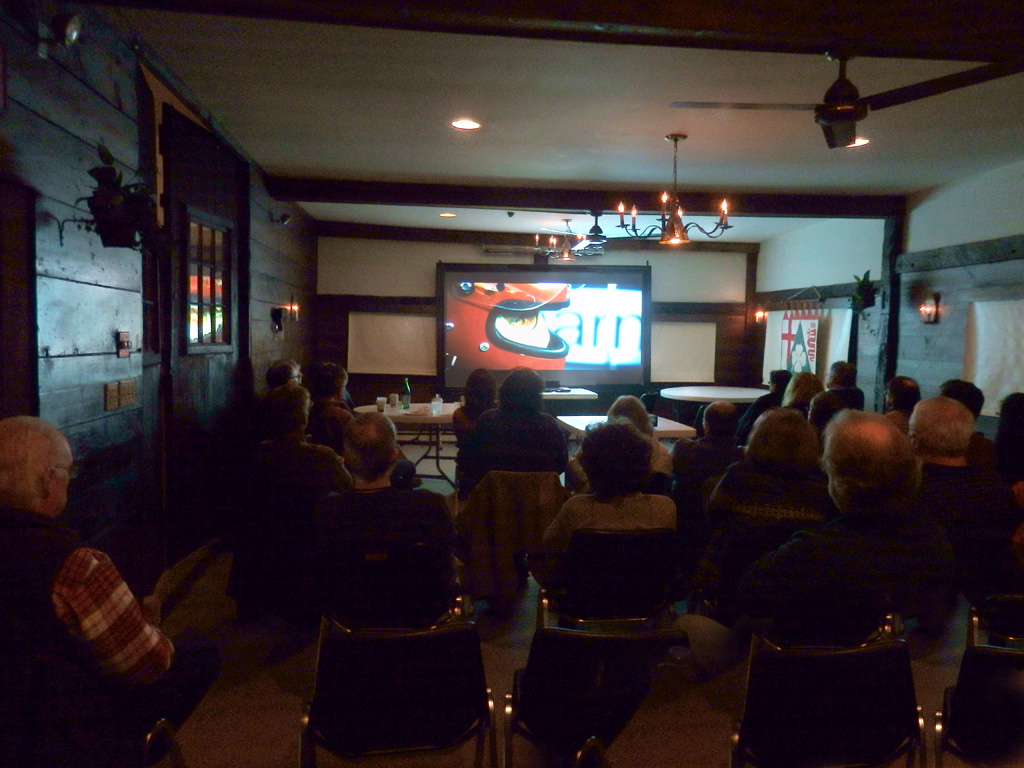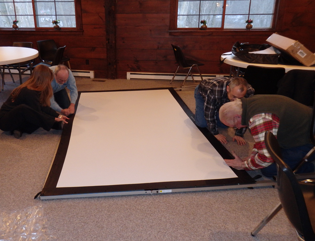 A few of the folks arrived early to set up for the affair, which included the club's new audio/video equipment. This consisted of a modern video projector, 5.1-channel surround music system, blu-ray/DVD disk player with amplification, and 120" projection screen. Setup went well, although stretching the screen to fit its frame truly required a team effort. Once it was all set up, connected together, speakers strung, loose wires taped, and powered up, we breathed a sigh of relief when everything appeared to be working.