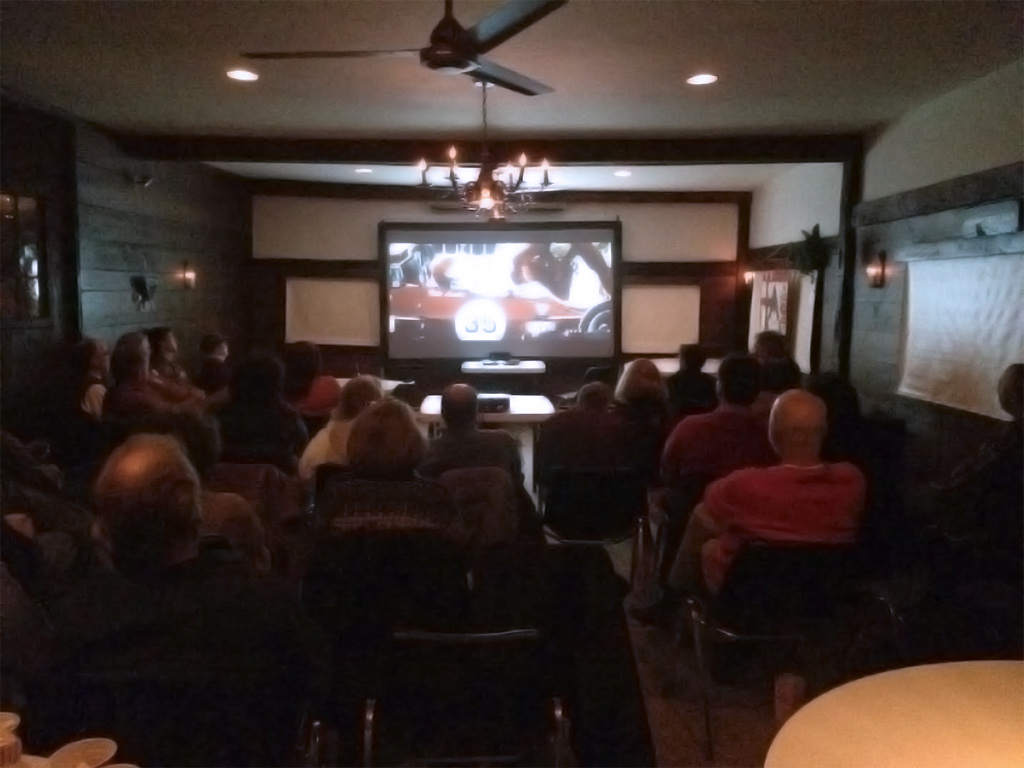 Then it was movie time! We pushed the tables back and rearranged the seating theatre-style, dimmed the lights, found the "Play" button, and let 'er rip. Peter Walker and Meg Anderson had brought popcorn for us to nibble on, even supplying proper theatre-style popcorn boxes. Ron Howard (a.k.a. Opie Taylor) did a first-rate job with the film, mixing tales of rivalry and romance with stunning Formula One racing footage. Everyone enjoyed the whole thing thoroughly, and at the end of the film the crowd even broke out in applause. Equally stunning was the way our new budget A/V system performed, providing big, bright, crisp images and full, deep, clear sound. See the quote at the top.