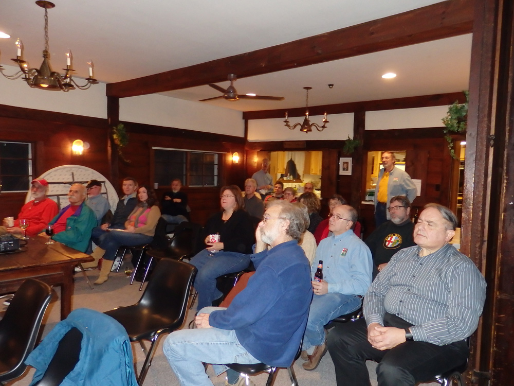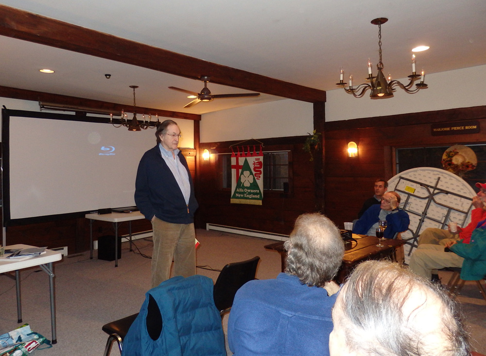 AONE Movie Night Wins Another OSCA! On November 20th, AONE held its second "Pizza and a Movie" night at the Josiah Smith Tavern in Weston. It was another well-attended affair — the movie night idea seems to have really struck a chord! People started gathering around 4PM (except for a certain Alfista who intended to come but thought it started at 6!). We milled about for a bit and poured ourselves some beverages, and batches of popcorn were passed around to get us in the spirit. At 4:30, right on schedule, Phil Bostwick gave us a few words of introduction to the movie we were about to watch: The Racers, a 1955 film starring Kirk Douglas, Bella Darvi, Cesar Romero, and others. Phil, who's a self-described movie buff, gave us some insight into how the film was made, including Kirk learning to drive a race car from Phil Hill, who was an advisor to the film.