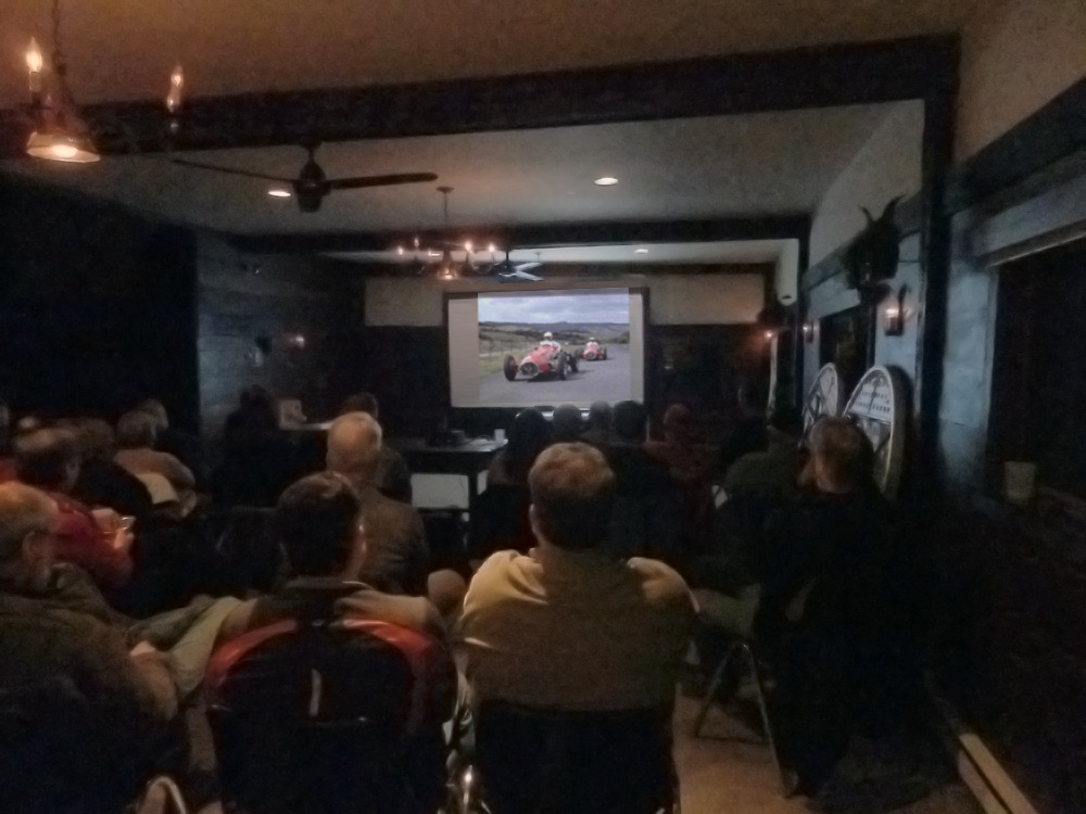 When the lights came up, the pizza came out, and everyone attacked them with relish too (well, not literally). There were barely a couple of slices left over! We had salad as well, and the club provided soft drinks and coffee plus our BYO beverages to accompany. After the pizza ran out, we went back to our seats for the "second feature": excerpts from Phil's collection of motor racing videos that included movies of some 1950s sport car races and some Formula One races in Europe during the fifties. Fun stuff — and the real thing. Thanks, Phil! Finally, we packed up and headed home, already looking forward to the next AONE Movie Night on January 10th. This one will feature Grand Prix, a 1966 film starring James Garner, Eva Marie Saint, Yves Montand and others. We'll also show a short special that portrays how James Garner and the other movie stars were taught to drive formula two cars for shots taken after the races, and how the actual races during the 1966 season were filmed by Phil Hill driving a Ford GT40 with a camera mounted on the roof. Grand Prix is on BluRay (The Racers had to be converted from a VHS tape), so look forward to a great hi-def, surround-sound experience! Thanks go to Phil Bostwick, who provided us with the main feature plus the featurette films, as well as the knowledge about them that he shared with us. (If you haven't already, be sure to read Part I of his wonderful article, The Golden Age of Racing, which describes much of what went on back in the era.) Thanks also to Peter Walker, who made all the arrangements for the Tavern and handled the "ticket sales", and Tom Lesko, who brought along and set up the coffee and soft drinks. Oh, and to me for schlepping the AV equipment! [Comment by Phil Bostwick (at his insistence | |||