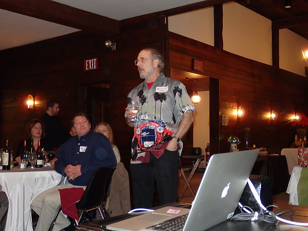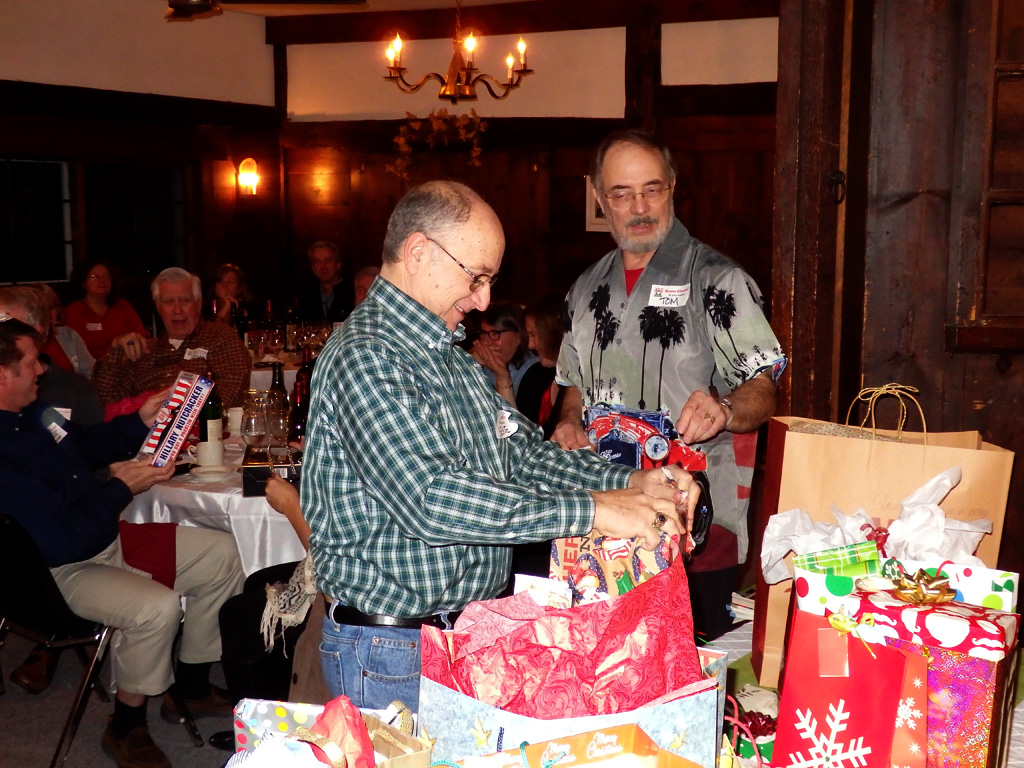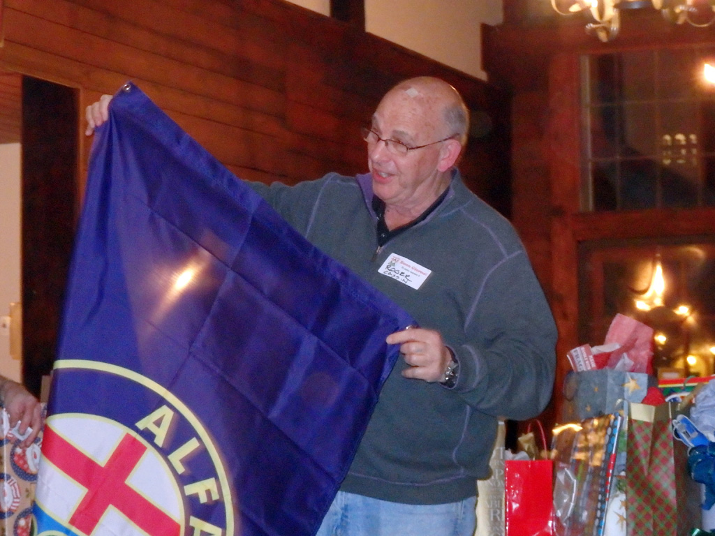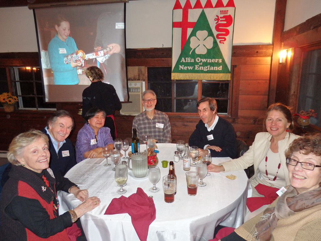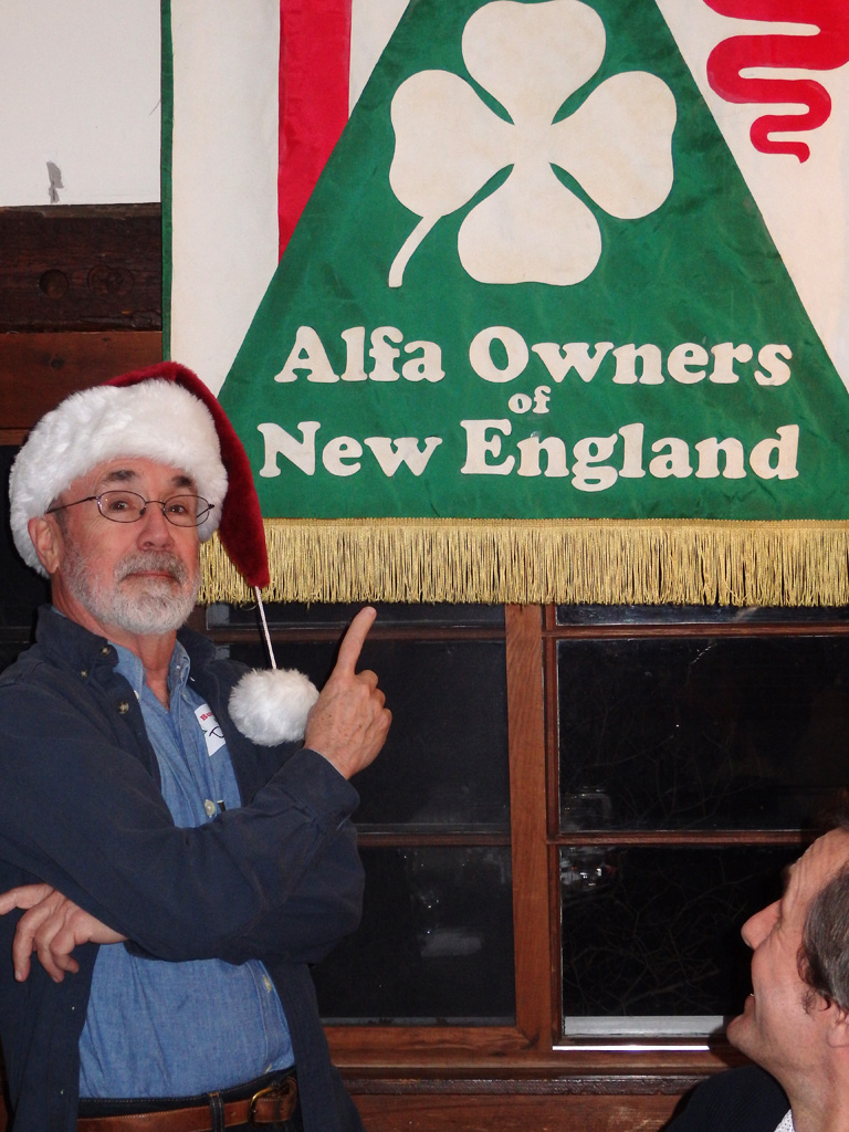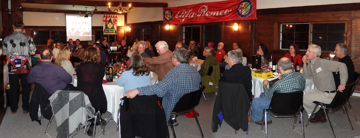 Text and photos by Dave Pratt Christmas in July? Not quite, but the temperature did climb up well over 60 degrees on December 12th, the day of our annual AONE Holiday Party. Besides providing good travel conditions for everyone, it meant that we had several Alfa Romeos parked in front of the Josiah Smith Tavern! Two of the Alfas were particularly notable: First, Phil & Mary Kotsios brought their stunning red Alfa 4C, and garnered the place of honor right in front. And Peter Walker & Meg Anderson arrived in their '77 Spider … with the top down — a first in Holiday Party annals! Honorable Mentions go to George Dolak who also brought a Spider and Greg & Andrea Stidsen who brought their '94 164Q. Be sure to check out the photos of them all. There was actually more tire-kicking outside at our Holiday Party than there was at our Spring Kickoff Meeting earlier this year, when it was cold and snowing! Once the forty of us were inside, we were welcomed by the congenial Tastings Caterers wait staff, who wandered among us offering their delectable hors d'oeuvres. We all cracked open the various beverages we'd brought and proceeded to enjoy the food, drink and each other's company. There was a table set up with even more offerings in the appetizer vein for our enjoyment. Also welcoming us were a free-running slide presentation displaying photos from all of our AONE events of the past year, accompanied by some jazzy holiday background music, prepared for us by President Tom Lesko. Also displayed on the big screen were some racing videos provided by AONE member / vintage racer Roger Cassin. Roger had an outstanding 2015 season, grabbing several checkered flags and winning the Gold Helmet award at the Vintage Racing National Championship. Soon, the main course was announced and we all eagerly queued up, since most of us could remember what excellent cuisine our caterer provides from previous years. And we weren't disappointed, as they once again came through with some truly outstanding fare. The forty diners were seated around five tables of eight persons each and, judging by the level of loud chatter and boisterous laughter, it was easy to tell what a great time everyone was having. After dinner, the revelers were forced, errr, encouraged to participate in our traditional holiday sing-along. Everyone was given a copy of our Official AONE Holiday Songbook containing popular holiday tunes, with lyrics corrupted to make them Alfa-centric. There were several new ones this year, honoring the actual availability of Alfa Romeos again at U.S. dealers, and a nod to the wonderful gathering of Alfas on Federal Hill at our National Convention in June. Finally, it came — the moment everyone was waiting for — the start of the Yankee gift swap! It's always such a hoot, and this year's was no exception. There was a wide assortment of diverse gifts … with one exception: there were seven bottles of Limoncello! Besides that, a lot of nice bottles of wine traded hands, as well as many other neat gifts, including scarfs, plants, car care products … and a Hillary Nutcracker. If you look through the photos, you'll get the idea. In case you ever doubted the existence of Alfa gods, consider this: Phil & Mary Kotsios, who graced us by bringing their new Alfa 4C and parking it in front, drew the two very best possible Yankee swap numbers from the hat: #1 and #40. 'Nuff said. When the swap was over, people milled around for a while and eventually started donning their light Spring jackets and drifting out the door. Except for Ki Basel, who found a jacket that resembled hers but wasn't! If you went home with a Patagonia jacket that isn't yours, please contact the Webmaster and he'll put you in touch with Ki, so you can arrange one final Yankee swap. Our thanks go once again to Tom Lesko for making all the arrangements for our revered annual Holiday Party. Great food, great venue, great people, great time! |