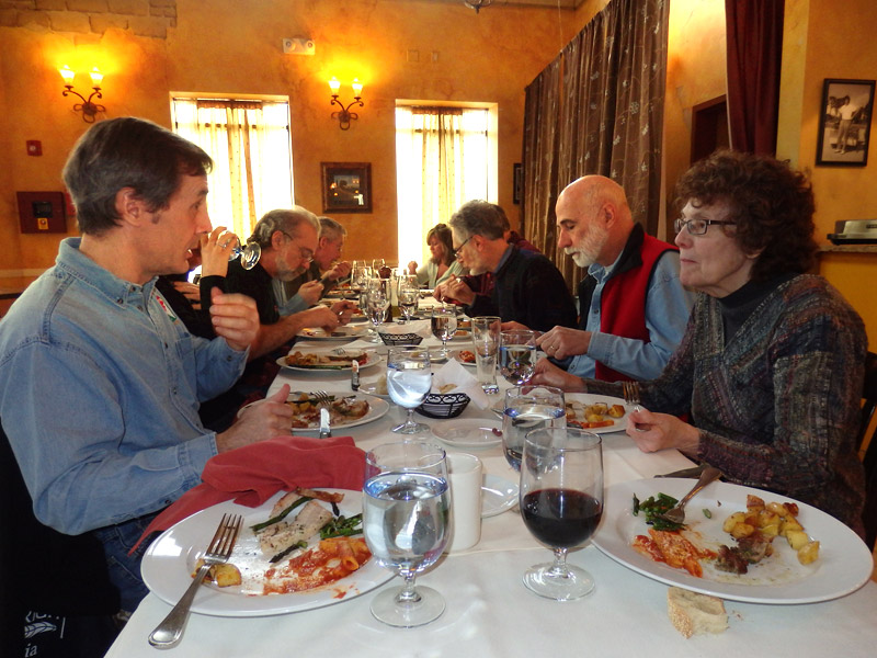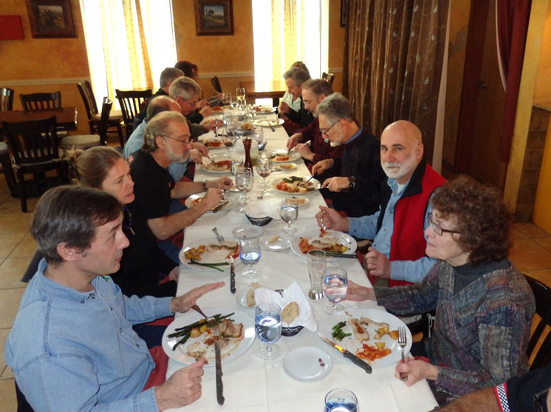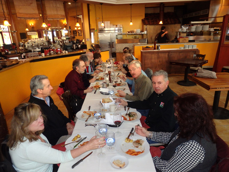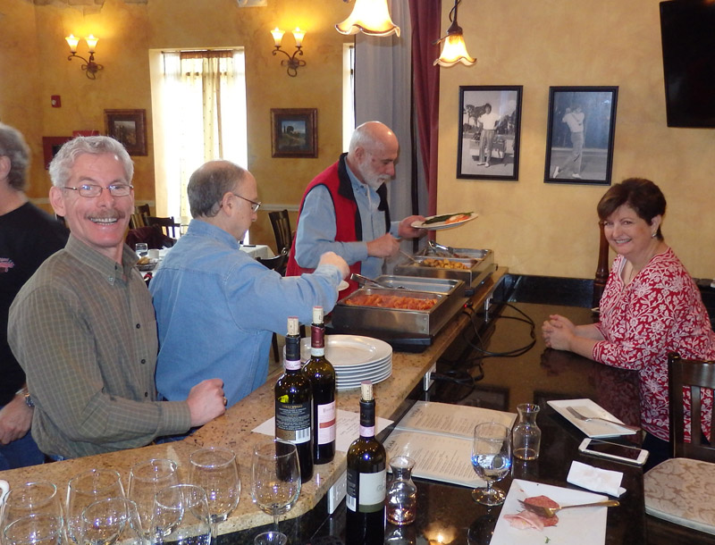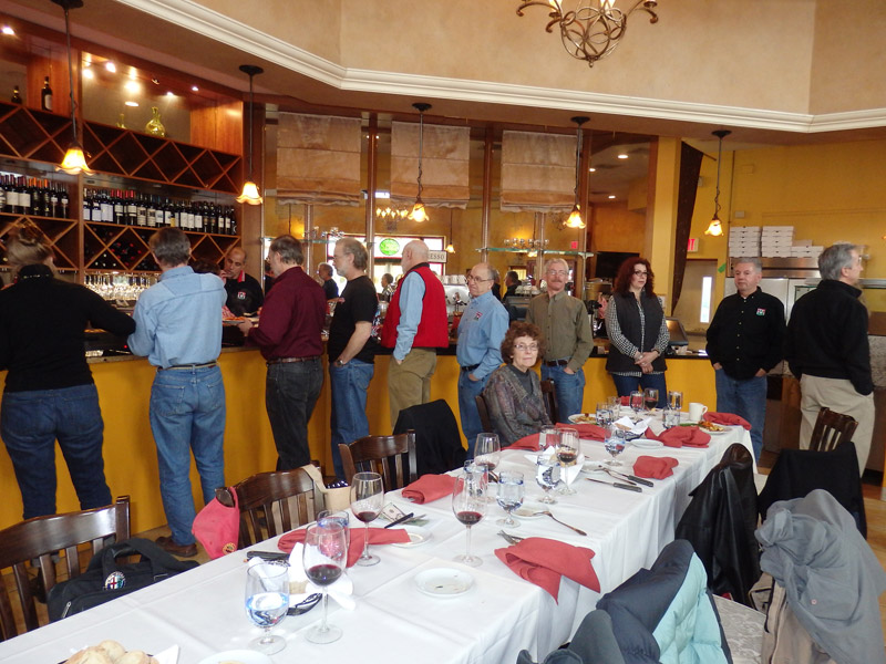 By Dave Pratt It was a record-smashing event! While in theory it may be Spring, this year's Winter-to-end-all-Winters simply refused to release us from its ruthless, frigid clutches, and it snowed on our March 28th Spring Kickoff! There wasn't a single Alfa Romeo in the parking lot, and that set an all-time record for an AONE event! And, because of that and the temperature hovering around freezing, the much-anticipated, pre- and post-luncheon, traditional Spring Kickoff outdoors bench-racing and tire-kicking just didn't happen. But indoors was another matter. We were greeted by AONE member Roberto Rosa and his wife Maria Iriti plus the chef and a couple of assistants at the wonderful Spiga Ristorante Italiano in Needham, MA. These fine people graciously consented to go ahead with the feast despite the modest turnout, and they have our sincere gratitude. Why not return the favor (and do one for yourself) by dropping by for lunch or dinner sometime soon? After shedding our Winter coats, we sought some Winter warmers in the form of wine, beer, and coffee, and spent some time gabbing (mostly commiserating about the Winter). Our hosts soon provided us with some excellent antipasto and bread to tide us over to the main course. Which arrived to our great enjoyment — penne pasta in marinara sauce, a succulent Italian roasted pork belly, grilled marinated asparagus, and Italian roasted potatoes. Everything was most delicious, as you can tell from our intent dining expressions in the photos! After dinner, President Tom Lesko chaired the "meeting" part of "luncheon/meeting", but kept it brief (as all "meetings" should be). We discussed some of the more near-term events on our 2015 schedule, which is rapidly getting fleshed out (click here for a quick view of our 2015 calendar). These included our May South Shore Beach & Waterfront Tour and June "G is for Georgetown" Tour, as well as the AROC National Convention in Rhode Island in June. Then it was back to business. In other words, it was time for dessert. Everyone recalled with fondness Spiga's signature Italian bread pudding from our previous gatherings there, and they graced us with it again! When you visit, make sure to give it a try — it's to die for. The "meeting" was adjourned around 2 PM and we put our coats, hats, and gloves back on to go out and brave the Spring. Once again, we thank Roberto, Maria, Chef Robert DiSimeone, and his staff for persevering with us, as well as Tom Lesko for making all the arrangements. Hopefully, the next time we're together it will be Spring! Winter Kick-in-the-Butt Luncheon Attendees Tom Lesko |