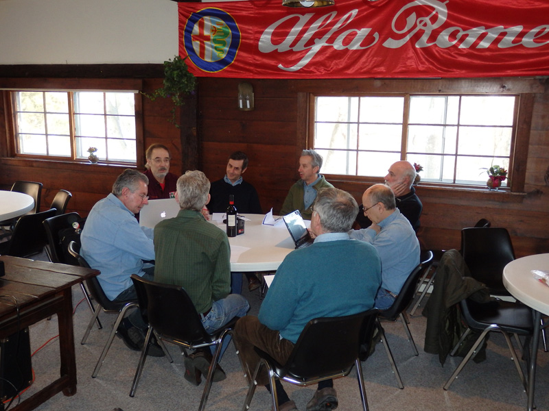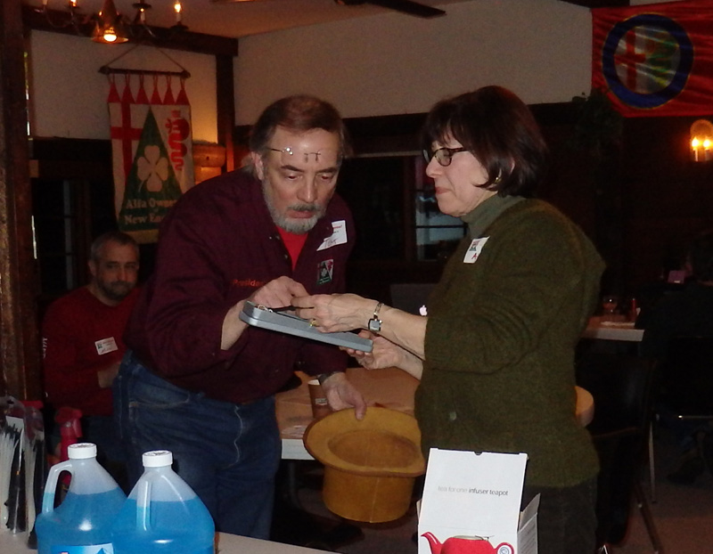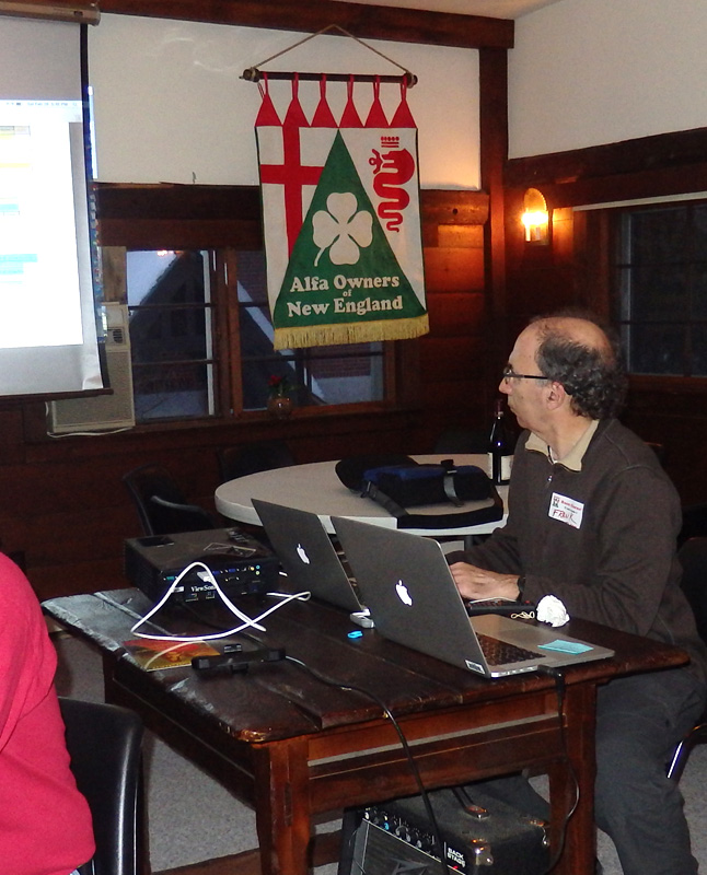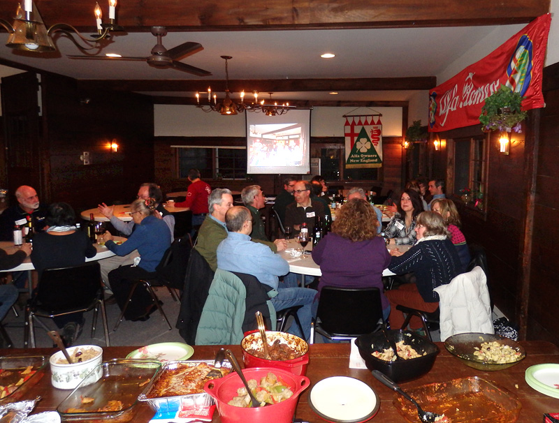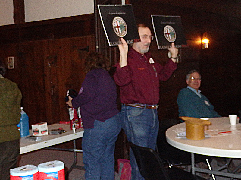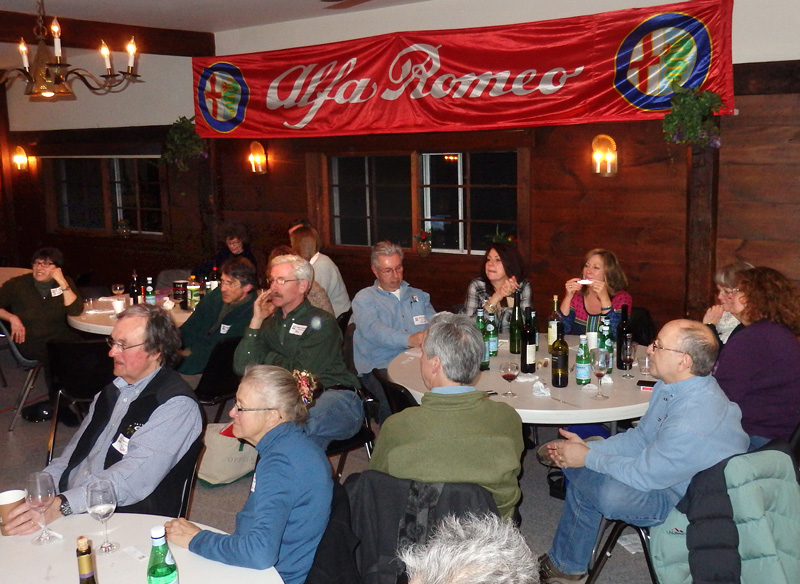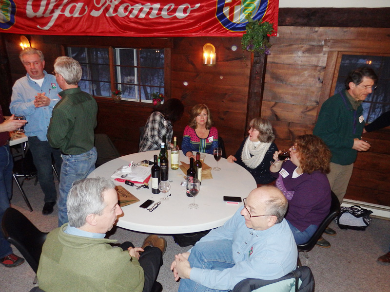 Text & photos by Dave Pratt Another Potluck under our belt! The annual AONE Winter Potluck Dinner Party took place on February 28th, and a fine time it was. With the winter we've been having, it was kind of surprising that we were able to pull it off without a single postponement! The turnout was a little smaller than usual (probably because people are tending to hunker around their home fires this year); nonetheless, nearly 30 of the Club Faithful gathered at the Josiah Smith Tavern in Weston, MA, for an evening of fun, food, and frivolity. And it seemed like we were an even more boisterous bunch than usual! An hour and a half before the party began, your AONE Board of Directors convened for a meeting to discuss several topics. These included a Treasurer's report, the upcoming club officer election, our involvement in the National Convention, ways to bring more sponsors on board, club merchandise to offer, and of course the array of events planned for 2015. A busy and productive meeting! Then the party-goers began to arrive and the meeting adjourned in favor of ... partying! We all hung around for a while, kibitzing and sipping on the various libations we'd brought. Providing background was a free-running slide show of photos from last year’s AONE events, compiled by President Tom Lesko. At around 6 pm, platters of various types of scrumptious food appeared on the large serving table and we all lined up with our plates (thanks to Peter Walker, who ran out for them to replace the ones Tom had left back home in his garage). It was quite a fabulous feast — some said the best ever! Several various types of pasta, salads, breads, calzones, etc. etc. — a wonderful assortment. An equally wonderful array of desserts followed afterward, accompanied by coffee (thanks to Dave & Vi who picked it up on the way to replace the coffee Tom forgot to get). Afterward, AROC National Director Frank La Sala of AROC-CT gave us a presentation on Alfamiglia Nordest, the AROC National Convention coming up this June in Rhode Island. This is a significant effort by the CT and NY chapters, with a lot of help from several AONE members. These guys seem to be on top of everything, and it's going to be a terrific gathering of Alfisti and Alfas right in our own back yard! Then it was time for the door prizes. There were more than enough to go around, some more Alfa-related than others. There were everything from Alfa Romeo wallets to tools to T-shirts to shift knobs to patches/pens/key fobs to oil filters and shop rags. Special thanks go out to three Alfa parts and accessories suppliers for their kind donations: Centerline Products contributed a box of door prizes and two $25 gift cards, DiFatta Brothers contributed a whole case of Alfa oil filters, and Alfaholics contributed several T-shirts and key chains. Please show them your appreciation by patronizing their businesses! Other door prizes were either donated by club members or purchased by the club.