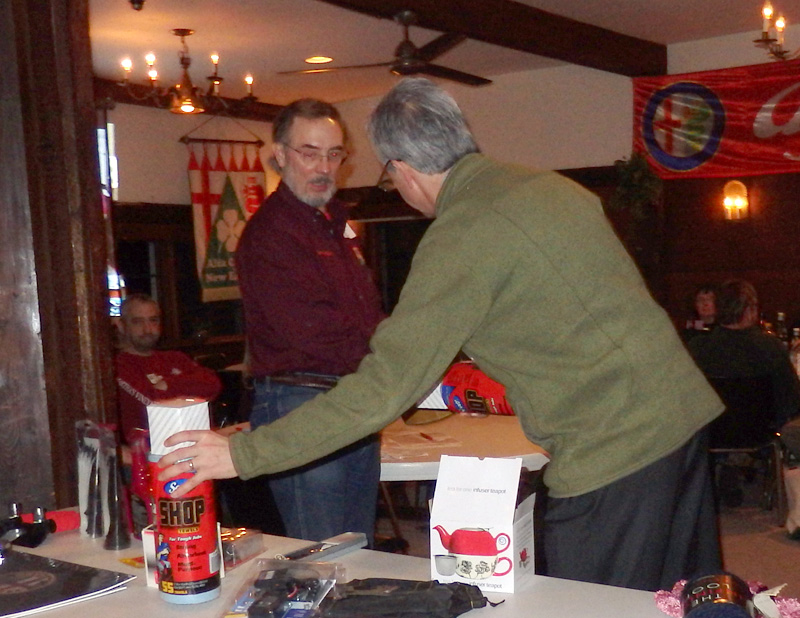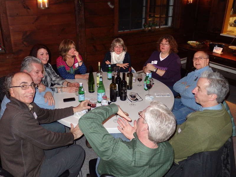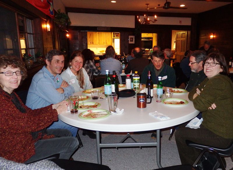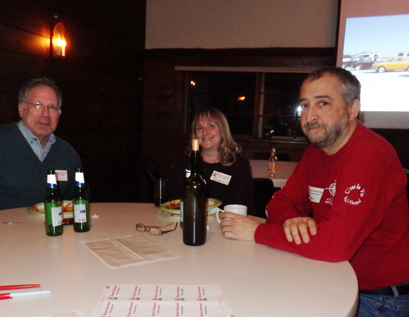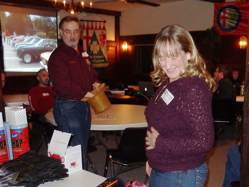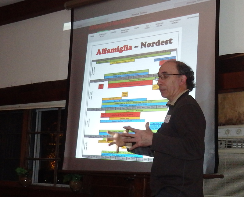 Text & photos by Dave Pratt Another Potluck under our belt! The annual AONE Winter Potluck Dinner Party took place on February 28th, and a fine time it was. With the winter we've been having, it was kind of surprising that we were able to pull it off without a single postponement! The turnout was a little smaller than usual (probably because people are tending to hunker around their home fires this year); nonetheless, nearly 30 of the Club Faithful gathered at the Josiah Smith Tavern in Weston, MA, for an evening of fun, food, and frivolity. And it seemed like we were an even more boisterous bunch than usual! An hour and a half before the party began, your AONE Board of Directors convened for a meeting to discuss several topics. These included a Treasurer's report, the upcoming club officer election, our involvement in the National Convention, ways to bring more sponsors on board, club merchandise to offer, and of course the array of events planned for 2015. A busy and productive meeting! Then the party-goers began to arrive and the meeting adjourned in favor of ... partying! We all hung around for a while, kibitzing and sipping on the various libations we'd brought. Providing background was a free-running slide show of photos from last year’s AONE events, compiled by President Tom Lesko. At around 6 pm, platters of various types of scrumptious food appeared on the large serving table and we all lined up with our plates (thanks to Peter Walker, who ran out for them to replace the ones Tom had left back home in his garage). It was quite a fabulous feast — some said the best ever! Several various types of pasta, salads, breads, calzones, etc. etc. — a wonderful assortment. An equally wonderful array of desserts followed afterward, accompanied by coffee (thanks to Dave & Vi who picked it up on the way to replace the coffee Tom forgot to get). Afterward, AROC National Director Frank La Sala of AROC-CT gave us a presentation on Alfamiglia Nordest, the AROC National Convention coming up this June in Rhode Island. This is a significant effort by the CT and NY chapters, with a lot of help from several AONE members. These guys seem to be on top of everything, and it's going to be a terrific gathering of Alfisti and Alfas right in our own back yard! Then it was time for the door prizes. There were more than enough to go around, some more Alfa-related than others. There were everything from Alfa Romeo wallets to tools to T-shirts to shift knobs to patches/pens/key fobs to oil filters and shop rags. Special thanks go out to three Alfa parts and accessories suppliers for their kind donations: Centerline Products contributed a box of door prizes and two $25 gift cards, DiFatta Brothers contributed a whole case of Alfa oil filters, and Alfaholics contributed several T-shirts and key chains. Please show them your appreciation by patronizing their businesses! Other door prizes were either donated by club members or purchased by the club.