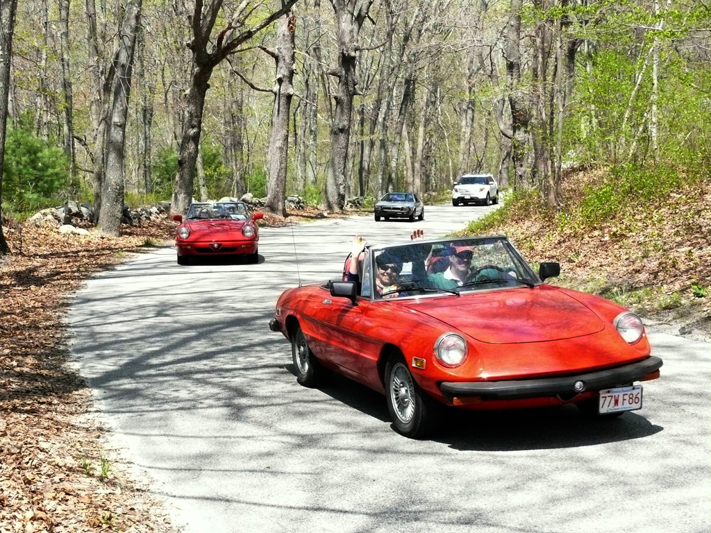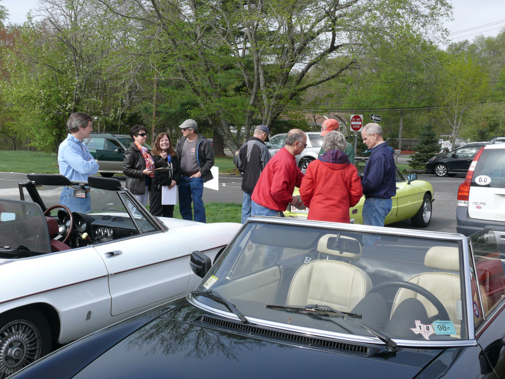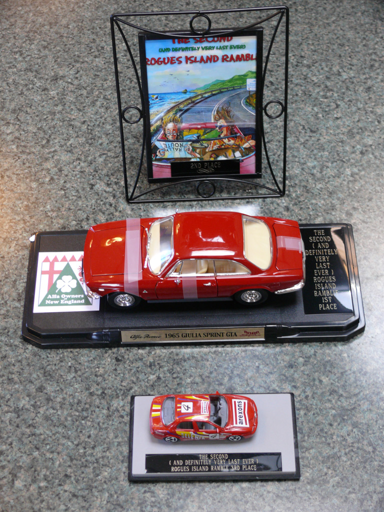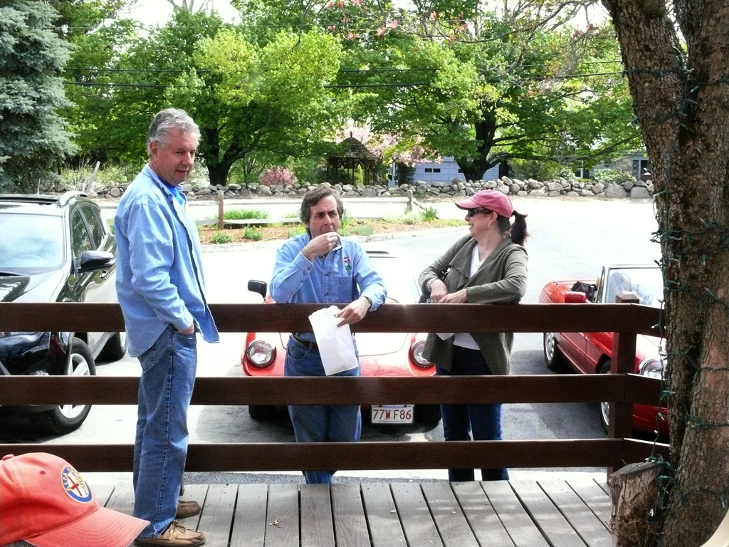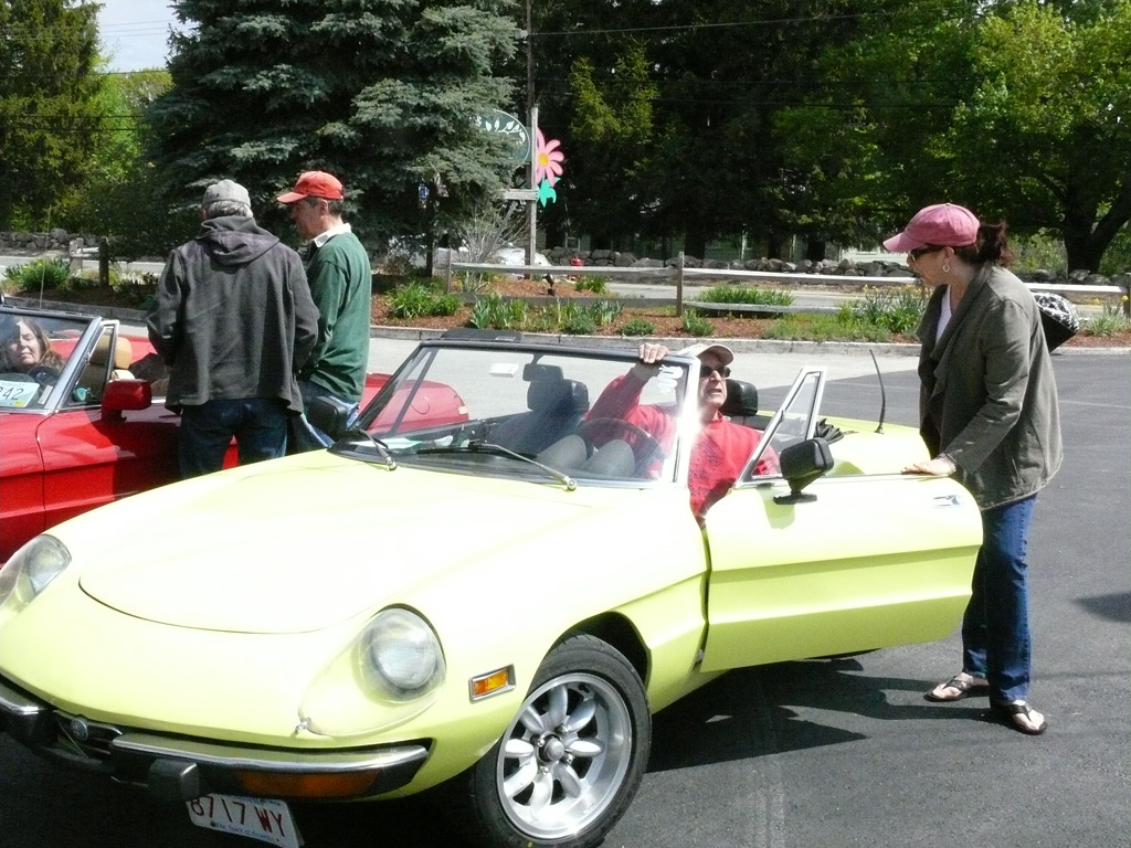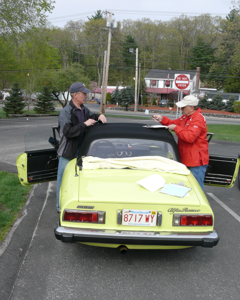 Text & photos by Tom "Let's-Tour-Now" Letourneau Presented here in its complete, original, unabridged, unedited, unadulterated, uncensored form! The 2nd and absolutely, positively, last (maybe) Rogues Island Ramble, a both Tour and Gimmick Rallye combined as one, is now in the history books. And, while I say Absolutely, Positive, Last (MAYBE)... that could well not be the case - there could be a 3rd-one. As I write this I have not, as yet, spoke with John DeWaele, but John has mentioned on more then one occasion he would like to see a Rallye/Tour some day all through his neck of the Rogues Island woods…that being Western and Southern RI and a wee bit of Eastern, CT. Despite my praying for rain…the day turned out to beautifully warn and sunny with everyone running the event…Tops-Down. What's that you ask…why was I praying for rain. Well, actually not for the event, but as my luck goes, I had 10days prior to the event, having put in a new $35,000.00 'Oh My God Septic System, and then spending $2,200.00 to have it landscaped, seeded and fertilized…it had not rained one single drop during those 10-days leading up to the Rallye. SO…I prayed for rain, knowing it wouldn't and it would be a great day for the event. (Makes sense?) Oh well…as stated the day was gorgeous…my only disappointment was what I felt was a very low turnout??? But, the diehards, and couple of 'Newies' also came! Maybe it wasn't a good idea to have it the day before 'Mom's Big Day'? But everyone that did come did do Mom's Day Shopping at both Phantom Farms and the Mt. St. Mary's Gift Shop. Lots of goodies, apple pies, Trapistine Candy, Jelly and Jams were the kinds of gifts that Mom's saw the following day! And, again, not to lament the low turnout…I really do wish that somehow we could, as a club, find out what our members really want in activities. I know we have done surveys, etc. and it also seems we are putting on the kinds of events asked for….but, we are just not seeing the kinds of turnouts that were once du Rigueur? Maybe because we are stretched out as far as we are, covering a 5-State area, we need move the events into other parts of the AONE Chapter's land mass. That being the case maybe we could get some of our NH, VT and Down east members to come-up with some ideas/events? Anyway, as to the event…while it was a Rallye, as mentioned we did have some members that came just to tour the beautiful back, curvy, challenging roads that were this year's course…and some that were a part of my last Ramble of a few years back. Peter Walker, an AONE Board Member and Carl Helmetag who showed up in his immaculate Lancia Monte Carlo. Other rallye participants included Ken and Mildred Green along with Barbara Smith and Robert Rupp. For those that chose to test their skills of observation and also trying to decipher the somewhat tricky questions, especially how they were worded, many of the questions were answered. As a matter of fact the winning team, Larry LoPresti & his lovely wife Michelle, won by answering one question more then did the 2nd-place team, and winners of previous Rallies, John and Lauren DeWaele. Actually, Lauren is the previous winner having won a few years back with her son, Sean, now in the U.S. Navy, on the carrier Roosevelt off the coast of "Over There"!!!. As mentioned in my write-ups leading up to this event it was my intent to have more questions then the norm, and many of a different structure (tricky and misleading) as I looked at this event as 'Training' for AONE members to insure they do well in the Alfa Nordest Convention Gimmick Rallye. As to the LoPresti's out-pointing the DeWaele's by one question… it was a Trick, Tie-Breaking Question, with a 10-Point value, that was the difference. As a matter of fact the LoPresti's were the only team to answer that question correctly…but, as we were to find out at the end of the Rallye, while having lunch at the Cumberland House of Pizza (I think everyone had CHOP's world famous 'Steak Sandwiches') the LoPresiti's, because of some unusual circumstances, had an unfair advantage. You see the many back roads I used in Saturday's event are also roads that the LoPresti's use to bicycle on…as such they have ridden by the spot wherein the answer to my 'Trick Question' was located. Allow me a moment to repeat that question here so that those of you that couldn't make this Rallye, but are looking forward to doing so in the future, will have an idea of what to expect for questions? The Angle Tree Stone, a nine-foot slate monument made by a father and son team that manufactured gravestone markers, replaced a tree that had long been used as a boundary marker between the Massachusetts Bay and Plymouth colonies. WHAT YEAR WAS IS BUILT? Sounds like a question easy enough to answer…doesn't it. All you have to do is look for a 9-foot high stone monument with a date on it? Well, that is exactly what everyone did…and everyone missed it. WHY…the Angle Tree Monument is located a ¼-mile down a dirt driveway, open to the public, encased in a brick building with Plexiglas panels on all 4-sides so that you can view the stone. When driving by the entrance to that driveway is a signpost that has a plaque on it telling you all about the Angle Tree Stone and when it was built. Sneaky, me…huh?? But, that is the fun of a Gimmick Rallye…being fooled, etc. Want another example? OK If you were heading East you might be able to see the Skyline of Boston. Then, again, if you were heading West you might be seeing the Skyline of Providence…or is it either of them. It could be Pawtucket, Attleboro, ???? Whatever 'Skyline' it is, I think it is to the South. That being the case 'What Direction' are you heading in? Or, how about this one? I think I'll have a cup of Constant Comment…NO, make it Earl Grey As the participants were riding down Ray Street in Wrentham, if they were paying close attention, they would have noticed an antique teapot hanging from a 