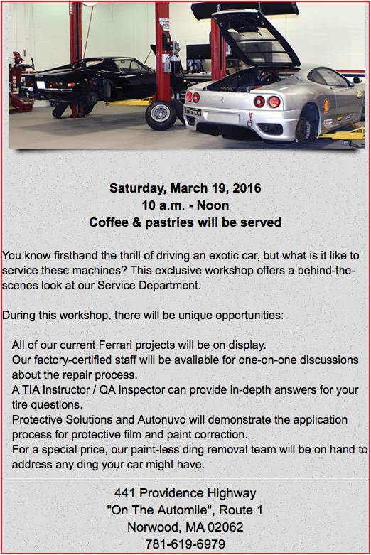 FErrari of New England (FNE) in Norwood, MA, has invited all AONE members to join them for their 2016 Workshop Open House on March 19th. This will be a great chance to witness a number of their Ferrari projects in progress at the shop. We'll also have an opportunity to see many new and used Ferrari and Maserati models on display. There will also be demonstrations of automotive protective film and paint buffing techniques. And they'll be providing us with coffee and pastries! If the weather and road conditions permit, bring your Alfa — that way, we'll dress up their parking lot! Especially you 4C guys — for sure, those Ferrari types will like to see what they're missing. Take a look at the announcement below and click here to view it on the FNE website. Please contact Tom Ducibella at tom@nanduce.com or 978-921-0125 if you plan to attend by 9pm, Thursday, March 17th, so that he can let FNE know how much pastry to get. Come on out and rub shoulders with our big cousins! |