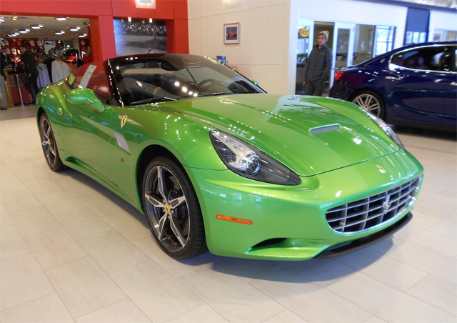 If you want to stand out, consider the 2013 Cal T Spider (custom green paint & green upholstery stitching) for sale at FNE (also on the FNE web site). Although many consider red as the primary Ferrari paint color (in part due to race history), other colors are becoming popular and, back in the 1960s, blue was the most common color for many production Ferraris, even for some custom ordered models, like the 500 Superfast. |