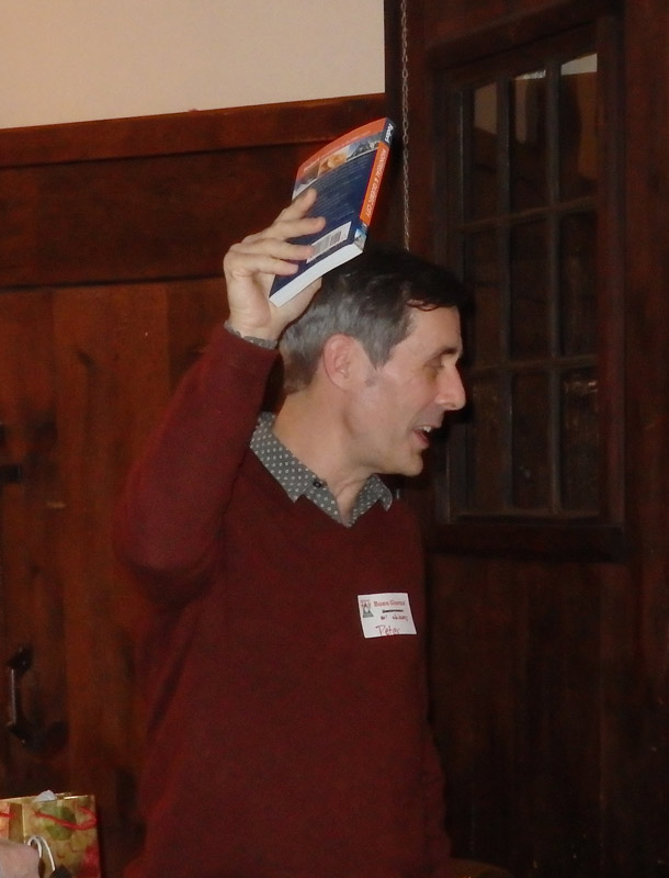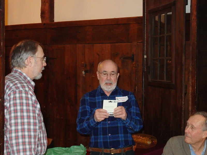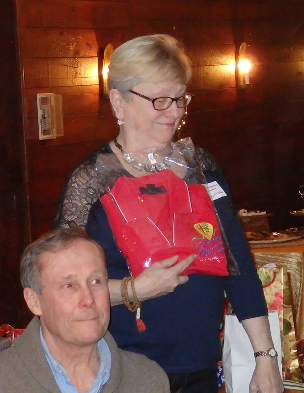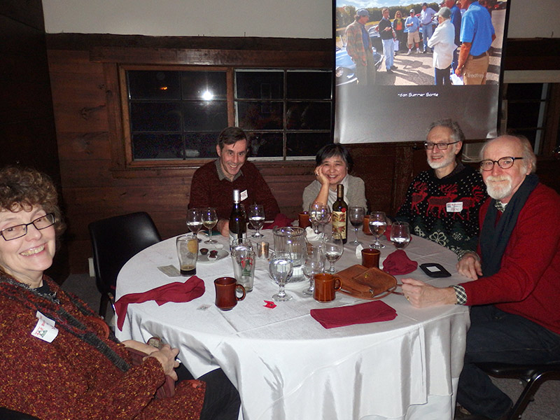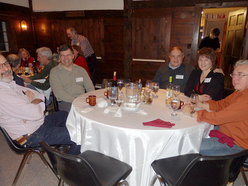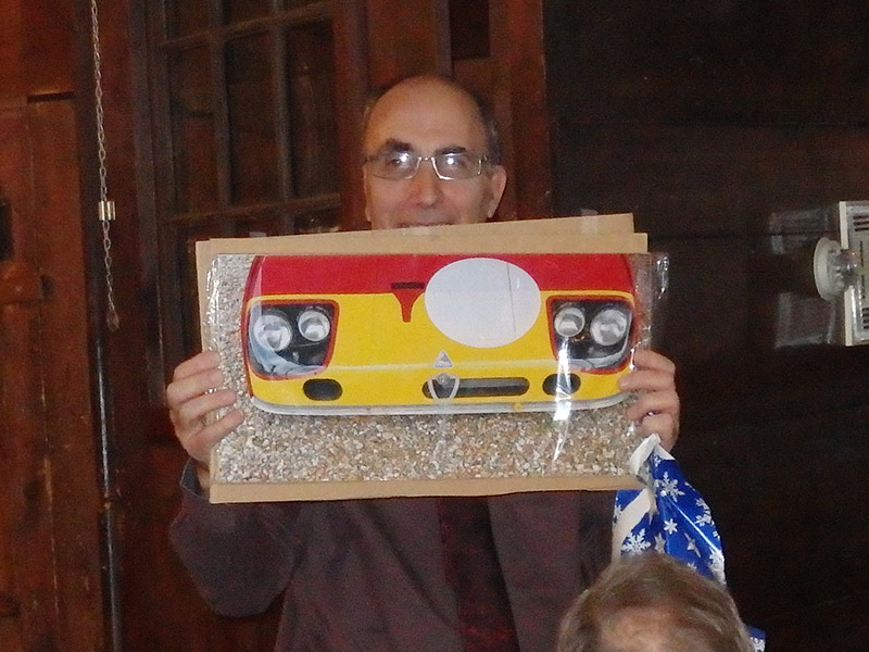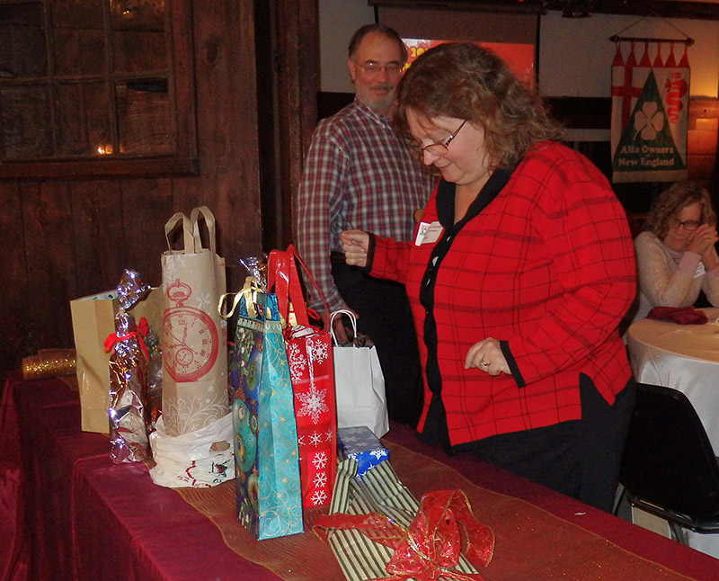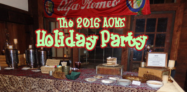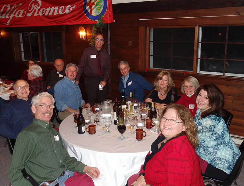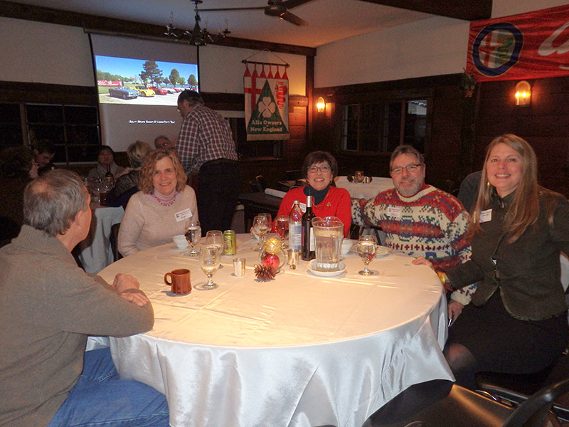 Text and photos by Dave Pratt Well, we did it again! Pulled off another one of our warm and fun annual AONE Holiday Parties at the Josiah Smith Tavern in Weston, MA, on Saturday, December 17th. Mother Nature threatened to make this one a little dicey, having dumped around five inches of snow in our area the very morning of our soiree. But rising temps and a change to rain (and eventually no precipitation at all) made travel easier than it could have been, and no one canceled due to the weather! The Town of Weston, though, completely ignored plowing out the Tavern. President Tom Lesko had to shovel out in front of the door, in order for the caterers (and us) to get in, and later Dan Donovan was spotted shoveling out the mouth of the driveway. (Wish I'd gotten a photo of that!) Only as we were leaving, over four hours later, did the town plow come through! But all was well once the three dozen of us were inside, where we were welcomed by the friendly and capable Tastings Caterers wait staff, who wandered among us offering their delectable hors d'oeuvres. The various beverages we'd brought were uncorked and uncapped, and we proceeded to enjoy the food, drink and each other's company. Besides the delights delivered to us on trays, there was a table set up with even more offerings in the appetizer department. Tom Lesko had also prepared a free-running slide presentation displaying photos from all of our AONE events of the past year, accompanied by some holiday background music. (In one of the slides from the Cape Crusade, Tom fittingly displayed my Lesser Car upside down.) When the main course was announced as ready for us to partake, we all grabbed plates and descended on the buffet. Our caterer again provided us with their excellent cuisine and didn't disappoint! We were all seated around five large tables, and it was easy to tell by watching and listening what a great time everyone was having. As promised, Tom did not wear his Alfa party shirt, and no one had to participate in our sing-along of corrupted Alfa-centric Xmas tunes that we've forced on you in previous years. In fact, only one person even mentioned it (Hi, Angela!), so it was surely not missed. Just as Gene Durso sat down with his dessert, a candle got stuck in it, became ignited, and the crowd belted out an impromptu 'Happy Birthday' in his honor. What better way to cap a birthday than at the AONE Holiday Party! (And at least we got to do a little singing.) Finally, the moment everyone was waiting for arrived — the start of the Yankee gift swap! It's always a ton of fun, and this year's was no exception. Interestingly, last year there were seven bottles of Limoncello, but this year there was none! Still, a lot of nice bottles of wine (and other fluids) traded hands, as well as many other neat gifts. If you look through the photos, you'll get an idea of the variety of interesting items that found new homes. Our thanks go once again to Tom Lesko for making all the arrangements for our always eagerly-anticipated annual Holiday Party. Great food, venue, people ... and hence a great event! |