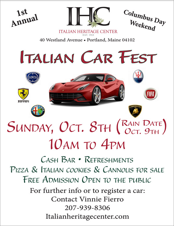 Another Alfa event in Maine! AONE member Vinnie Fierro is associated with Portland's Italian Heritage Center, and they're hosting an Italian Car Fest on Columbus Day weekend (Sunday, October 8th with a rain date of October 9th). It will be open to all six Italian marques and they'd love to have a good turnout from our club. Maine is a beautiful state anytime but is perhaps at its best in the Fall. They're working on getting special rates at area hotels for those who'd like to stick around and enjoy all that Portland has to offer. The Old Port is a neat waterfront area and there are tons of great restaurants around. Time for a road trip!