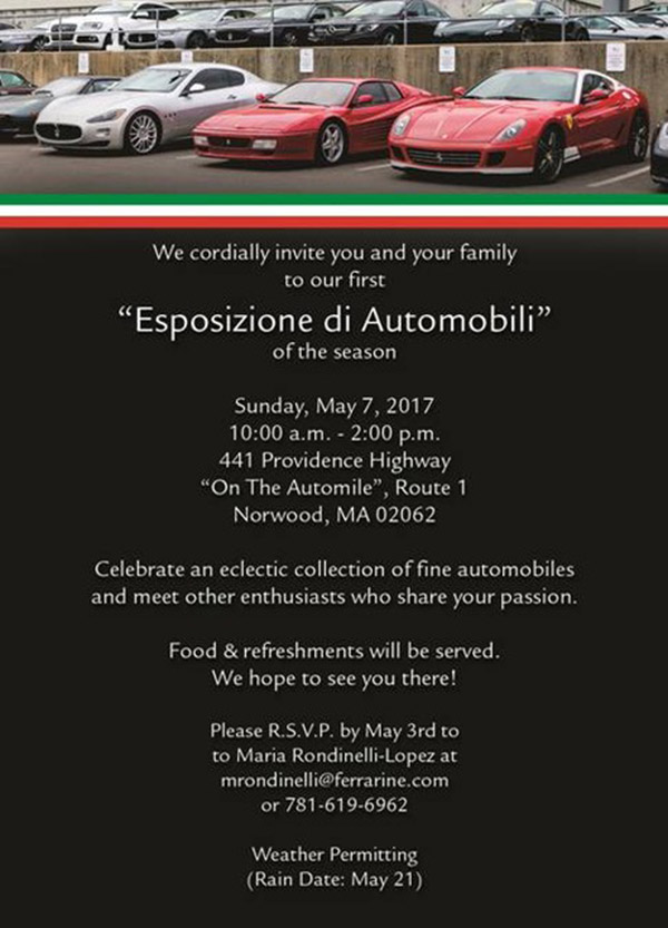 FErrari of New England (FNE) in Norwood, MA, has invited all AONE members to join them for their 2017 Open House and Car Show on May 21st. This will be a great chance to see many new and used Ferrari and Maserati models on display. And they'll be providing us with coffee and pastries! Bring your Alfa — that way, we'll dress up their parking lot! Especially you new Giulia and 4C guys — for sure, those Ferrari types will like to see what they're missing. Last year, around 30 AONErs attended and had a great time! Please contact Tom Ducibella at tom@nanduce.com or 978-921-0125 if you plan to attend by 9pm, Thursday, May 18th, so that he can let FNE know how much pastry to get. Come on out and rub shoulders with our big cousins!